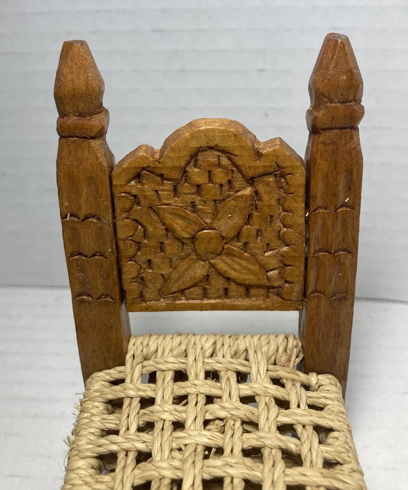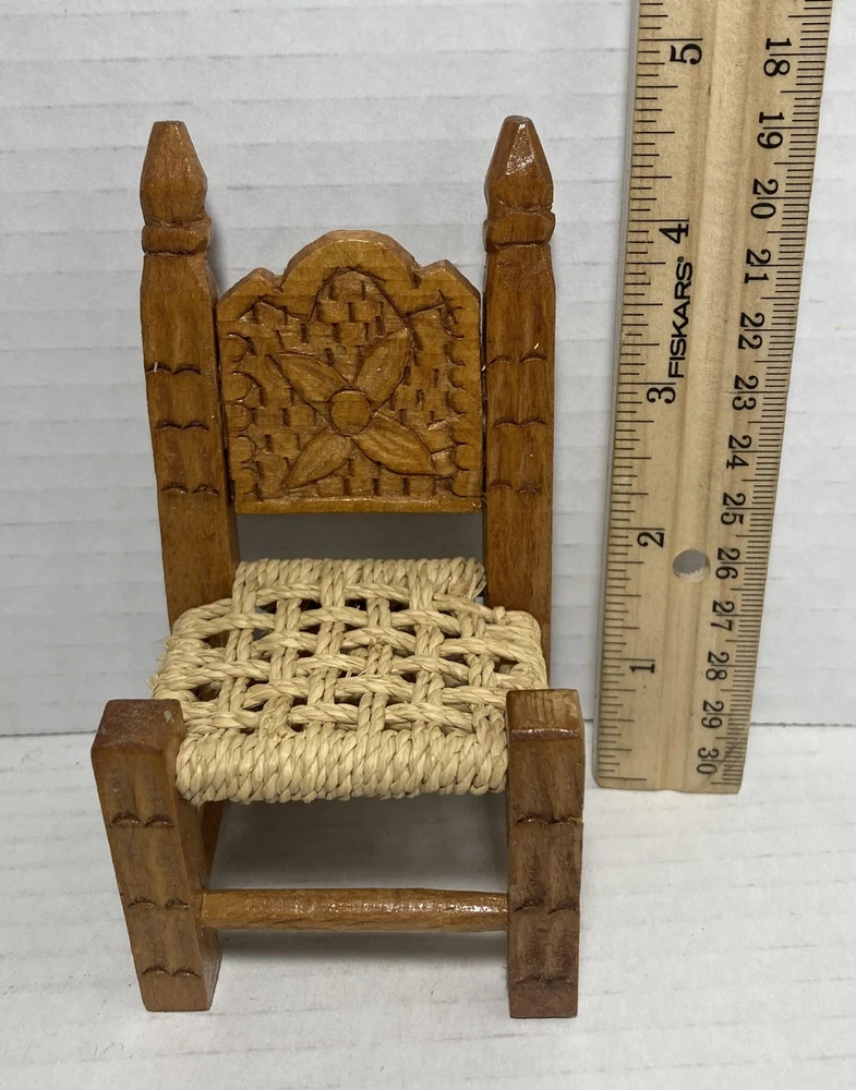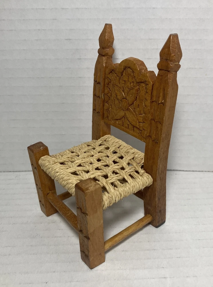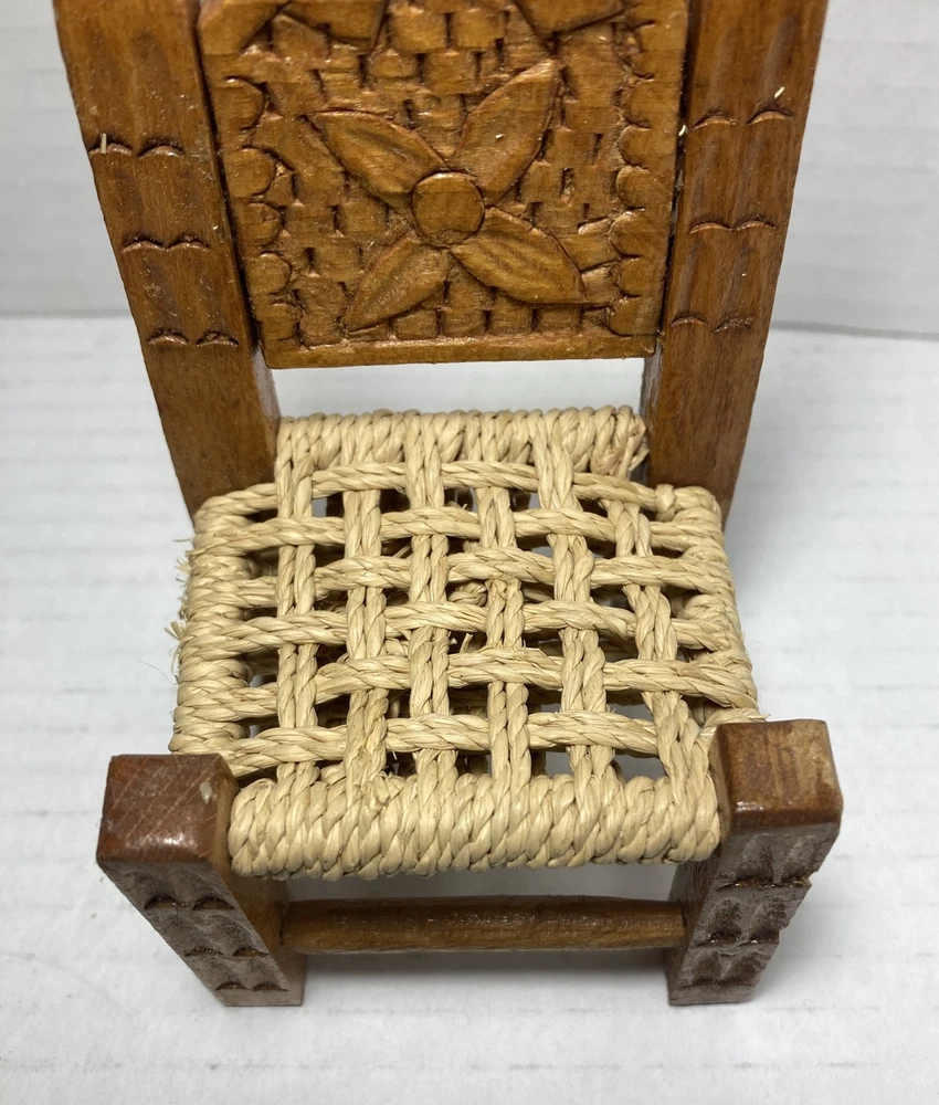 Vintage Small Doll Chair Hand Made Carved Wood With Jute Seat 4-3/4” Tall