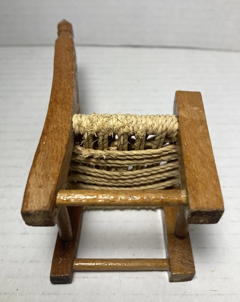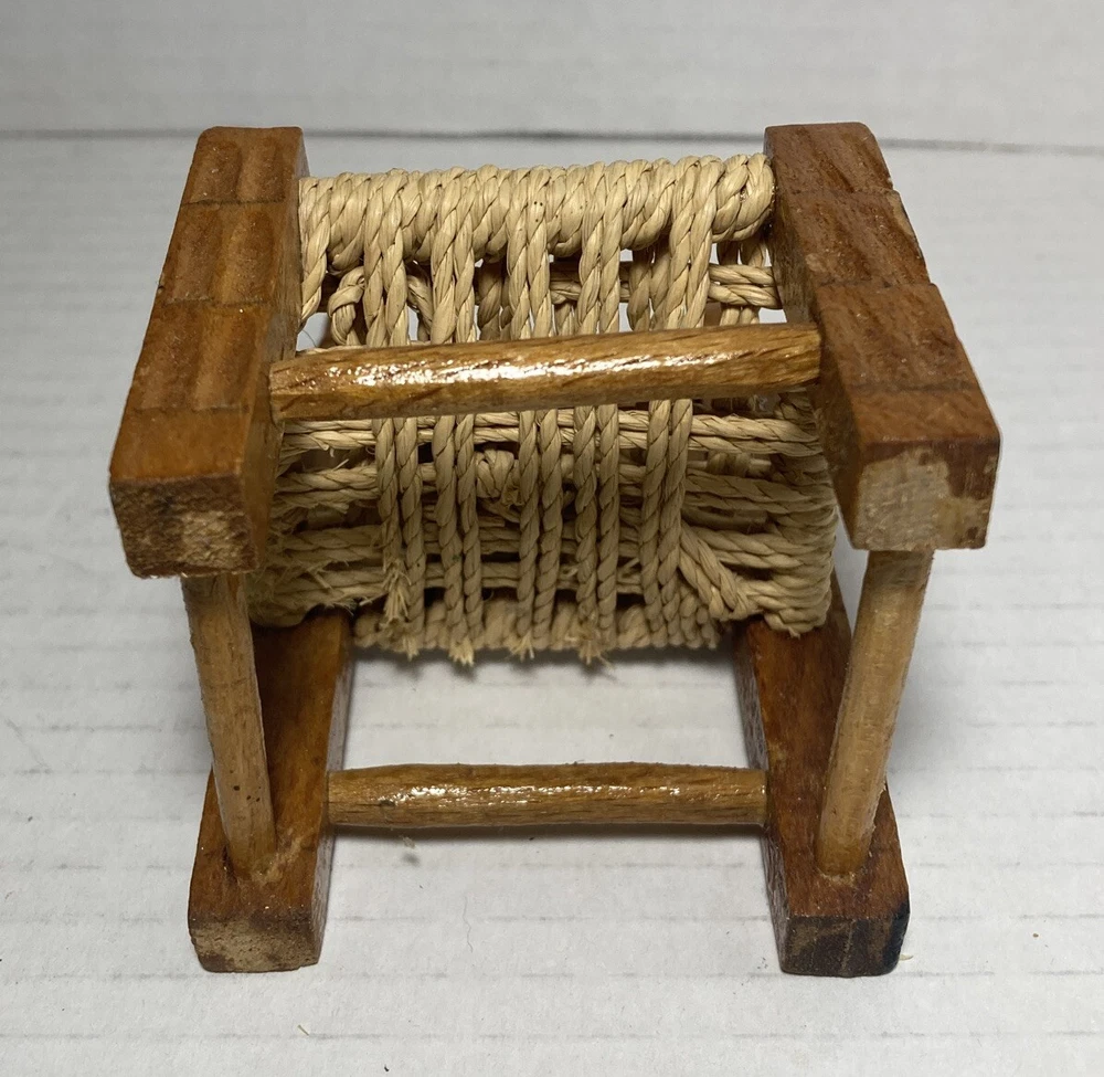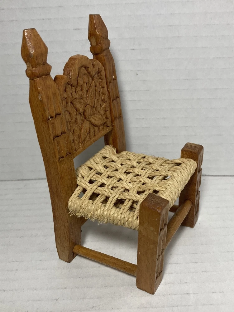 This vintage small doll chair is a unique piece of furniture that is perfect for doll collectors. It is hand made and carved out of wood, with a jute seat that adds to its antique style. The chair is of brown colour, 4 3/4 inches in height and is an original piece, not a reproduction. The chair's style and material make it a great addition for any dollhouse or furniture collection. This is a vintage piece that is in overall good shape. It has some minor wear on the jute string seat. This chair is a must-have for antique enthusiasts and collectors who appreciate handcrafted items. The item will ship out safely and securely the same or next business day.