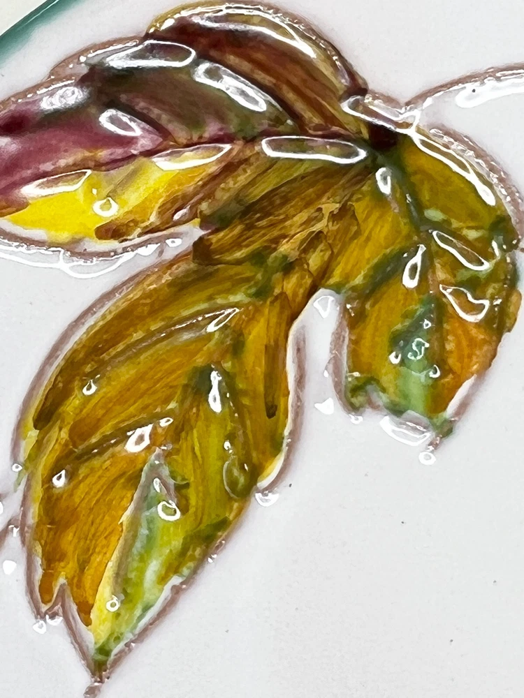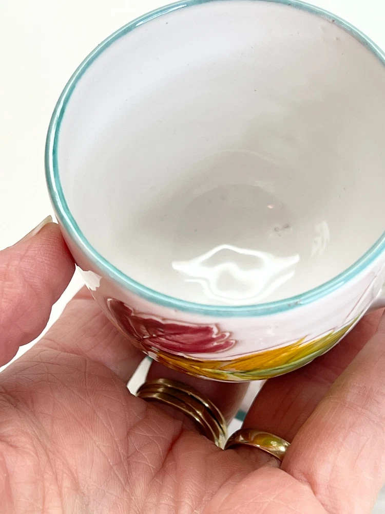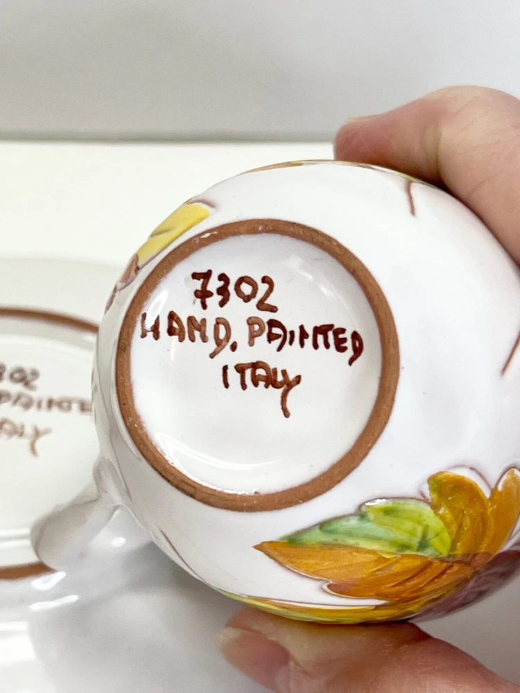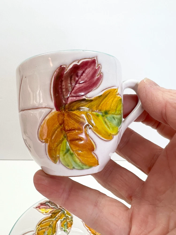 Vintage Small Teacup Hand-painted With Autumn Colors From Italy Leaf Design. A couple of spots where it is missing glaze but no chips or cracks , please check the photos . It is a beautiful little cup and saucer set