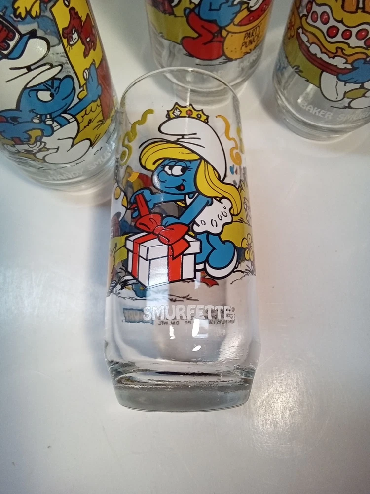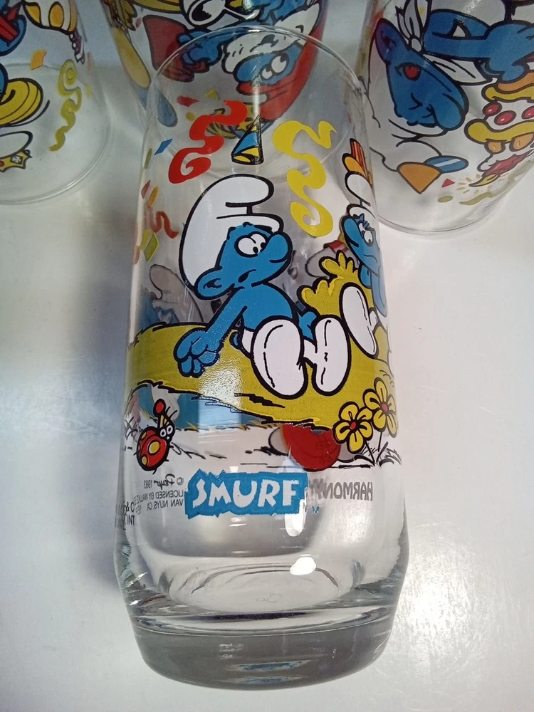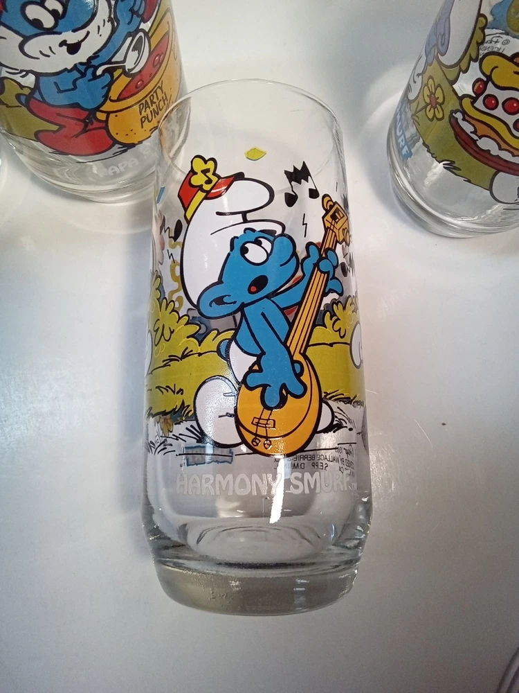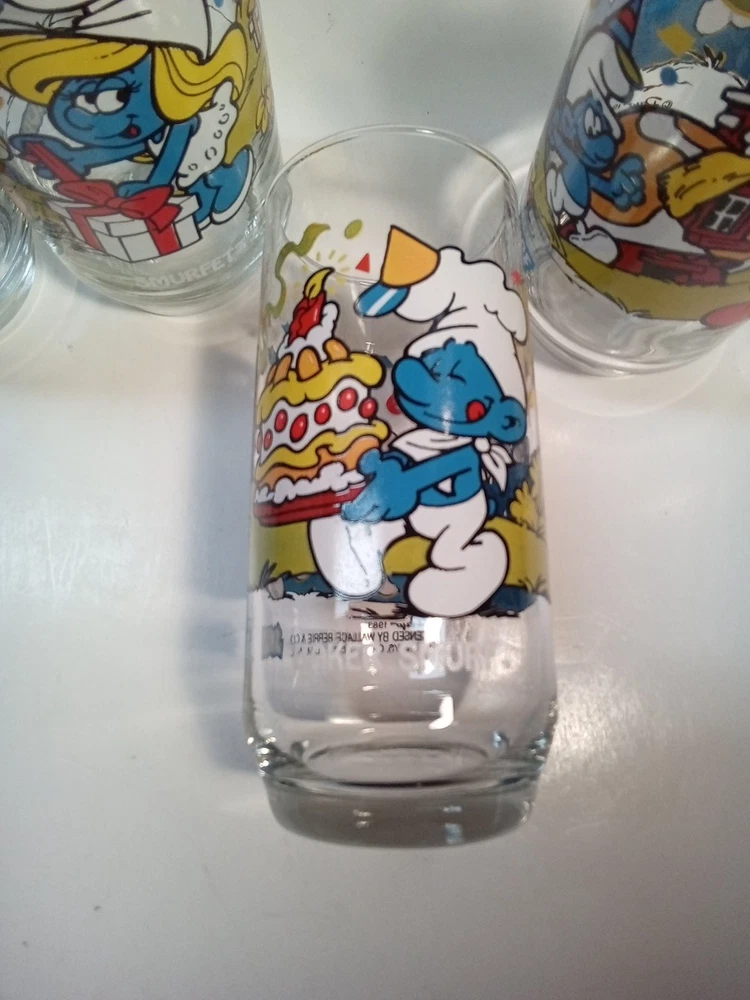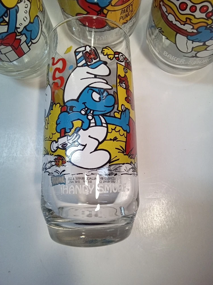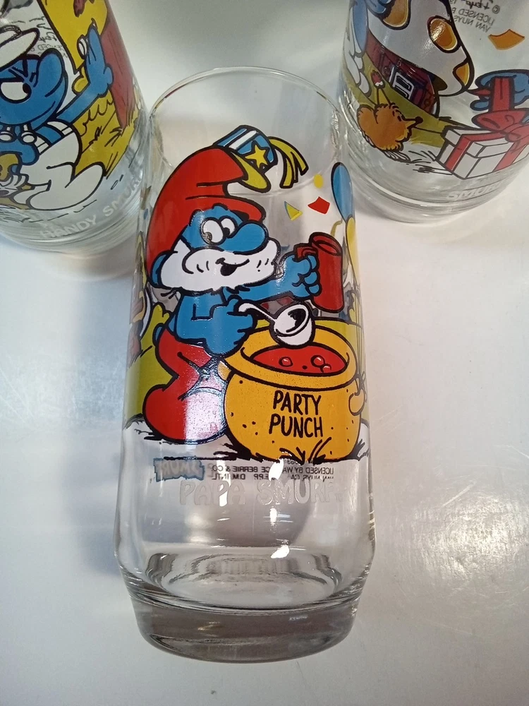 Capture the whimsical charm of the beloved Smurfs with this vintage collector glasses set from Wallace Berrie and PEYO, dated 1983. Each glass in this lot of five features a different Cartoon Character from the classic TV show, "the Smurfs," bringing a touch of nostalgia to your collection or table setting. Papa Smurf (1983), Smurfette (1983), Handy (1983), Baker (1983), and Harmony (1983) are the Smurf characters on this set of glasses. With bright, multicolor designs, these character glasses measure 6 inches in height and 2-3/4 inches in width, perfect for display or use. They are the iconic Peyo brand, associated with quality and collectability. Ideal for fans of the franchise or collectors of cartoon and TV character memorabilia. All 5 glasses are in good used condition with no chips or cracks. See photos for details.