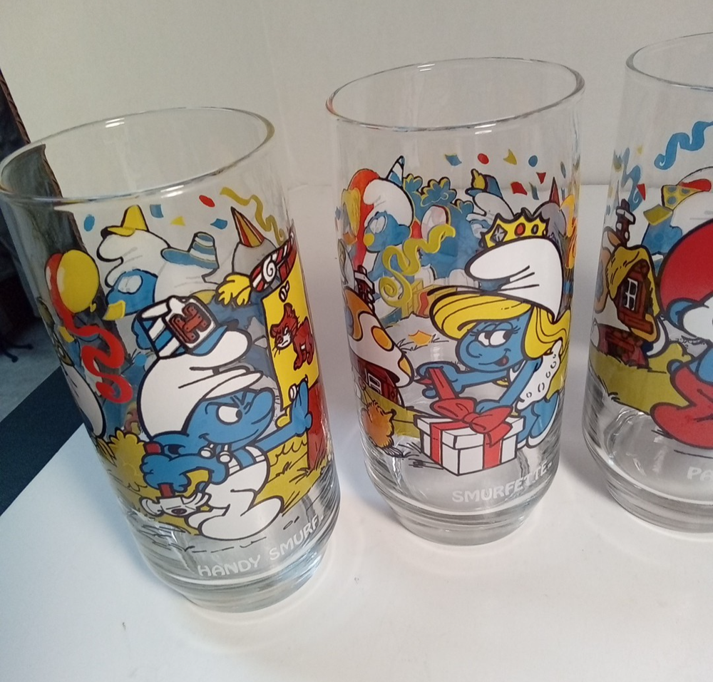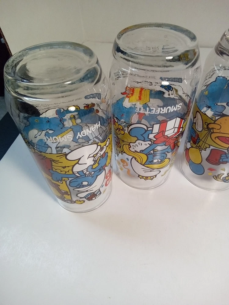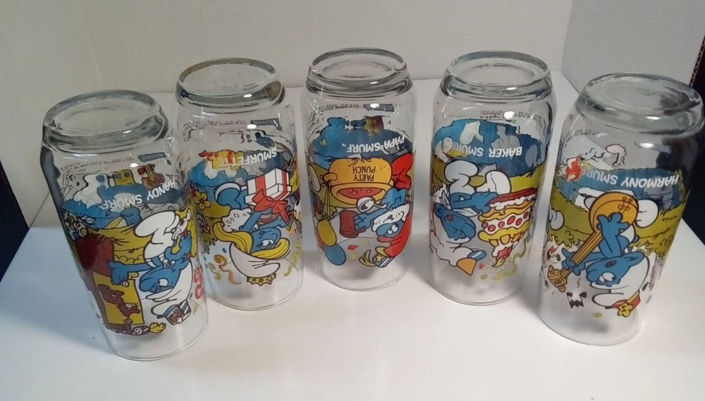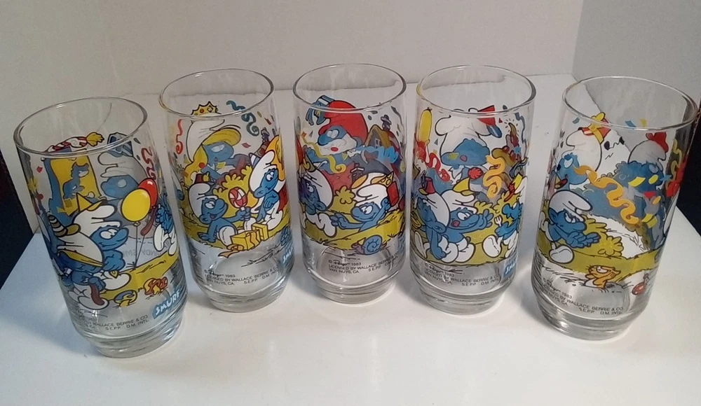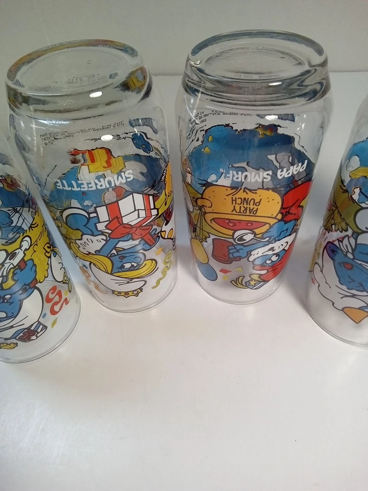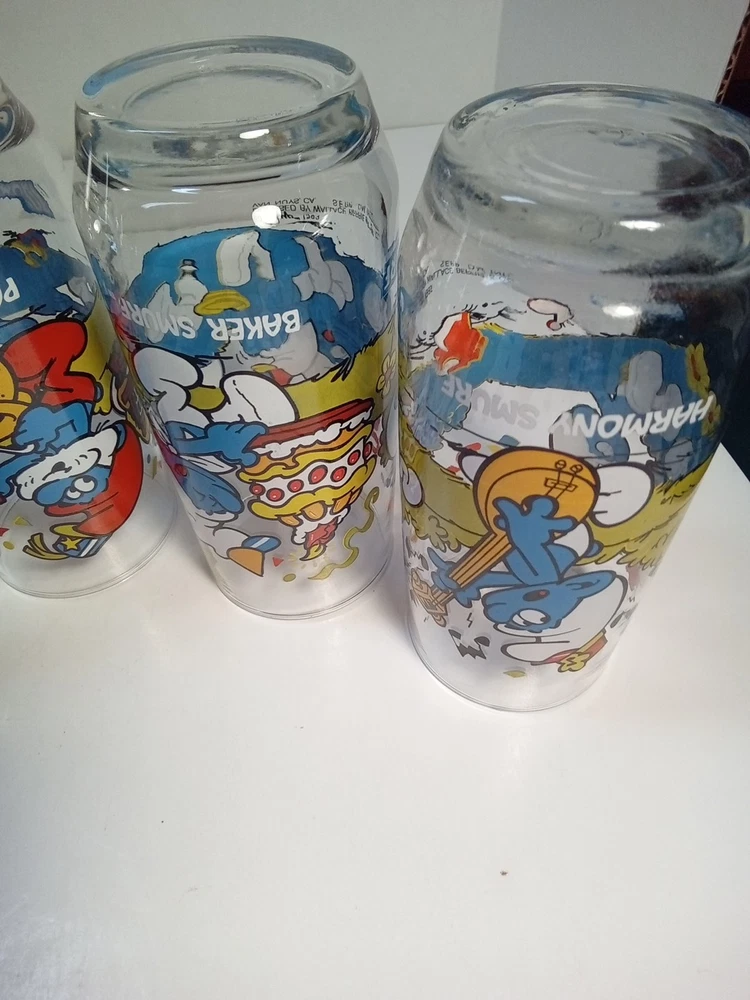 Capture the whimsical charm of the beloved Smurfs with this vintage collector glasses set from Wallace Berrie and PEYO, dated 1983. Each glass in this lot of five features a different Cartoon Character from the classic TV show, "the Smurfs," bringing a touch of nostalgia to your collection or table setting. Papa Smurf (1983), Smurfette (1983), Handy (1983), Baker (1983), and Harmony (1983) are the Smurf characters on this set of glasses. With bright, multicolor designs, these character glasses measure 6 inches in height and 2-3/4 inches in width, perfect for display or use. They are the iconic Peyo brand, associated with quality and collectability. Ideal for fans of the franchise or collectors of cartoon and TV character memorabilia. All 5 glasses are in good used condition with no chips or cracks. See photos for details.
