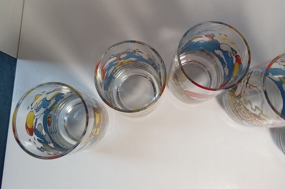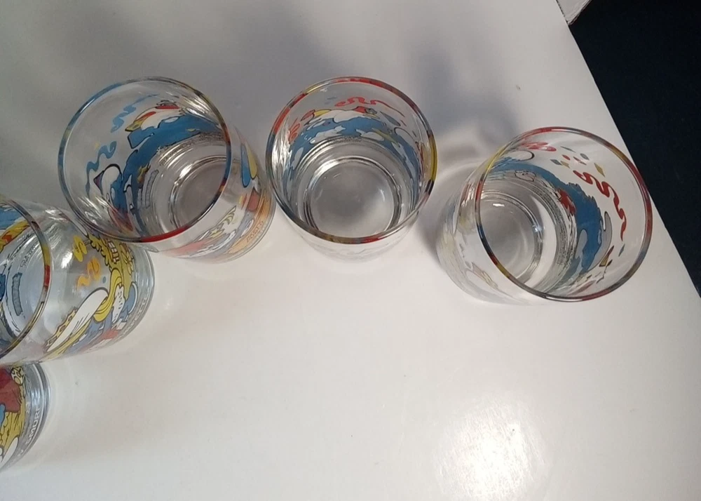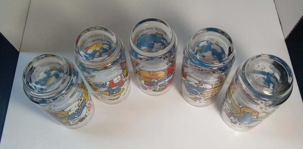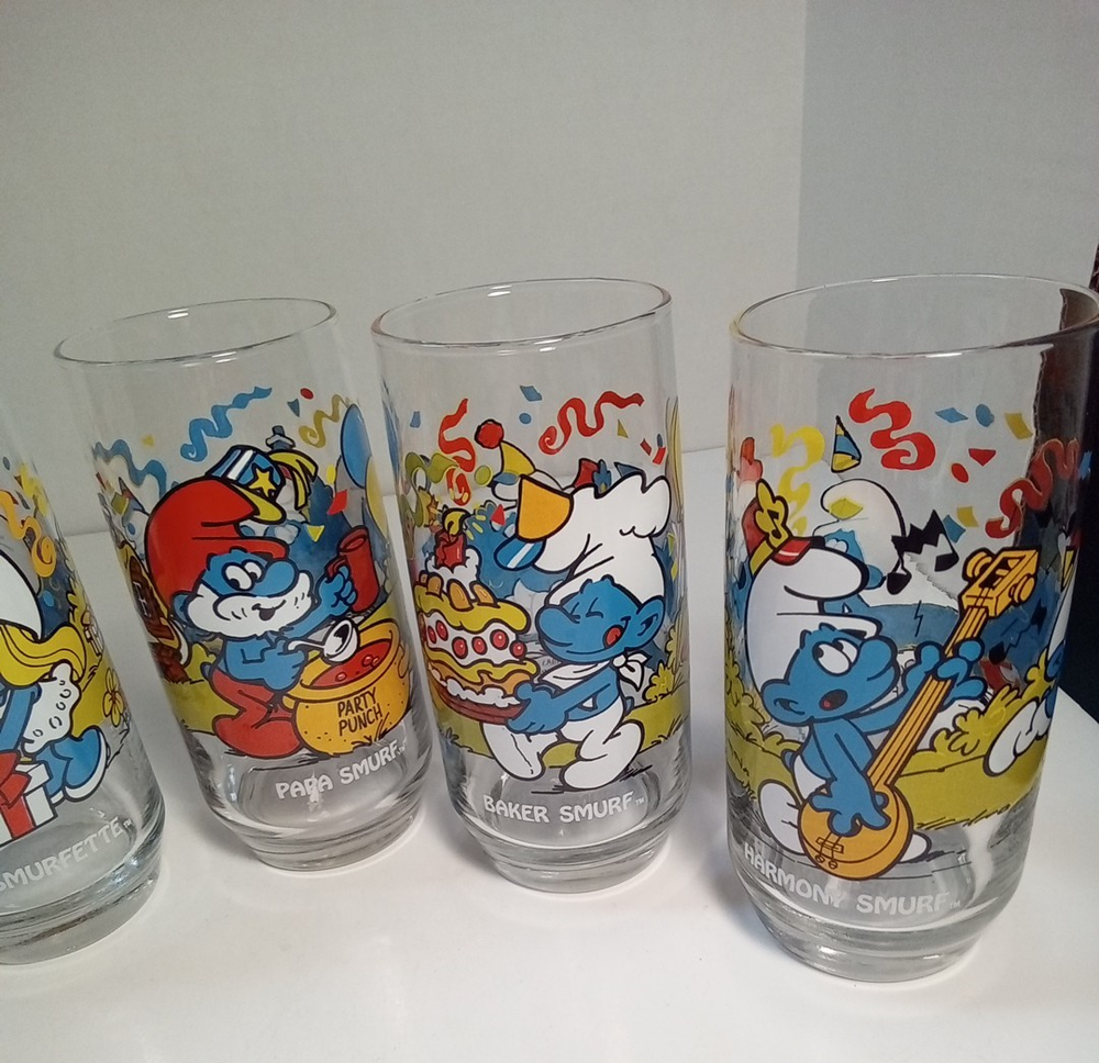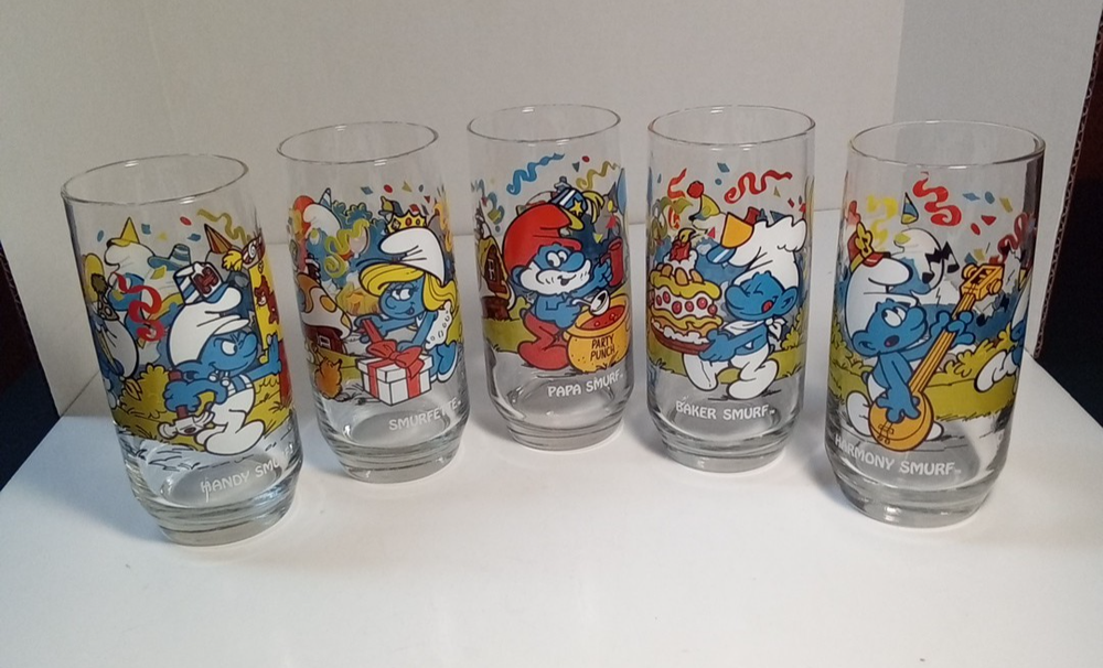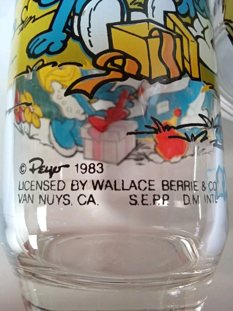 Capture the whimsical charm of the beloved Smurfs with this vintage collector glasses set from Wallace Berrie and PEYO, dated 1983. Each glass in this lot of five features a different Cartoon Character from the classic TV show, "the Smurfs," bringing a touch of nostalgia to your collection or table setting. Papa Smurf (1983), Smurfette (1983), Handy (1983), Baker (1983), and Harmony (1983) are the Smurf characters on this set of glasses. With bright, multicolor designs, these character glasses measure 6 inches in height and 2-3/4 inches in width, perfect for display or use. They are the iconic Peyo brand, associated with quality and collectability. Ideal for fans of the franchise or collectors of cartoon and TV character memorabilia. All 5 glasses are in good used condition with no chips or cracks. See photos for details.