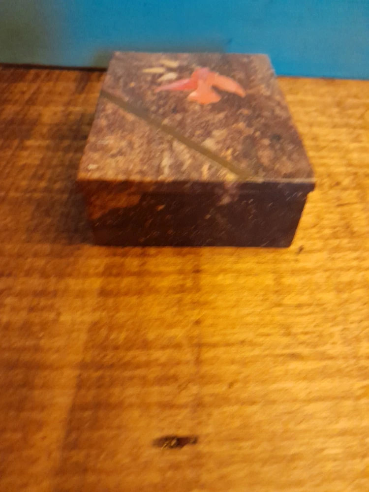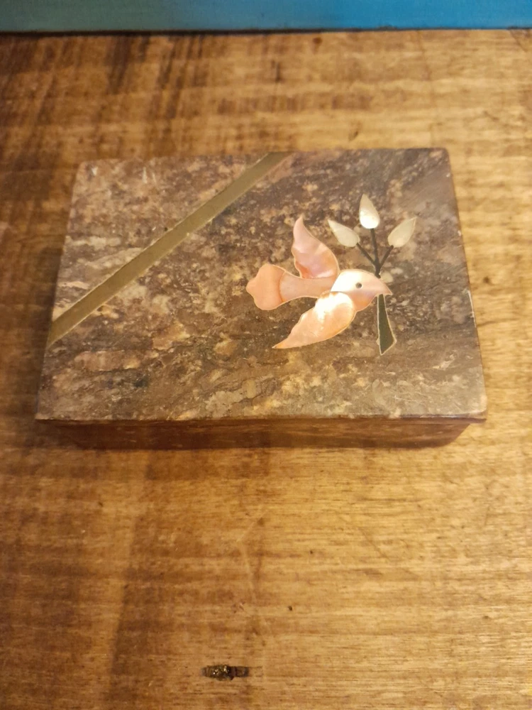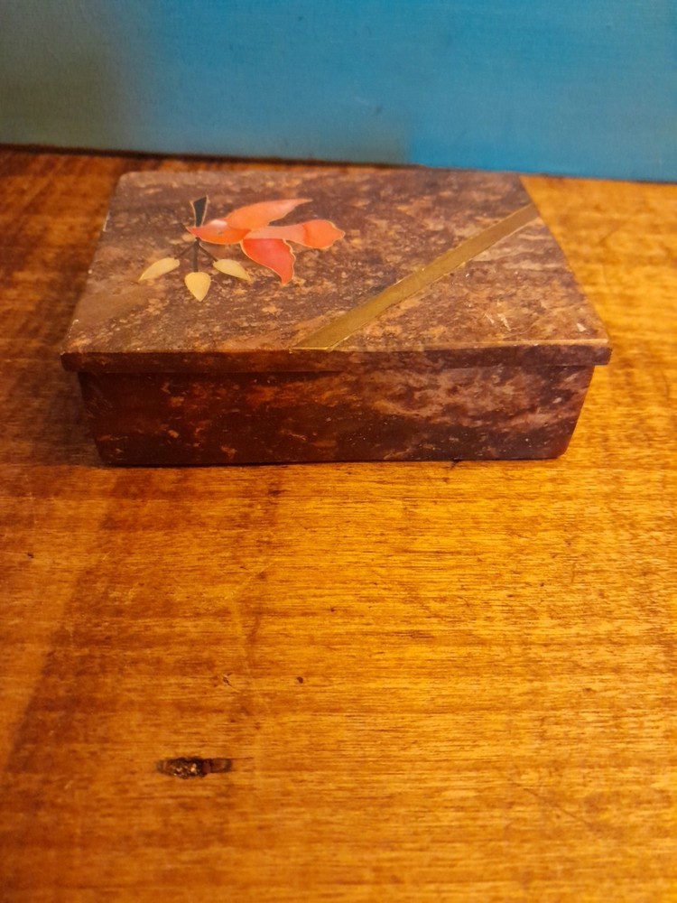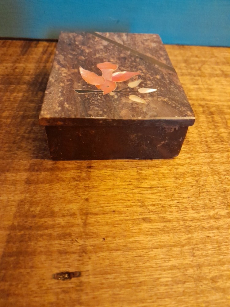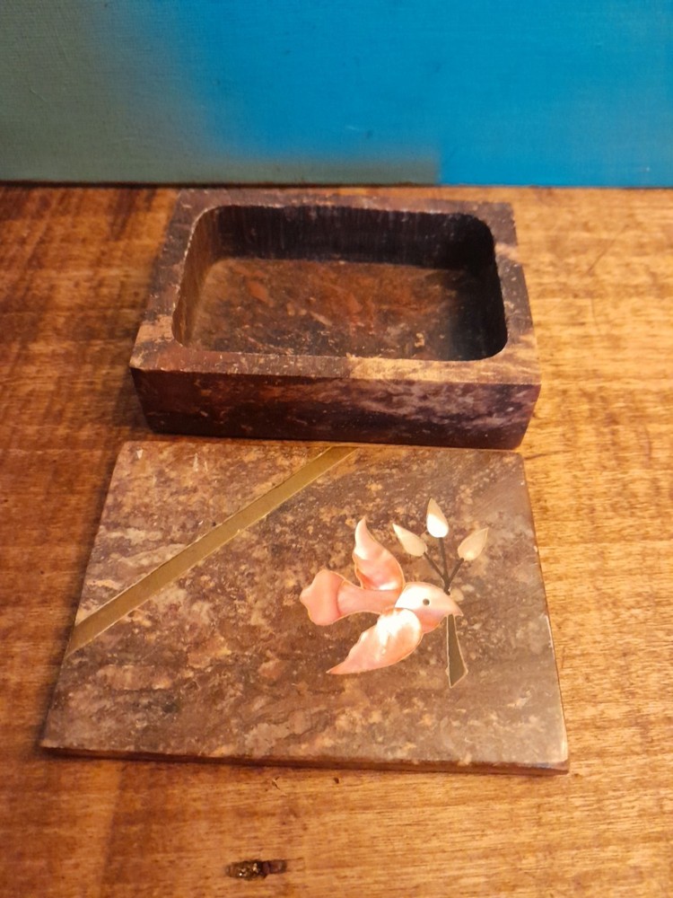 This vintage soapstone trinket/jewelry box features a beautiful mother of pearl bird and flower inlay, adding a touch of elegance to any collection. Handmade in India, this small rectangular box measures 4 inches in length and 3 inches in width, making it perfect for storing small trinkets or jewelry. With a brown color and intricate flower pattern, this original piece is ideal for all occasions and can be enjoyed by teens, adults, and kids alike. In very good condition no chips or dings please see pictures for part of description and measurements any questions please ask thank you