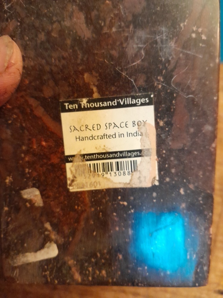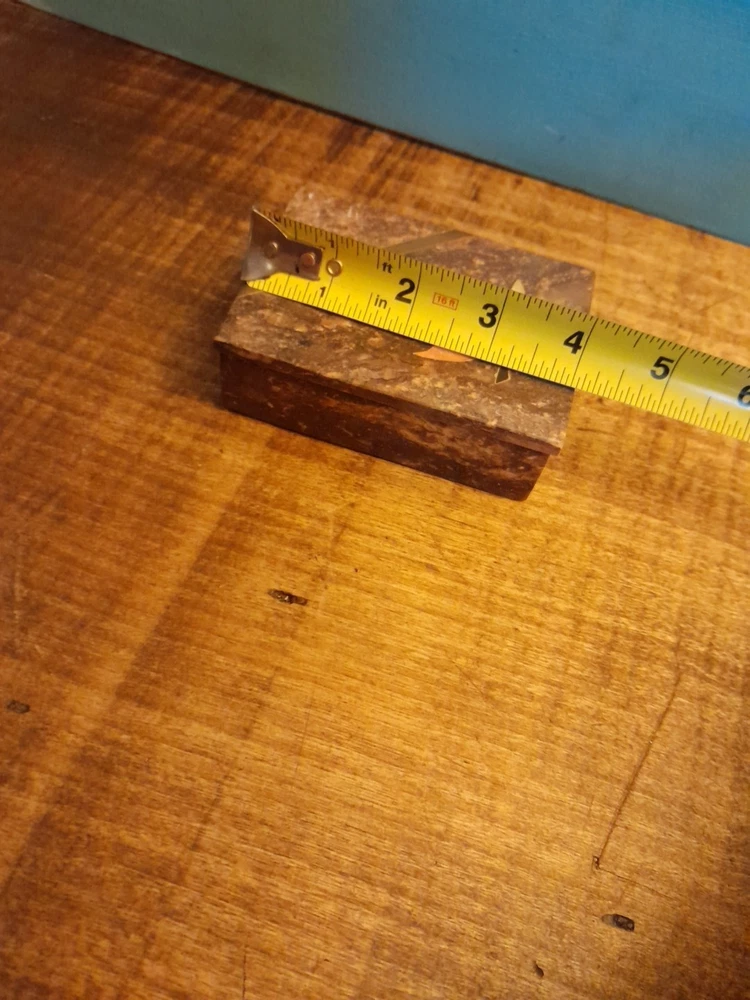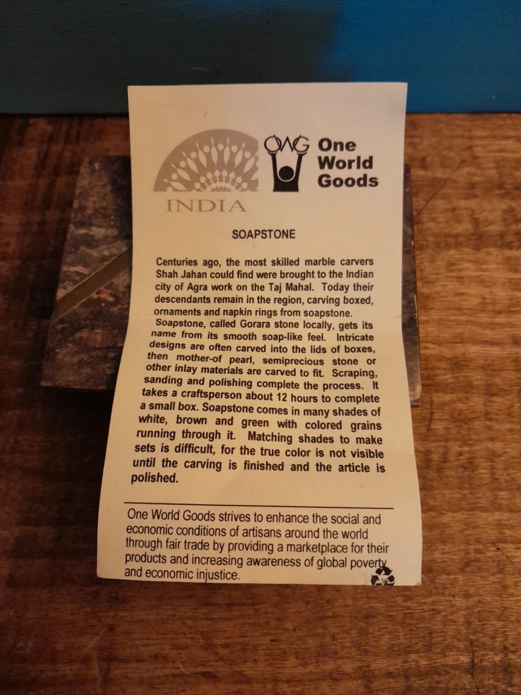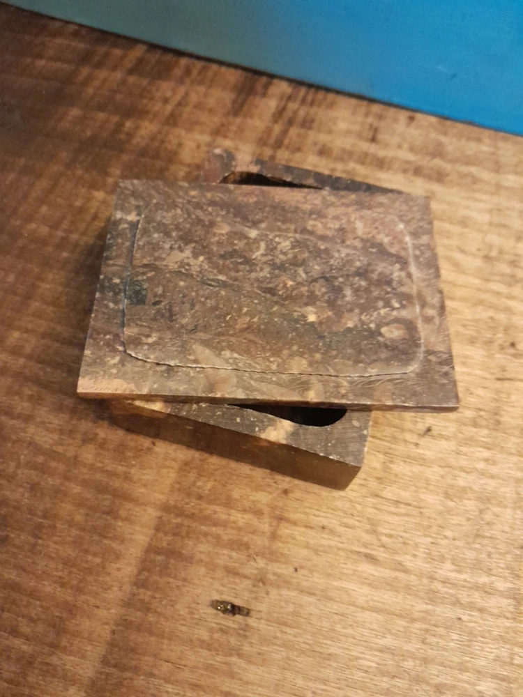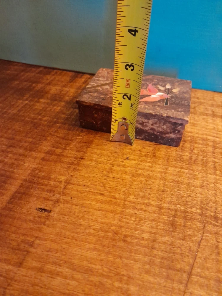 This vintage soapstone trinket/jewelry box features a beautiful mother of pearl bird and flower inlay, adding a touch of elegance to any collection. Handmade in India, this small rectangular box measures 4 inches in length and 3 inches in width, making it perfect for storing small trinkets or jewelry. With a brown color and intricate flower pattern, this original piece is ideal for all occasions and can be enjoyed by teens, adults, and kids alike. In very good condition no chips or dings please see pictures for part of description and measurements any questions please ask thank you