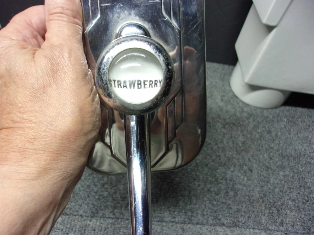Vintage Soda Fountain Porcelain Ice Cream Topping Syrup Pump Dispenser In good condition, some scratches heavy, small chip on edge near top see photo Tested and pump works Knob is marked STRAWBERRY Measures about 7 inches by 4 1/2 inches by 10 inches tall 14 inches to top of pump May use FEDEX so no PO boxes