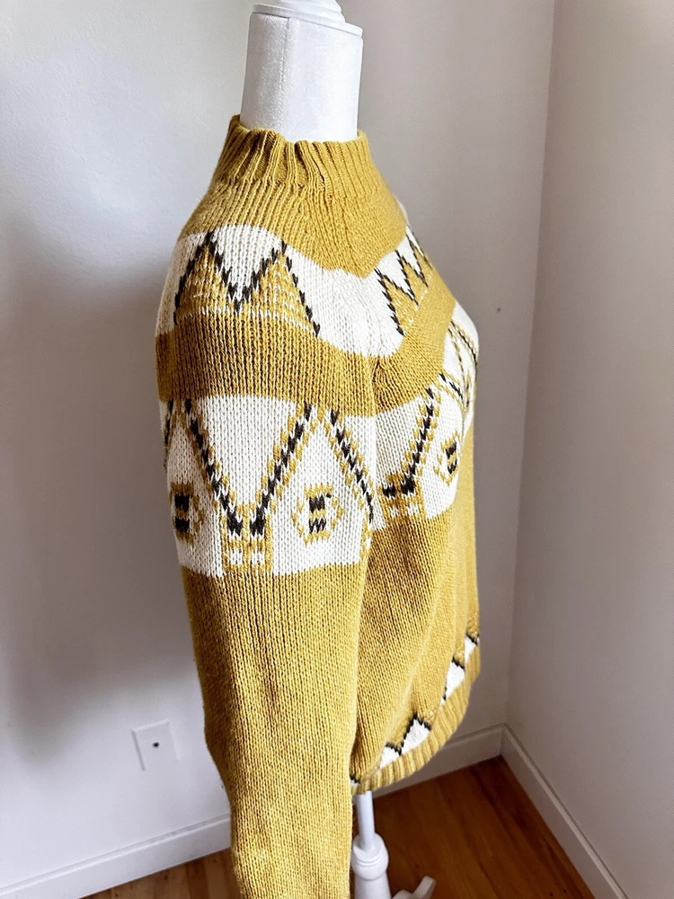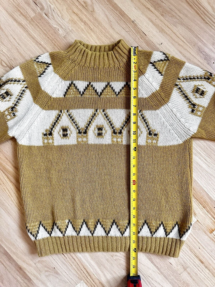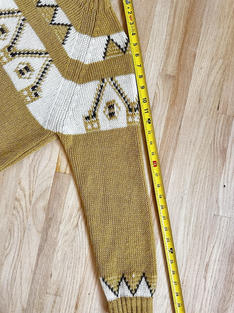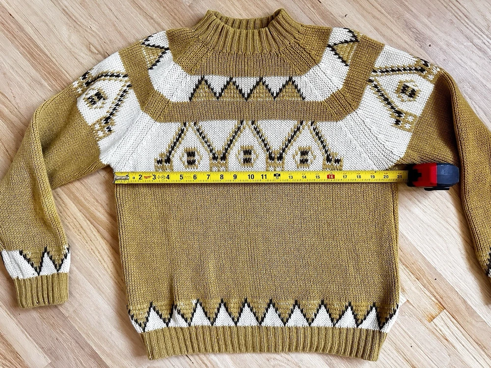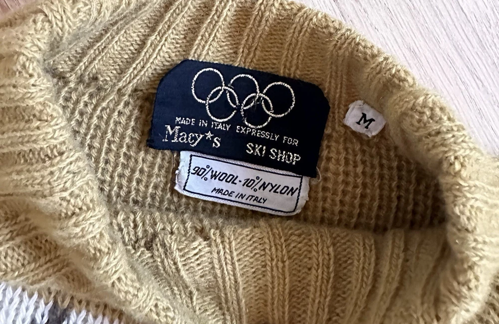 Classic, timeless 1960’s 1970s vintage Macy's Ski Shop Sweater. Wool & acrylic blend, this sweater is mustard yellow, beige & brown. Tribute to the winter Olympics in Italy. This sweater is versatile for both women and men. This sweater is soft and in excellent condition for its age. On one sleeve, two loops of mustard/yellow thread is missing. Approx 1/4” x 1/8” See photos. Measurements laying flat: Pit to pit: 20” Neck to hem: 24” Neck to end of sleeve: 33” Rare, great condition,