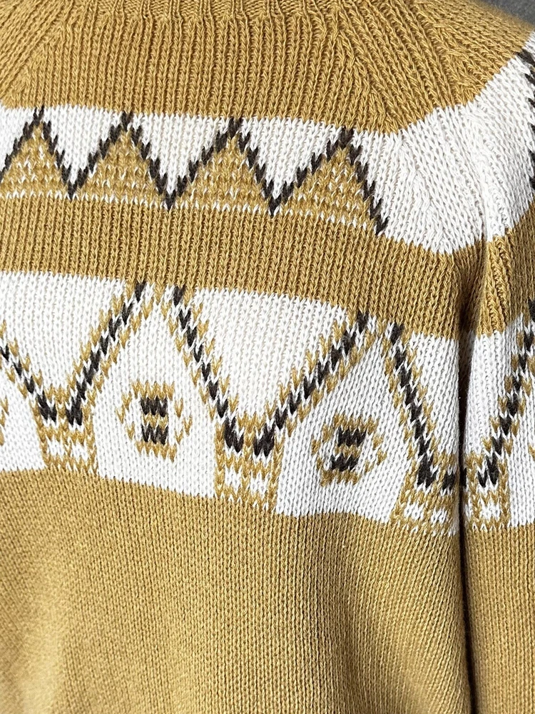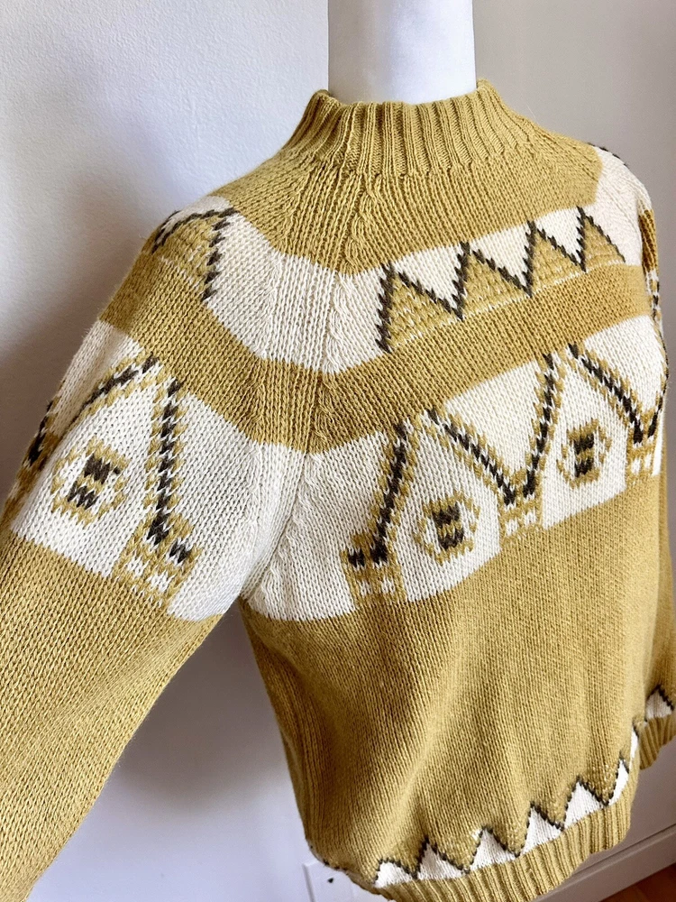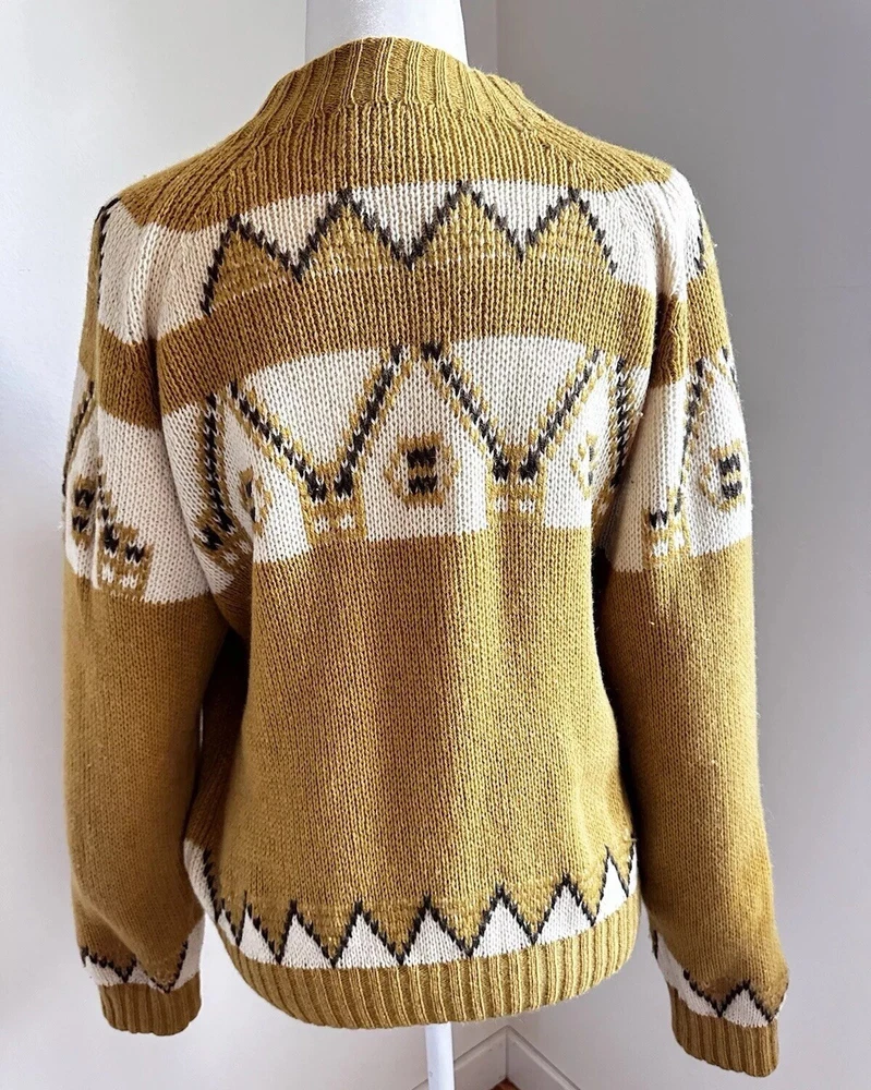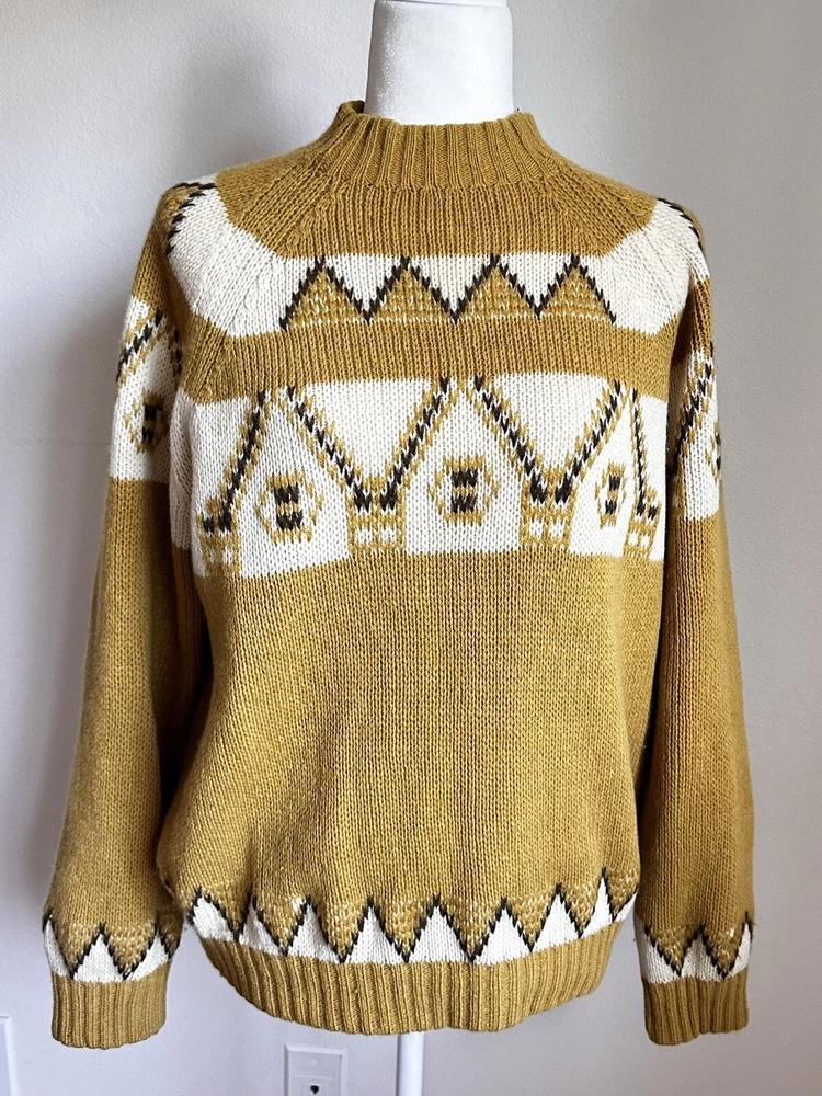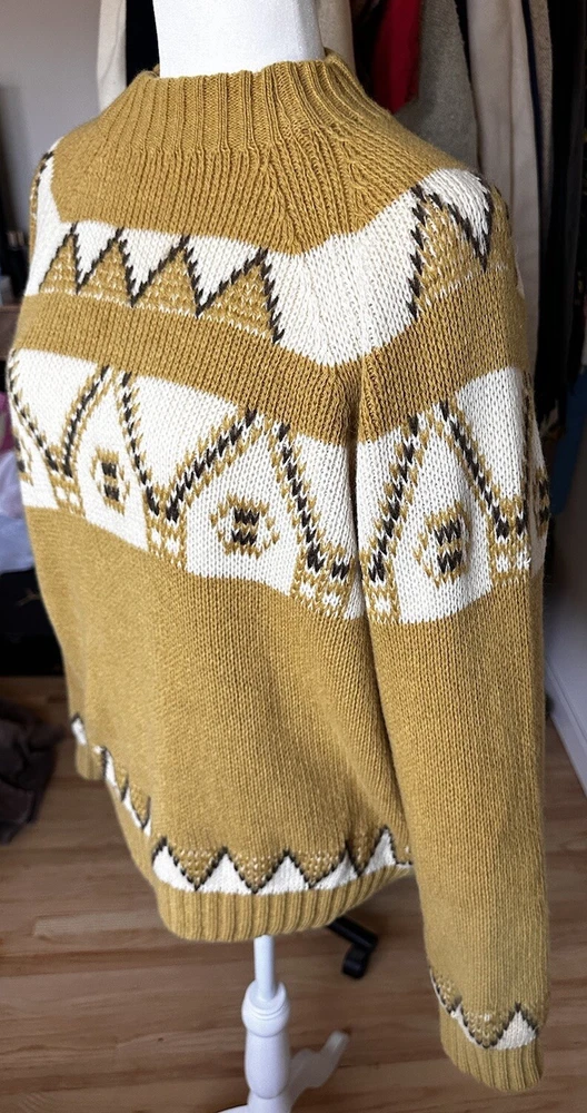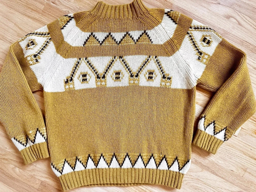 Classic, timeless 1960’s 1970s vintage Macy's Ski Shop Sweater. Wool & acrylic blend, this sweater is mustard yellow, beige & brown. Tribute to the winter Olympics in Italy. This sweater is versatile for both women and men. This sweater is soft and in excellent condition for its age. On one sleeve, two loops of mustard/yellow thread is missing. Approx 1/4” x 1/8” See photos. Measurements laying flat: Pit to pit: 20” Neck to hem: 24” Neck to end of sleeve: 33” Rare, great condition,