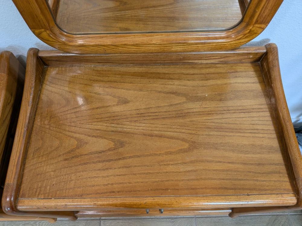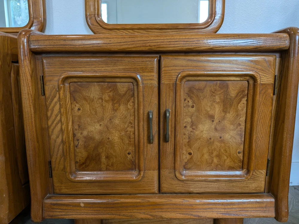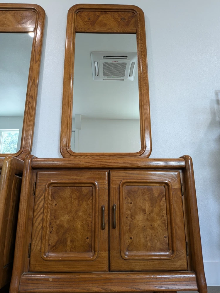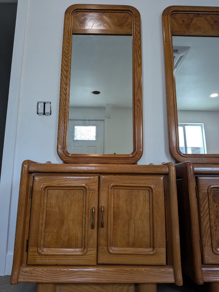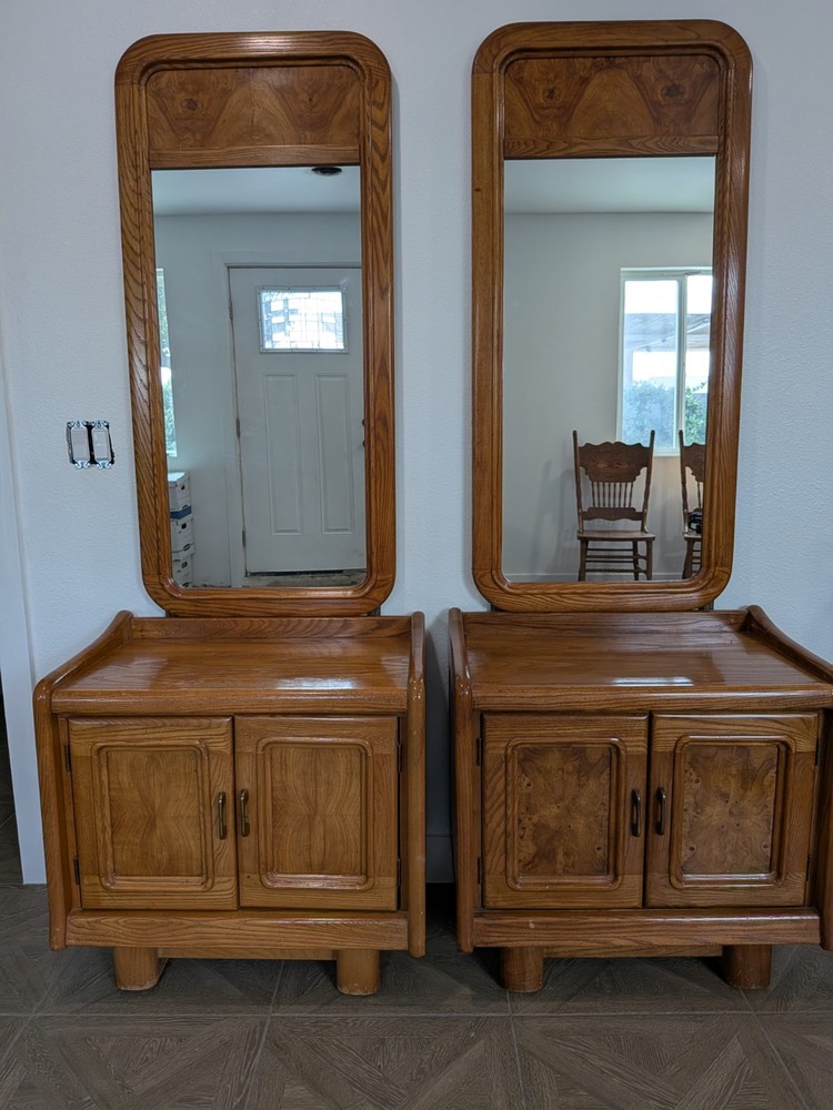Approximately 75 inches tall from the bottom of the nightstand to the top. And 27 1/2 inches wide The product is a set of two vintage solid wood matching vanities with mirrors. These nightstands are designed in a retro style, measuring 75 inches in height, 17 inches in length, and 27 inches in width. Made from solid wood, they feature mirrored tabletops and solid wood handles, making them a unique and rare addition to any bedroom. The set of vanities adds a touch of elegance and vintage charm to the room while providing functional storage space.