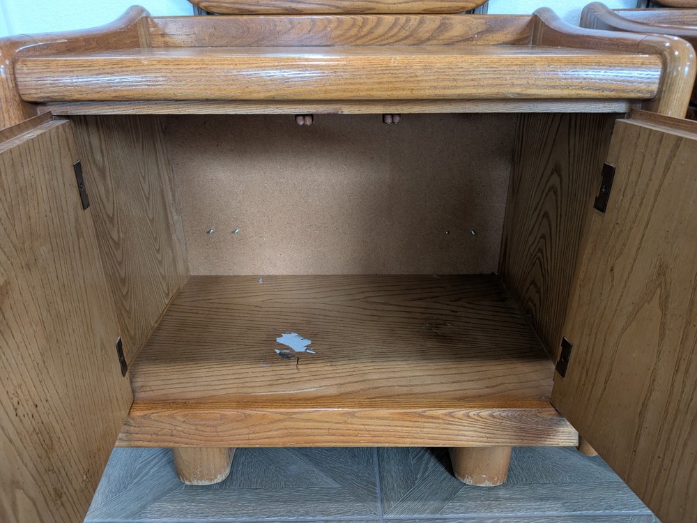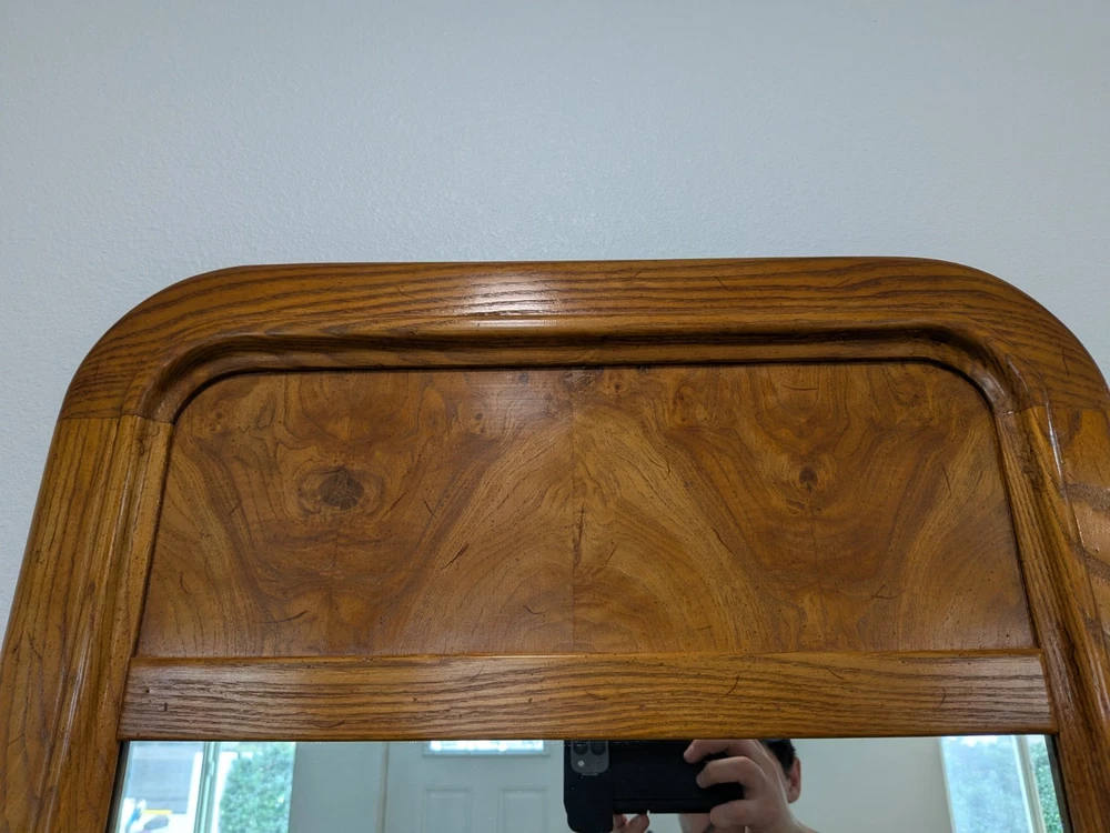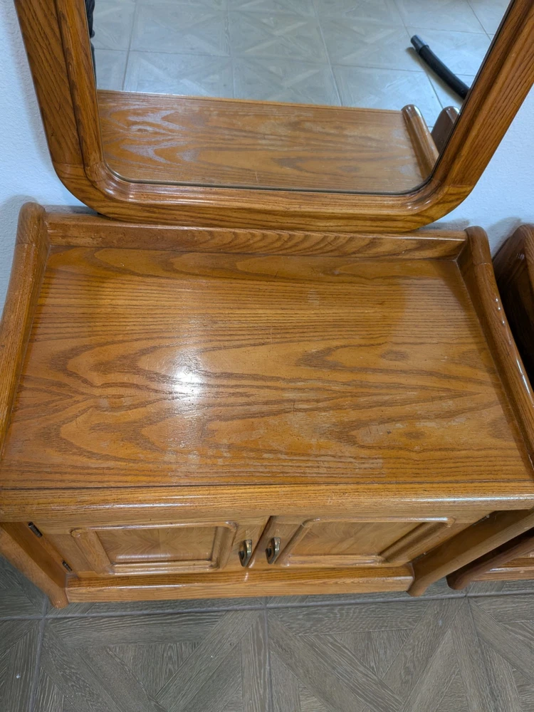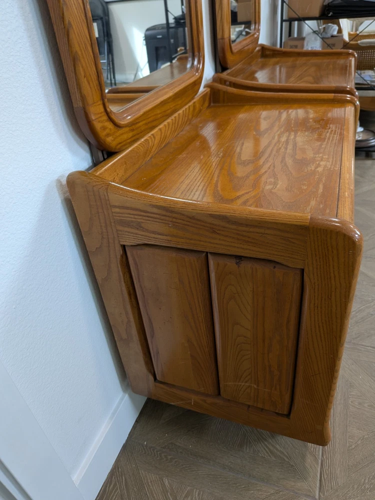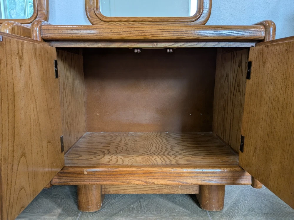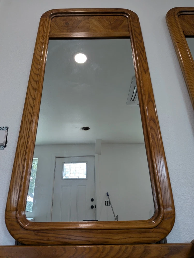 Approximately 75 inches tall from the bottom of the nightstand to the top. And 27 1/2 inches wide The product is a set of two vintage solid wood matching vanities with mirrors. These nightstands are designed in a retro style, measuring 75 inches in height, 17 inches in length, and 27 inches in width. Made from solid wood, they feature mirrored tabletops and solid wood handles, making them a unique and rare addition to any bedroom. The set of vanities adds a touch of elegance and vintage charm to the room while providing functional storage space.