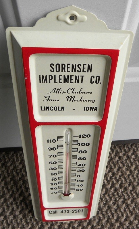 This is a vintage advertising metal thermometer from - Sorensen Implement Co., Allis-Chalmers Farm Machinery, Lincoln, Iowa. It measures about 3 5/8" x 13 1/4". It is in very good condition and works good. It appears to have never been used. Buyer pays Shipping & Handling Items shipped: from same day - to 3 days maximum SATISFACTION GUARANTEED or MONEY BACK Save on shipping by combining with our other eBay store items or auctions ~Iowans please pay 7% Iowa State Sales Tax~ Thank You for Looking at Our Items Please email us with any questions