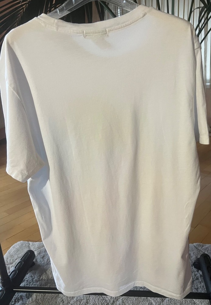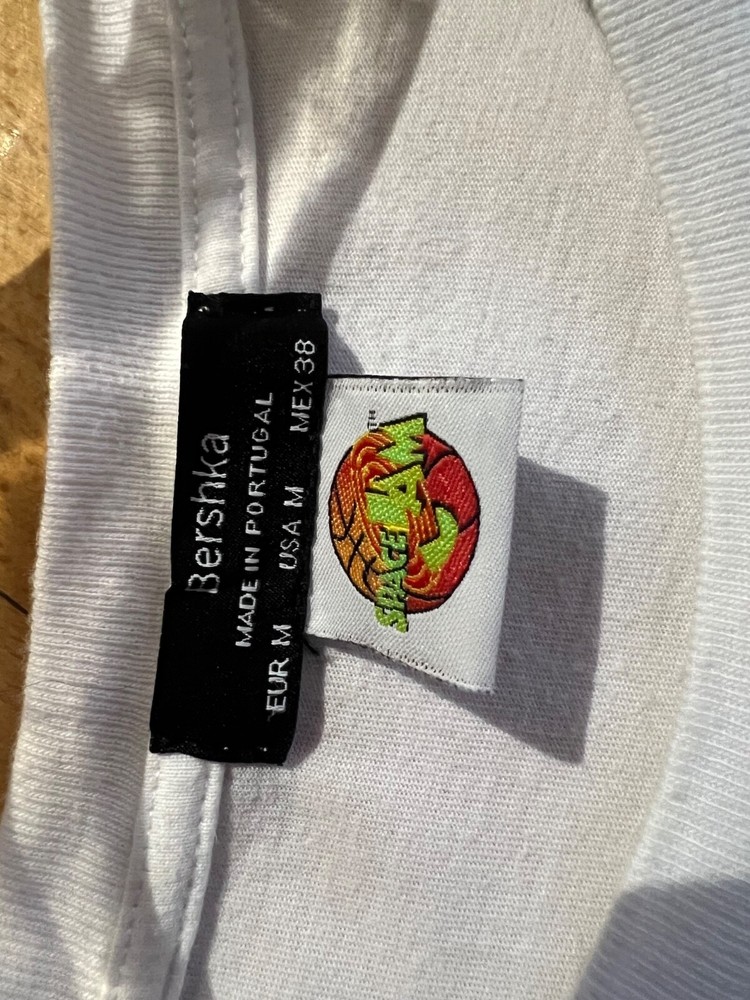 This vintage Bershka T-shirt in size M is perfect for any 90s enthusiast. With a classic white color and short sleeves, it's made of comfortable cotton material and features a regular fit. The shirt is perfect for any season, whether you're looking to rock a casual look in the summer or stay warm with a hoodie in the winter. The shirt is a great addition to any wardrobe and is sure to turn heads with its unique design. Made in Portugal, this T-shirt is a rare find and a must-have for any vintage clothing collector. Get your hands on this classic piece today!
