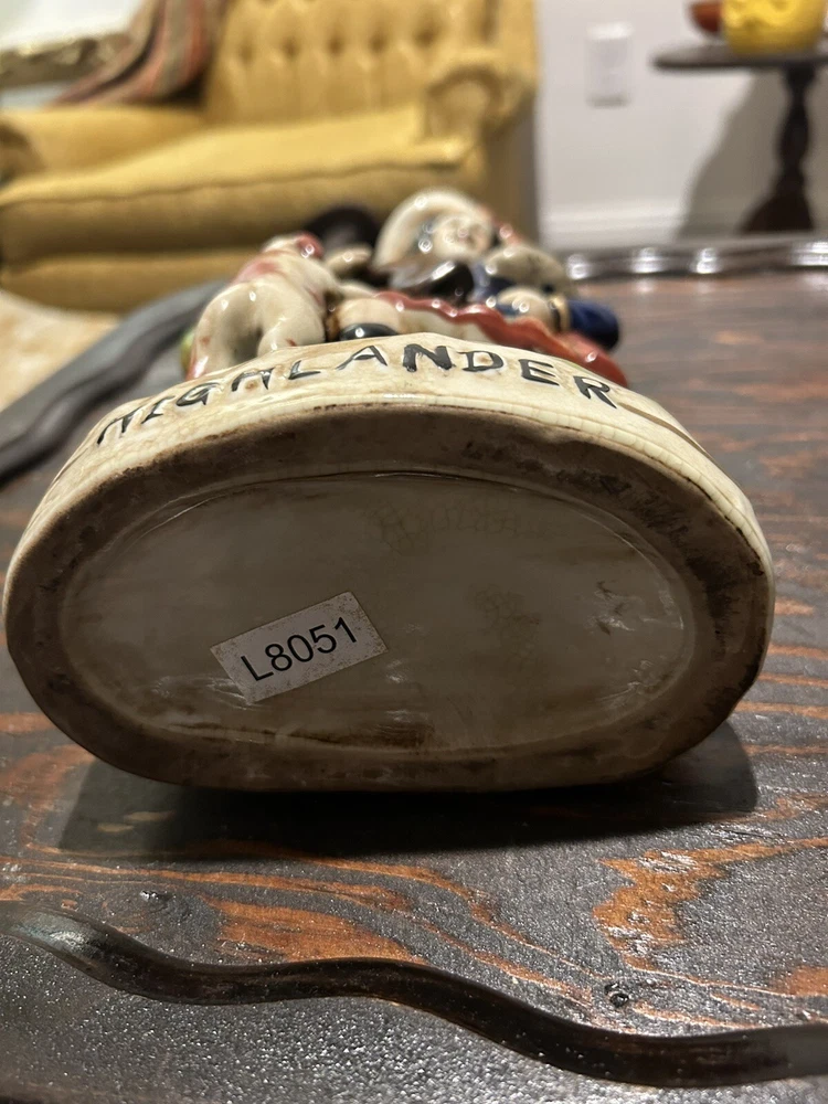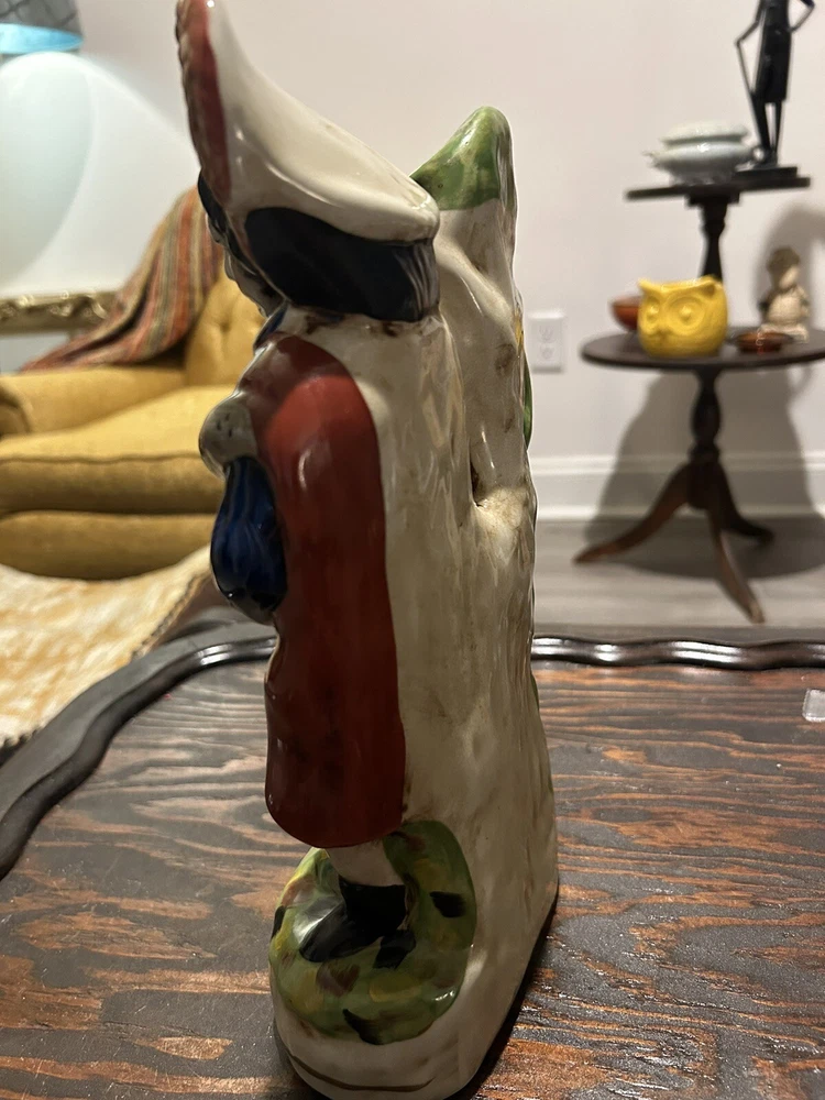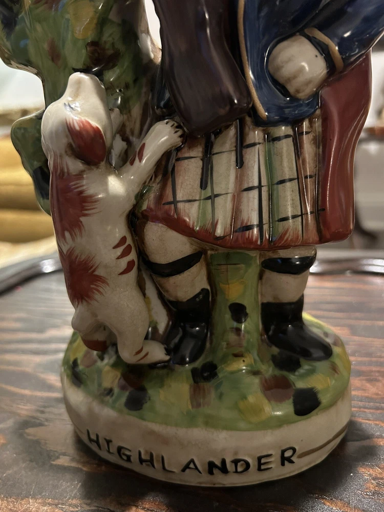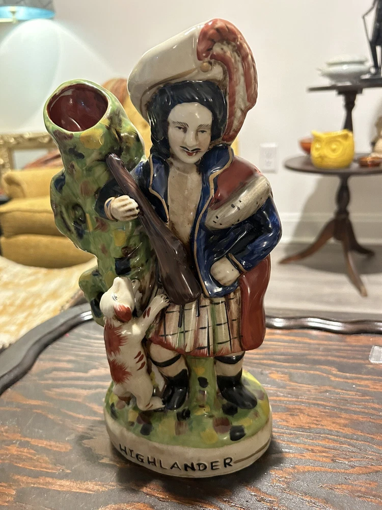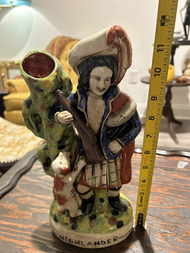 This vintage Staffordshire spill vase figurine is a stunning piece of art featuring a Highlander Hunter, his rifle, and his loyal hunting dog. Made of high-quality ceramic material, this medium-sized vase is handcrafted with Old English style and a glossy finish, making it a perfect addition to any collection or decorative display. The multicolor design and intricate details of this antique match holder/spill vase are sure to impress any art enthusiast. To keep it clean and well-maintained, simply use a damp cloth. This unique piece is ideal for collectors who appreciate hunting and hunting dog themes.