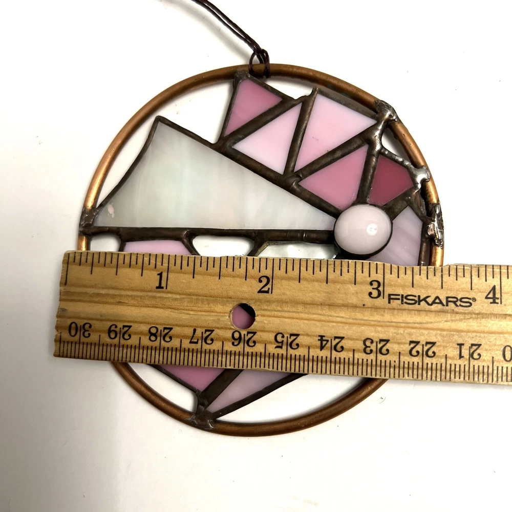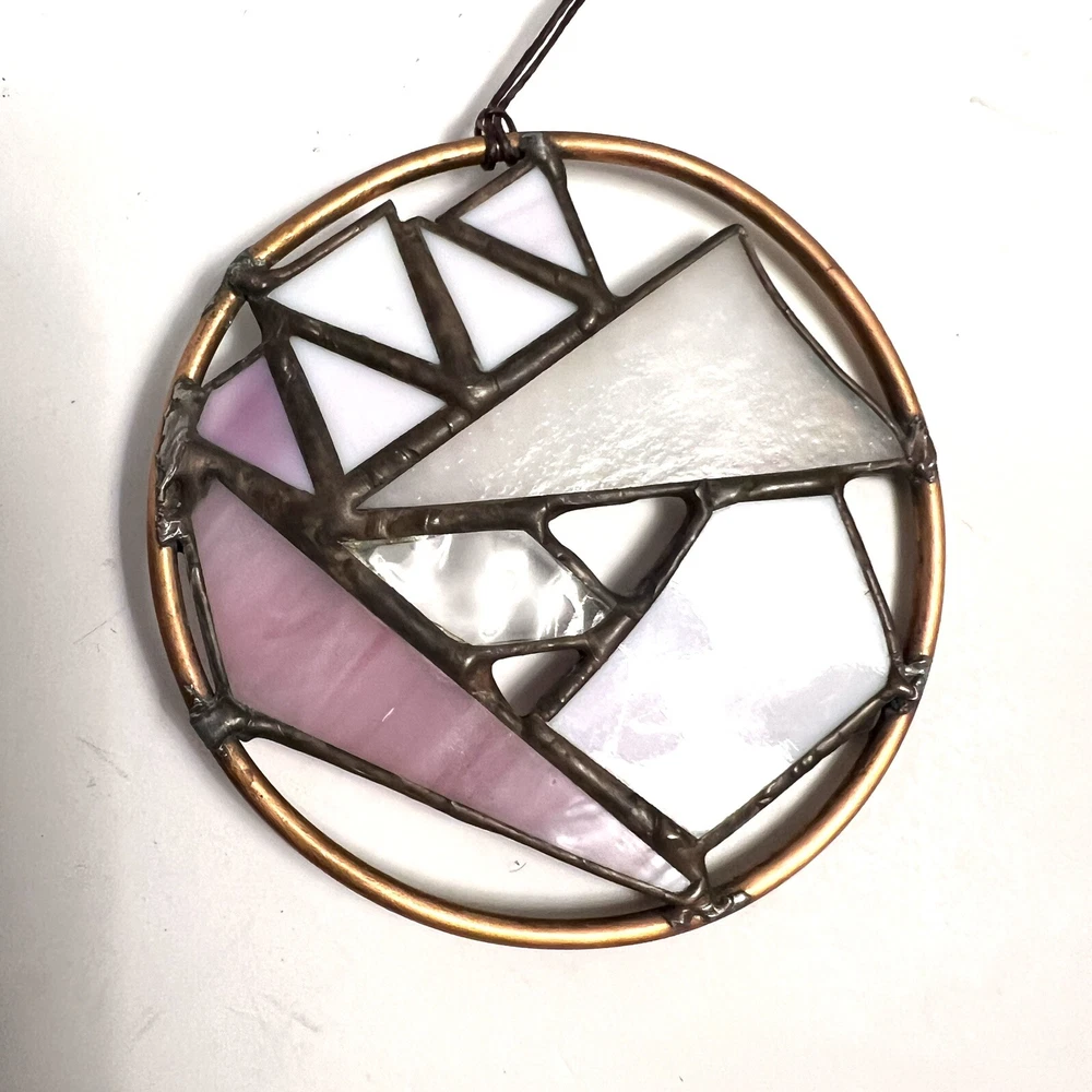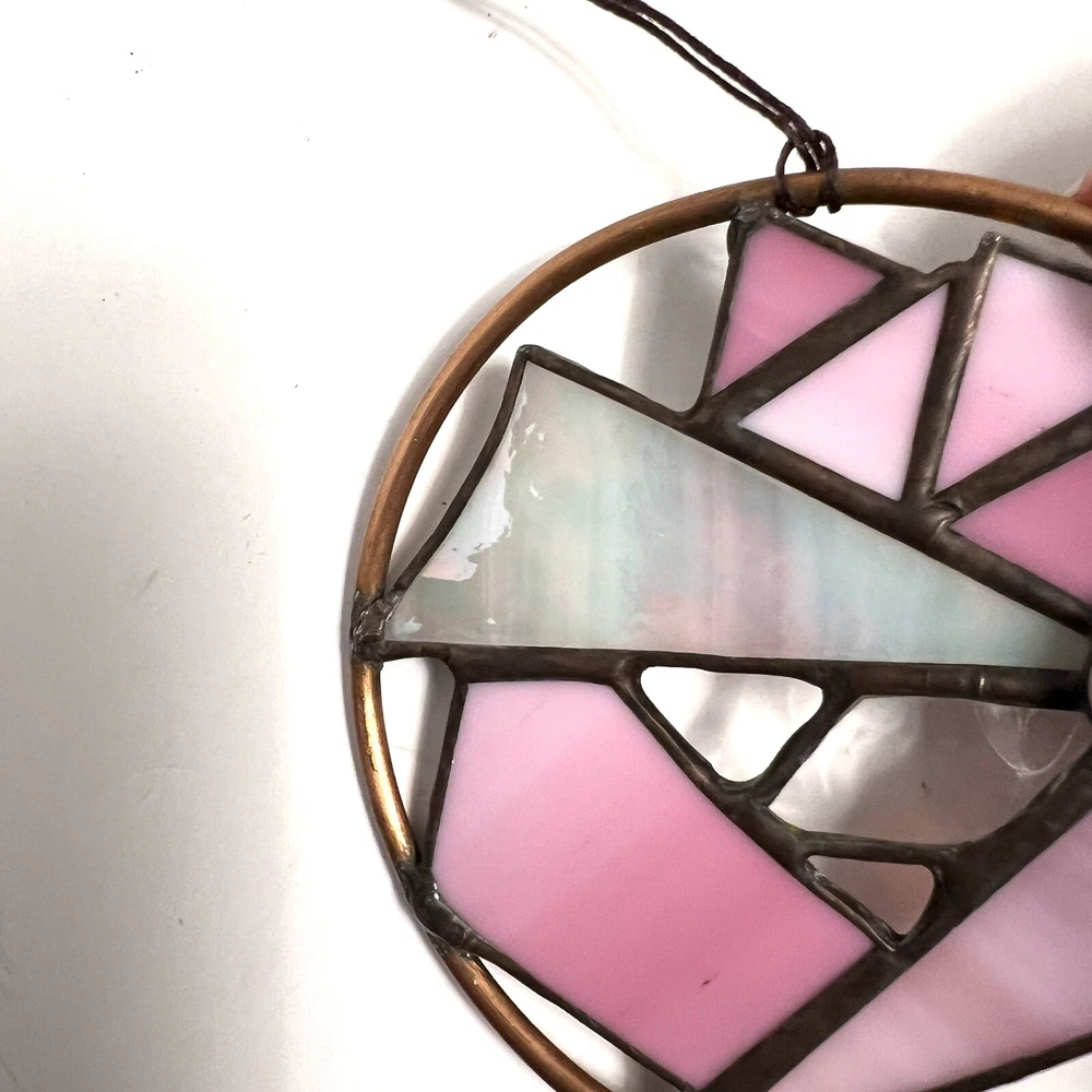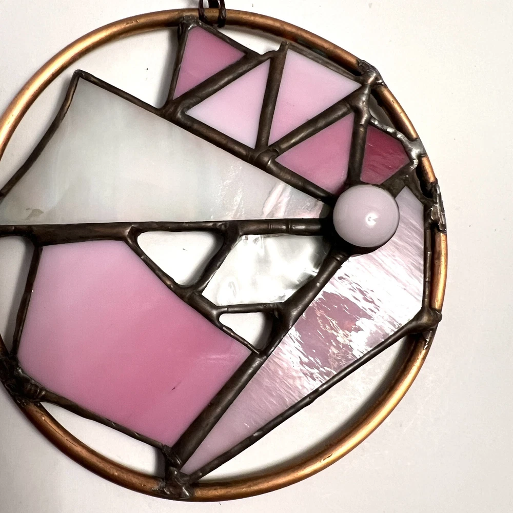 Stained Glass Window Suncatcher, Pink Circle Abstract, Mobile with Copper Circle Frame Size: 3.5 inch, small Handmade, Handcrafted, Art, Glass, Crystals, Boho, Arts & Crafts, Mission, Bohemian, Boho, Home Decor, Rainbows, Artistic, Glass Art Mobile, Window Panel, Handcrafted with the copper foil method. Hand cut high quality stained glass wrapped with copper foil, soldered with silver solder. Finished with black patina. Made in USA by a small business owner. Sku: 2t/2412