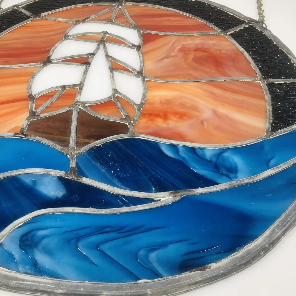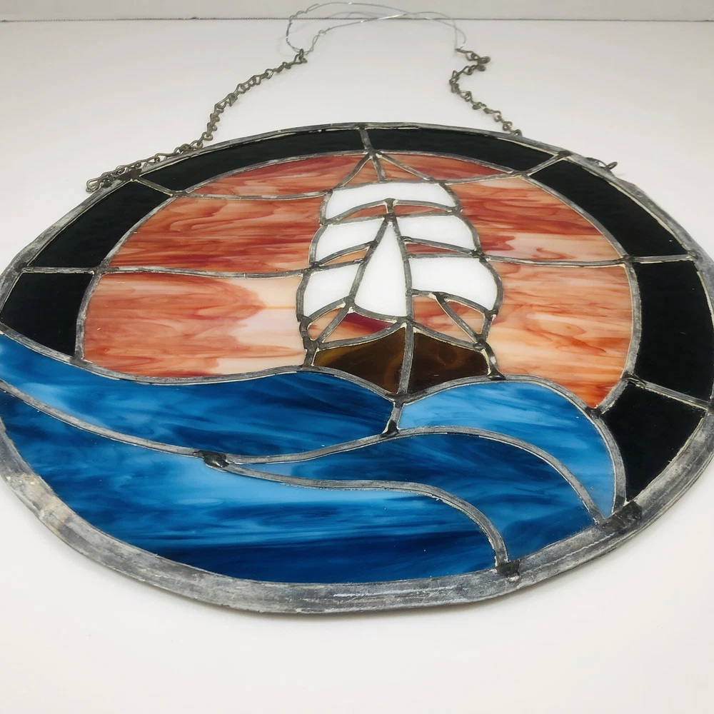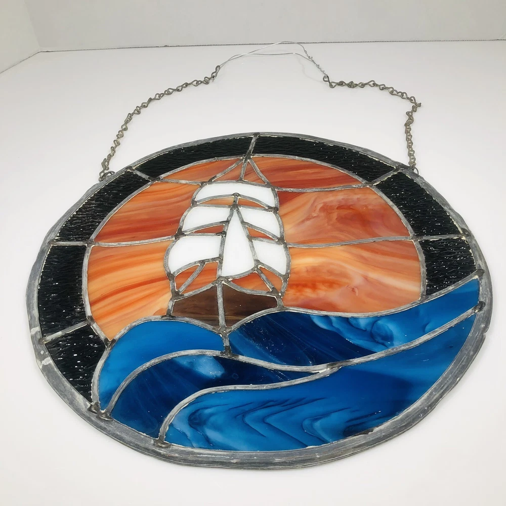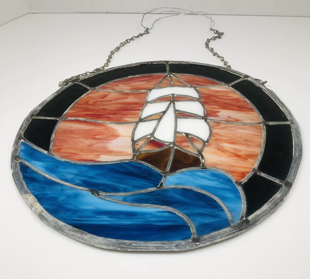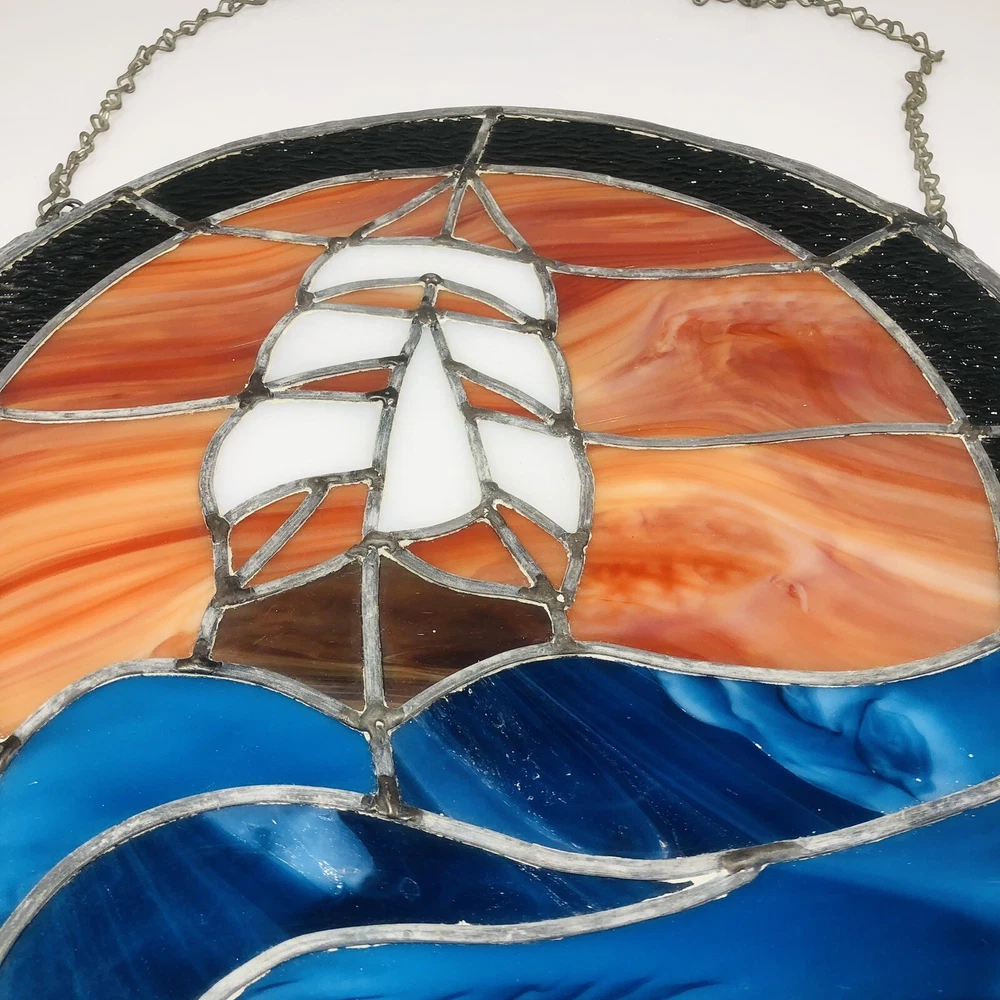 Add a touch of vintage charm to your home decor with this beautiful stained glass sailboat window hanging panel suncatcher. The intricate floral pattern and colorful design make it a perfect addition to any room that needs a little bit of nature and art. Crafted by hand in the late 20th century, this unmarked suncatcher features a framed, ready-to-hang design and is made of high-quality glass. Its nautical and ocean-themed elements, including ships and boats, sea life, and the ocean itself, make it a perfect addition to any home that loves the sea. Don't miss out on this unique and decorative piece that is sure to add beauty and character to your home.