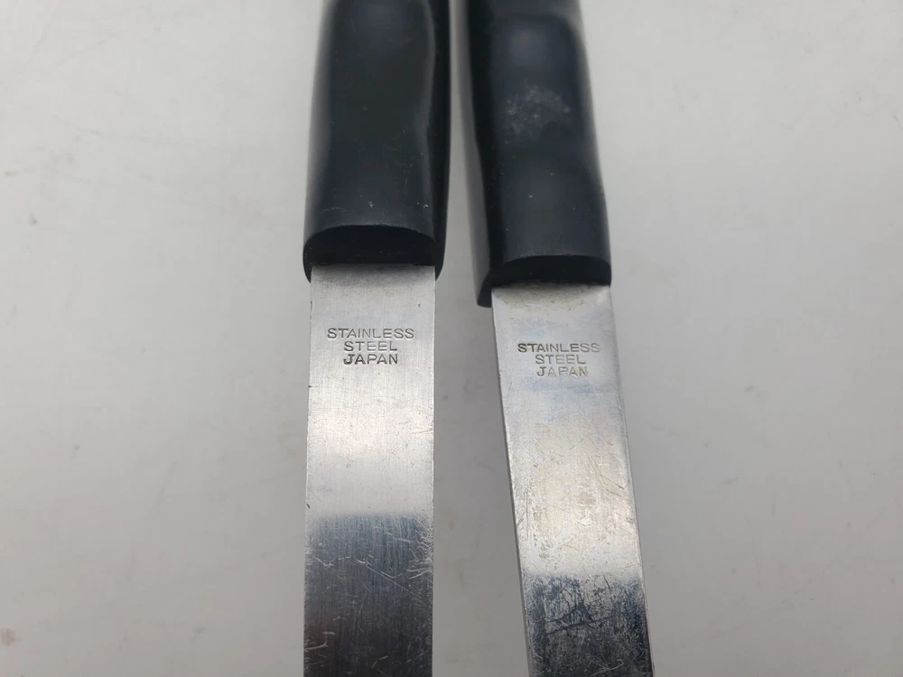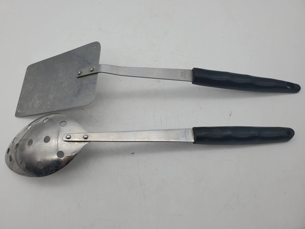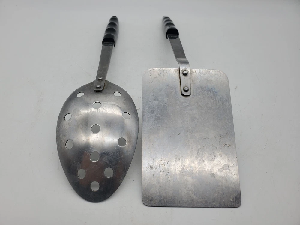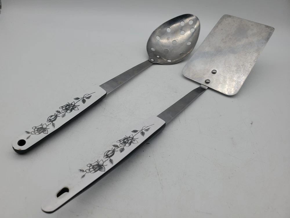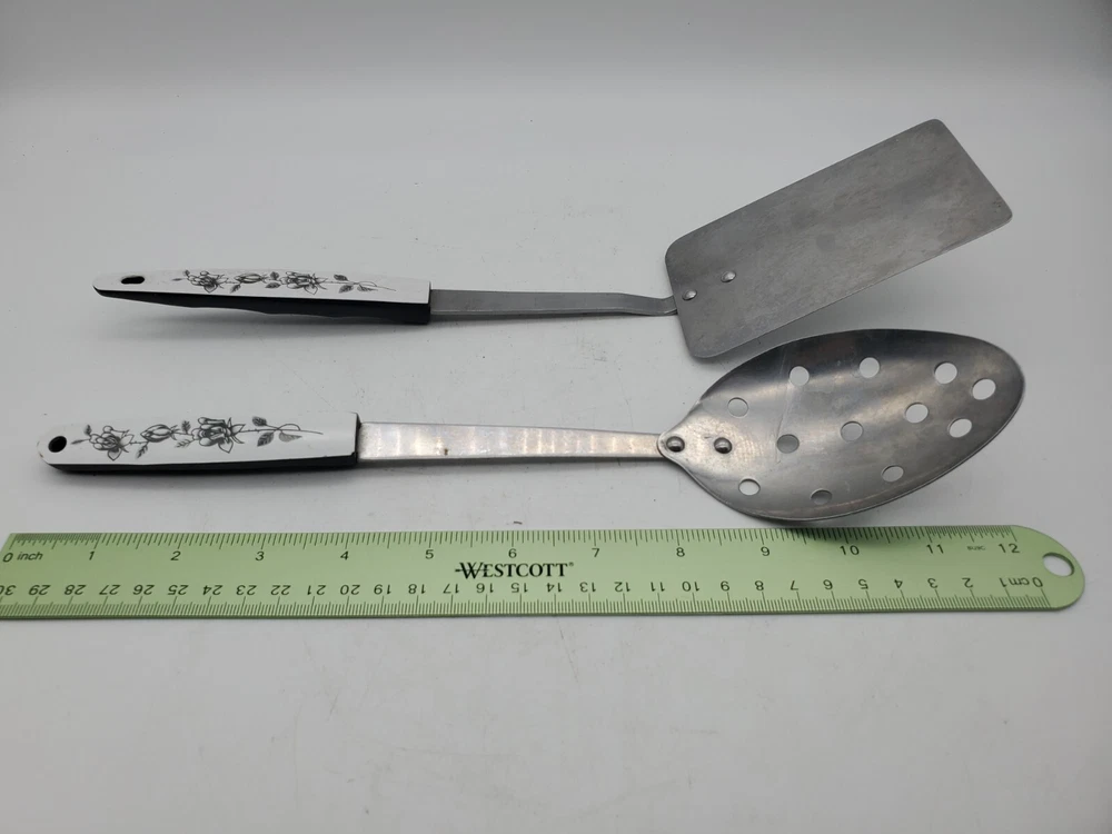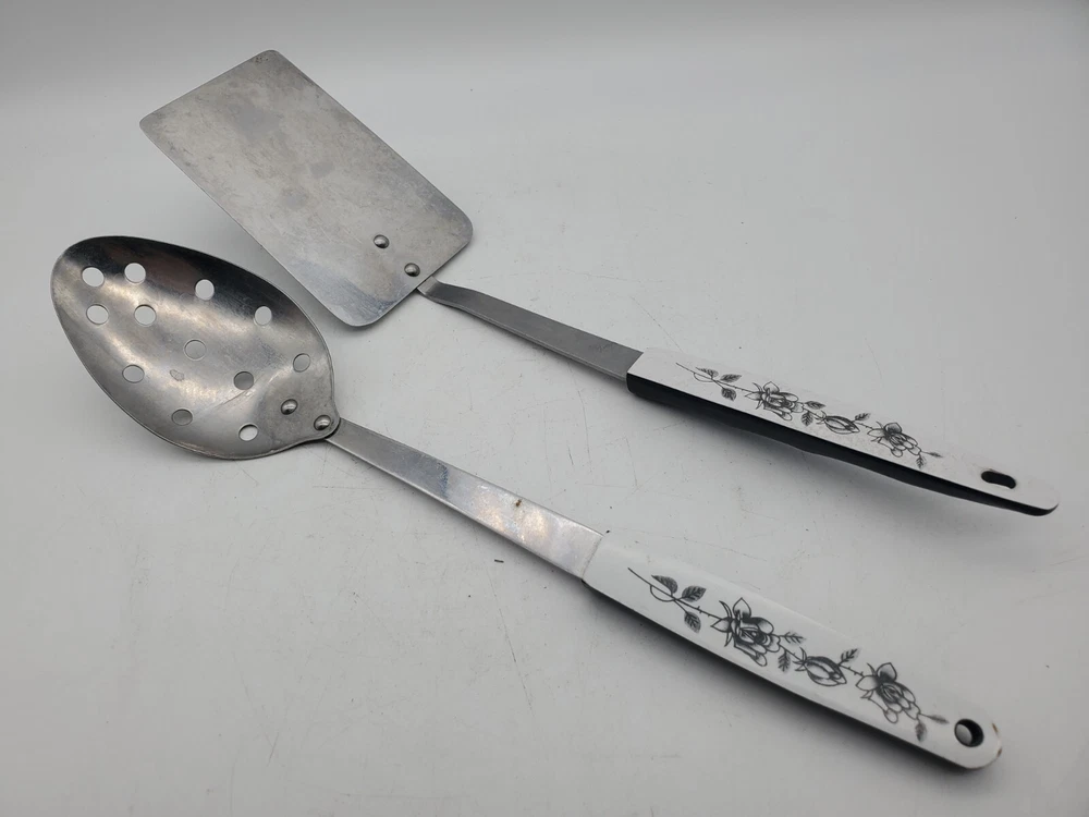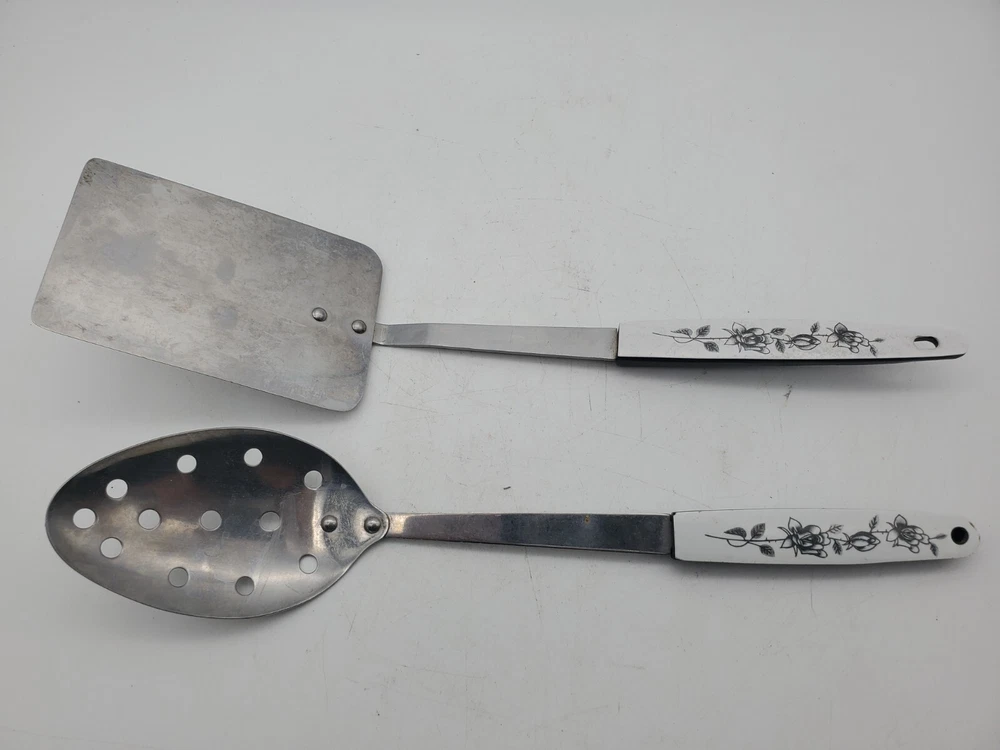 Add a touch of vintage charm to your kitchen with this set of stainless steel serving utensils. The set includes a slotted spatula and spoon, both with a beautiful floral pattern in silver, black, and white. Slotted spoon is 12" long and spatula is 12.5" long.