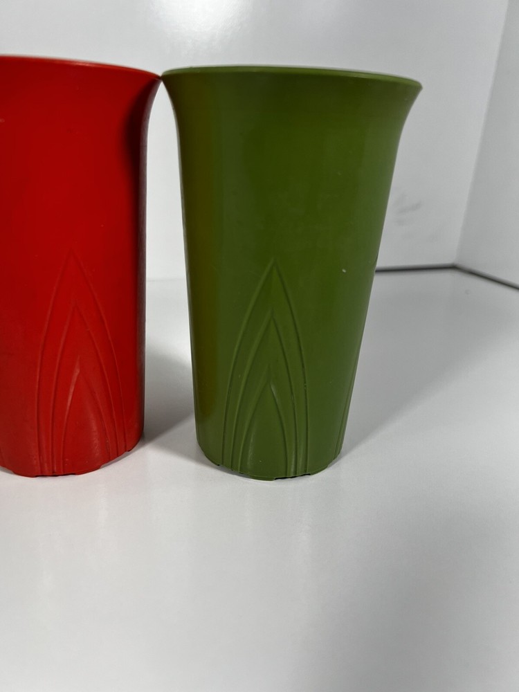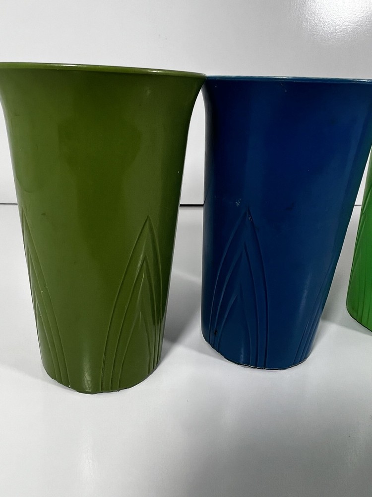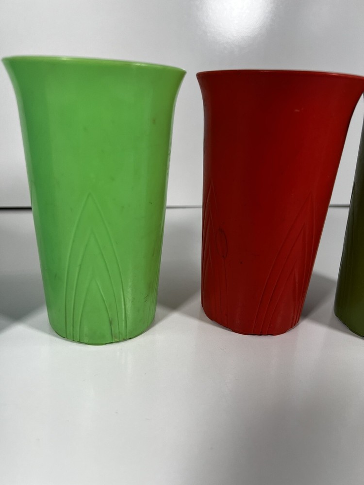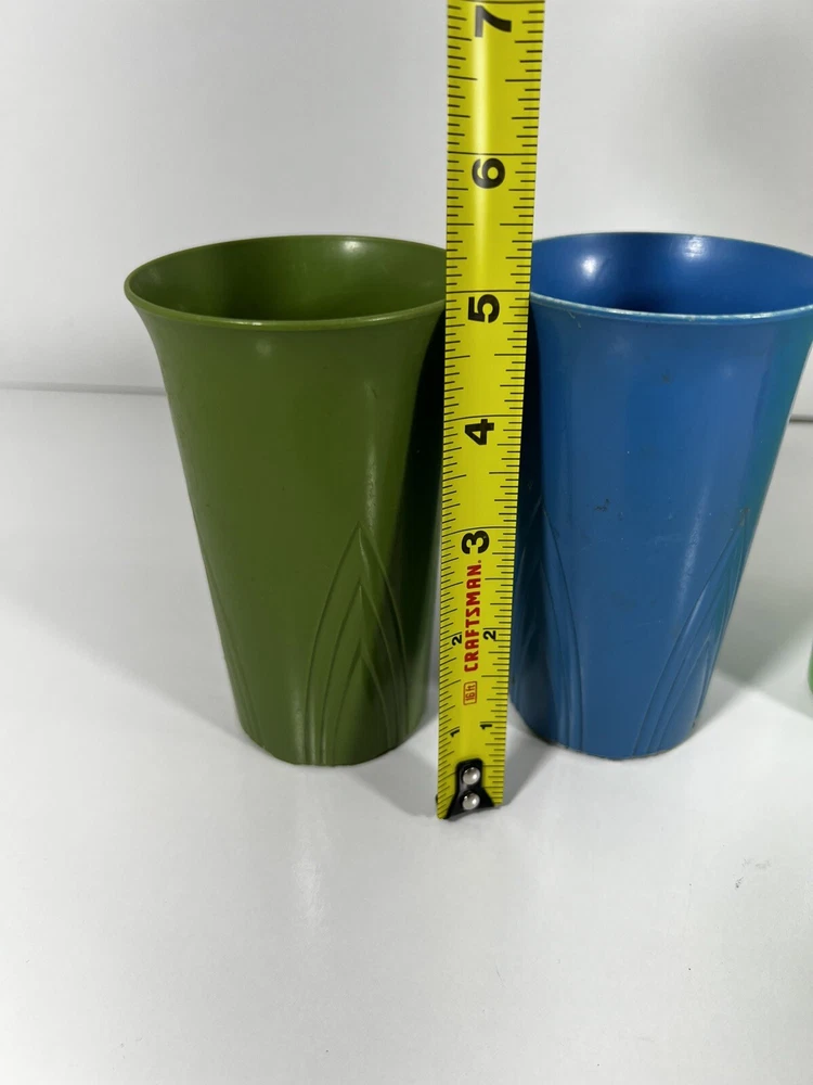 Vintage Stanley Home Products 5 Cup Stackable Set Retro 10 Oz Cups. This colorful five-piece set includes stackable 10 oz cups made of plastic in a retro style. The cups are vintage from the 1970s and feature a multicolor design, ideal for serving cold beverages. The cups are 5 inches in height and 3 inches in width, with the brand being Stanley.