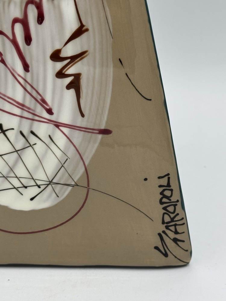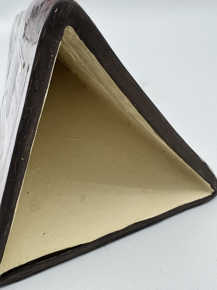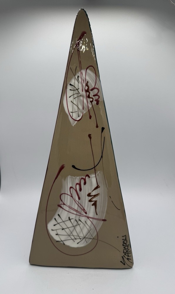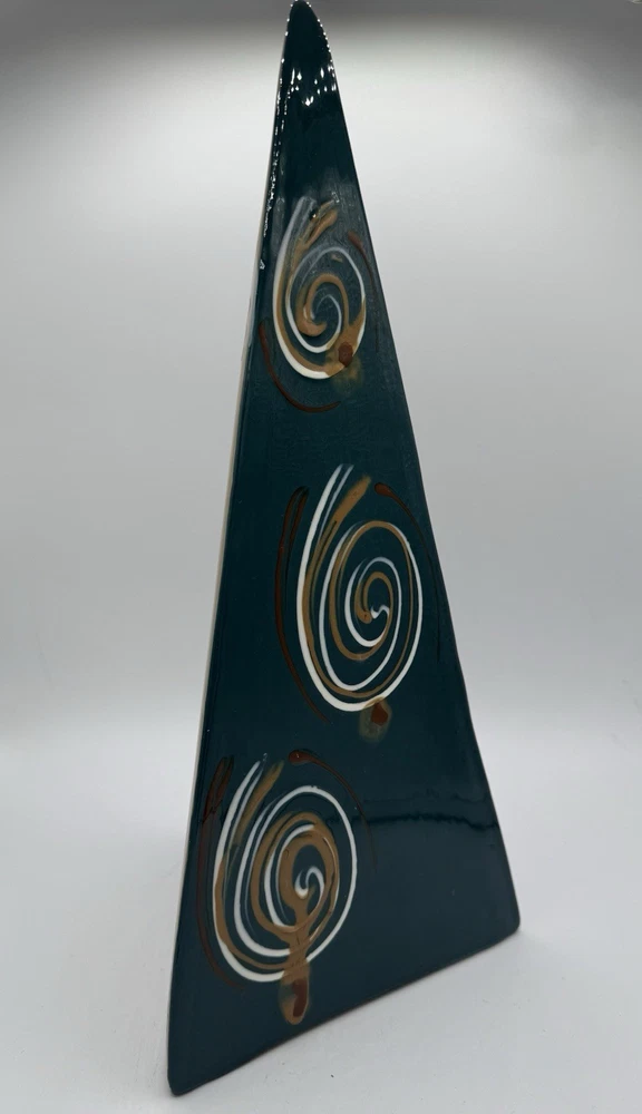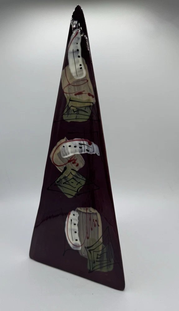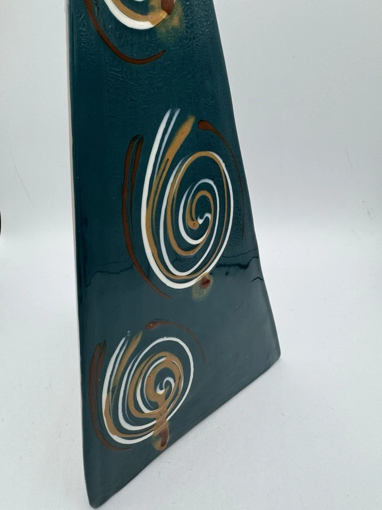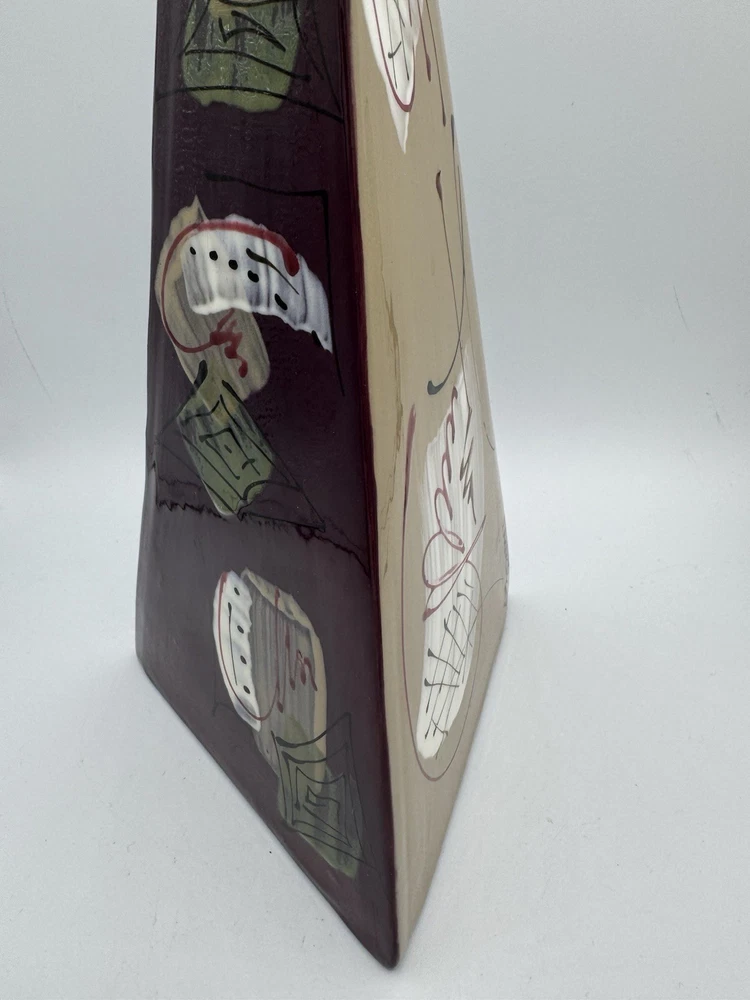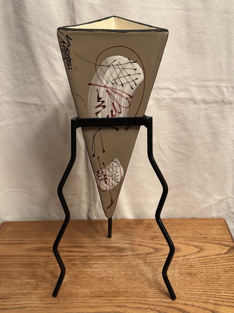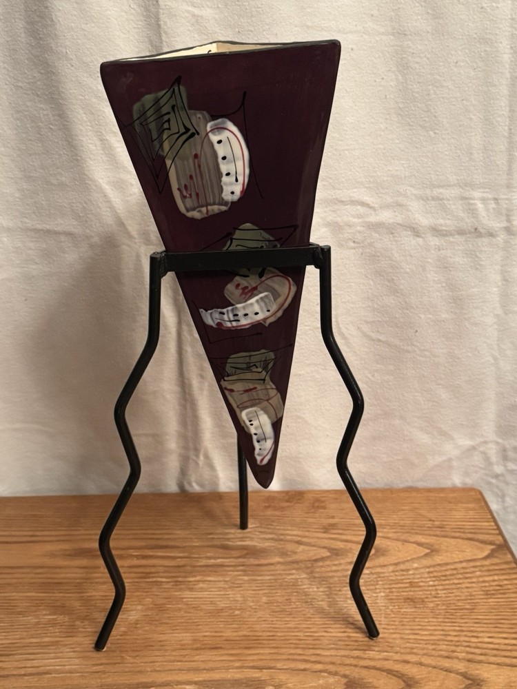 VASE MEASURES 12”. WITH STAND 16.5”. The stand is black iron. I took pictures with the stand and then inside a light box to try to better showcase the colors. One side is tan. Another is wine/maroon. The final is forest green. Please message with any question. No chips or cracks.