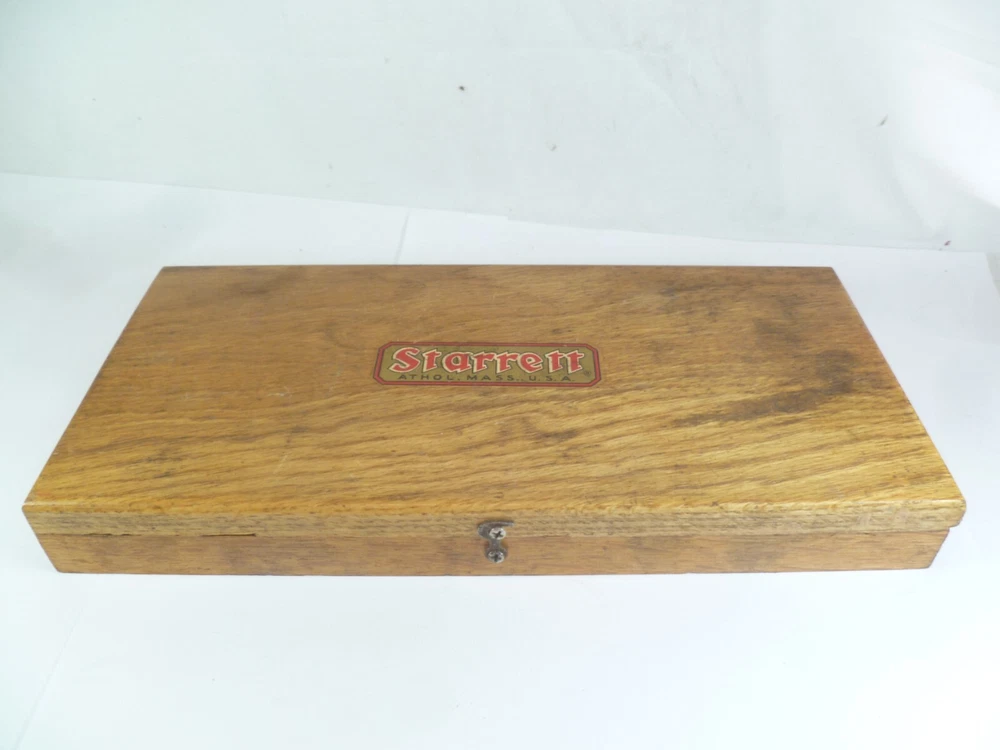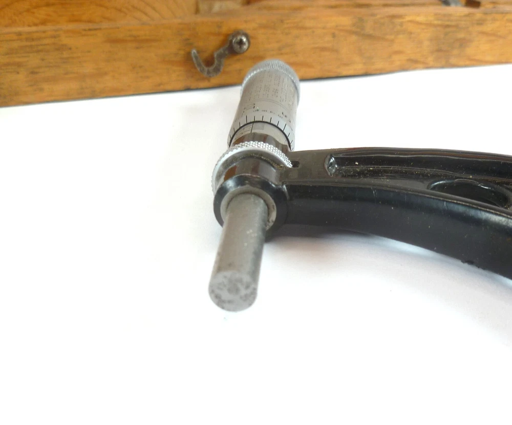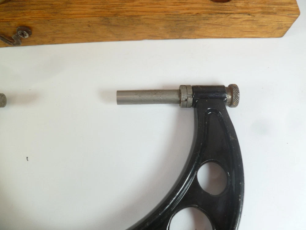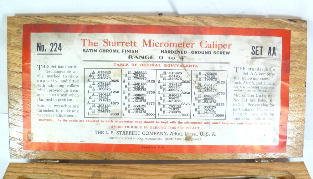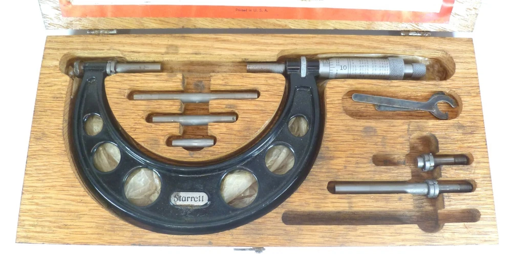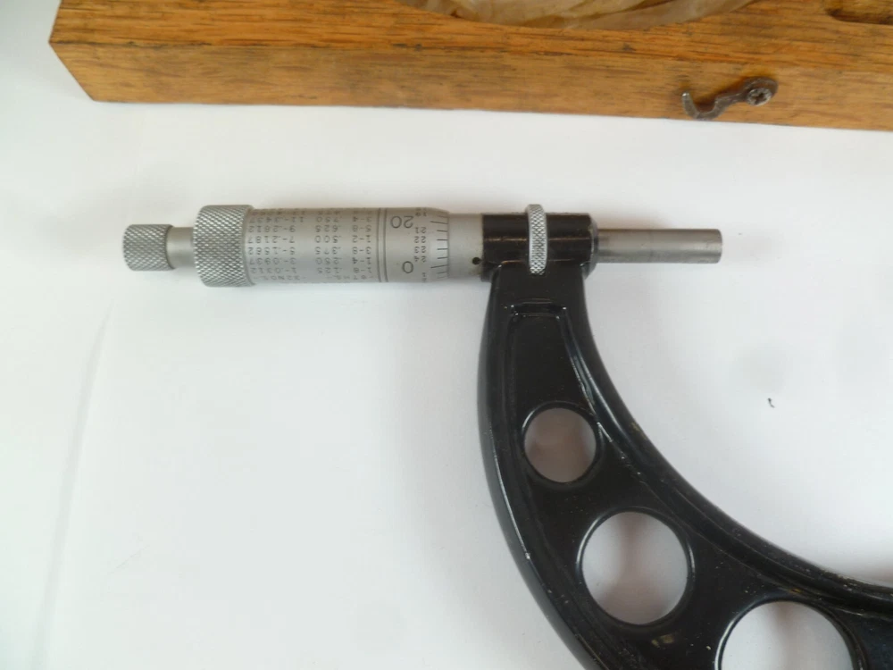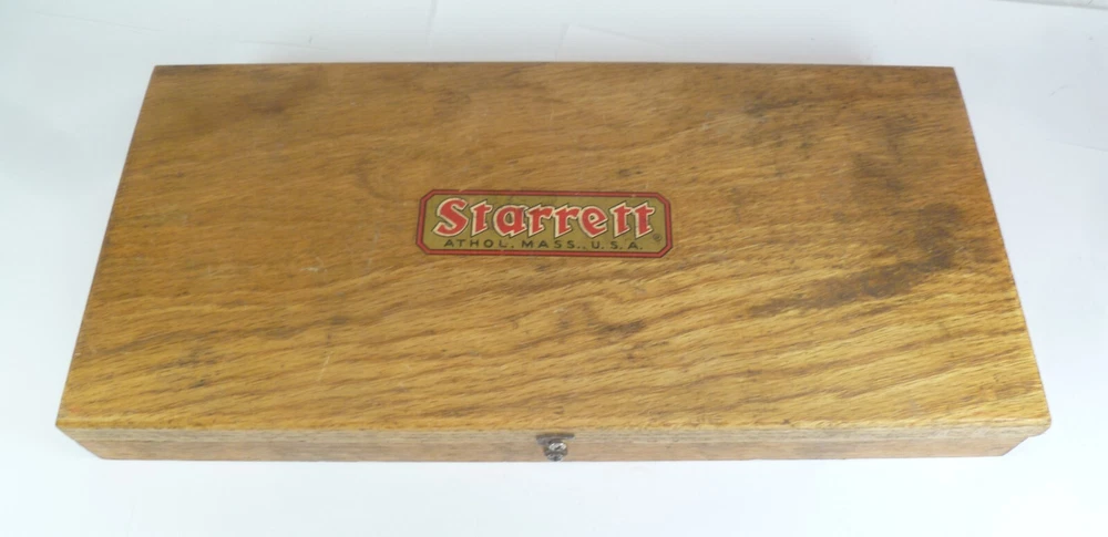 Here is an Older Starrett No. 224 Micrometer Caliper Set AA. It is missing the biggest anvil. It is being sold for parts or repair because there is some corrosion to the spindle, including to the face of it. the wood box is dirty.