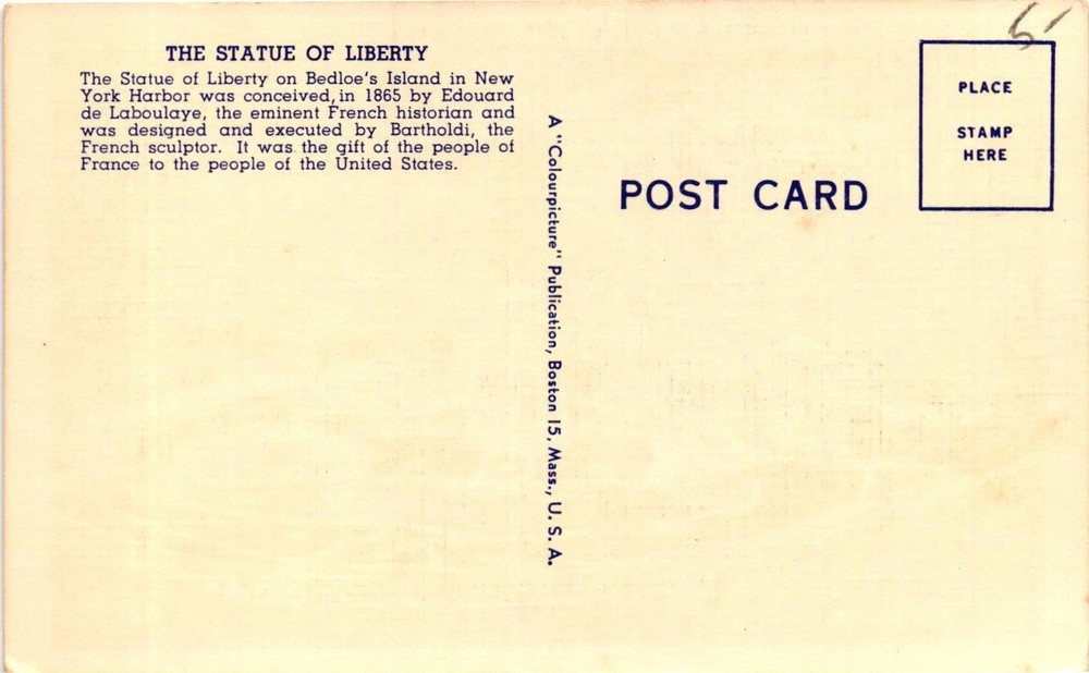Vintage Postcard- Statue of Liberty on Bedloe's Island in New York Harbor, New Y