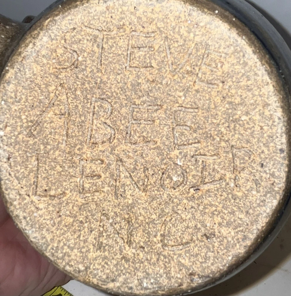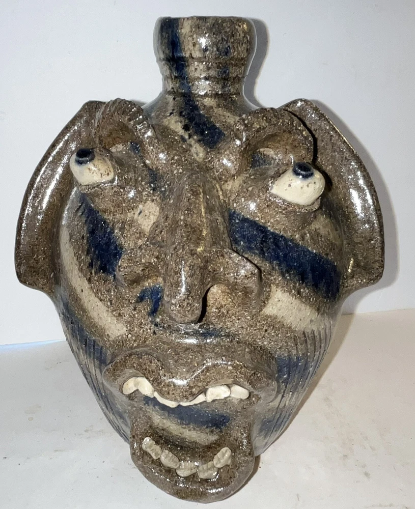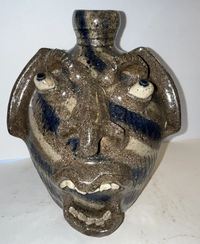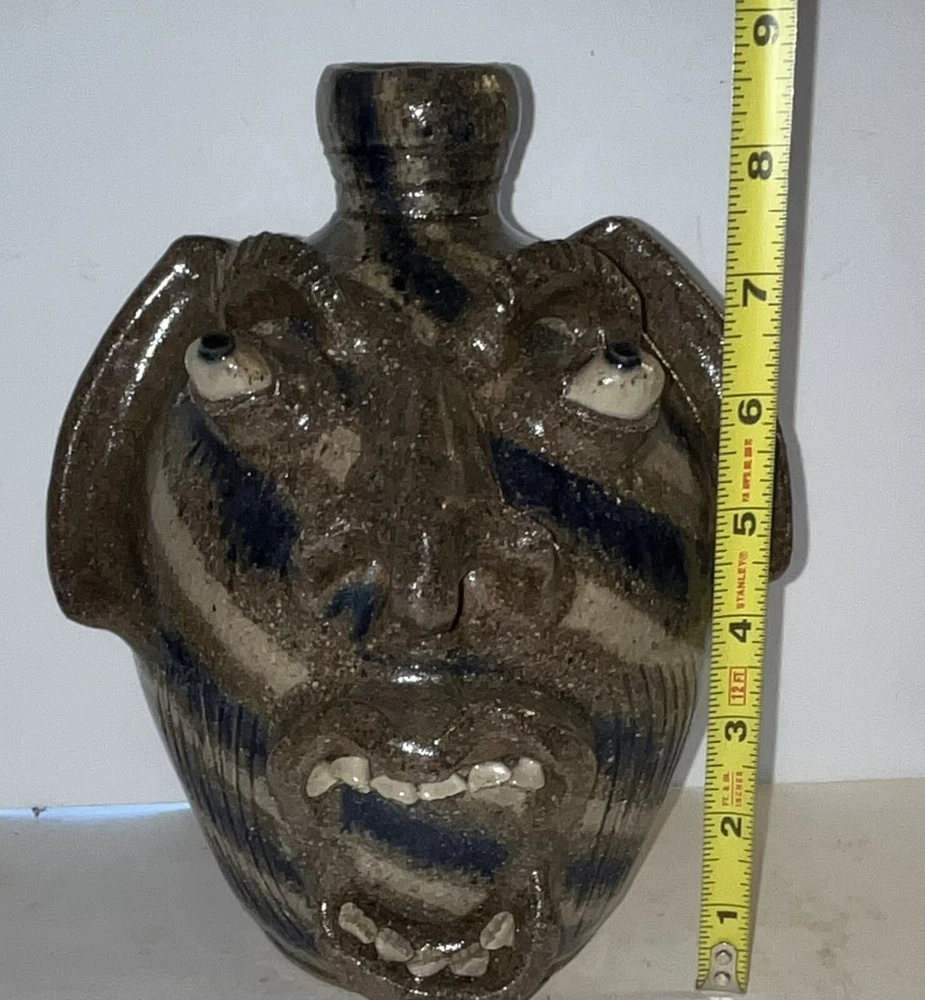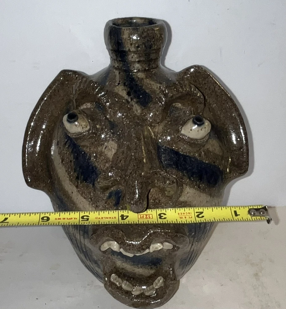 This is a Vintage Steve Abee Pottery Face Jug Catawba Valley NC Signed Tri Color Striper Steve Abee of Lenoir County, North Carolina. Heavily influenced by Burlon Craig, he has definitely taken the mantle of the Catawba Valley Potters. This is in beautiful condition with no damage. It’s signed Steve Abee, Lenoir, NC on the bottom. Approximate measurements: 9"H x 5" Diameter. Please see all photos.