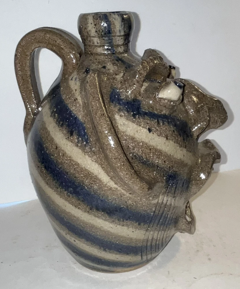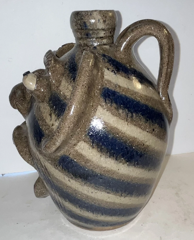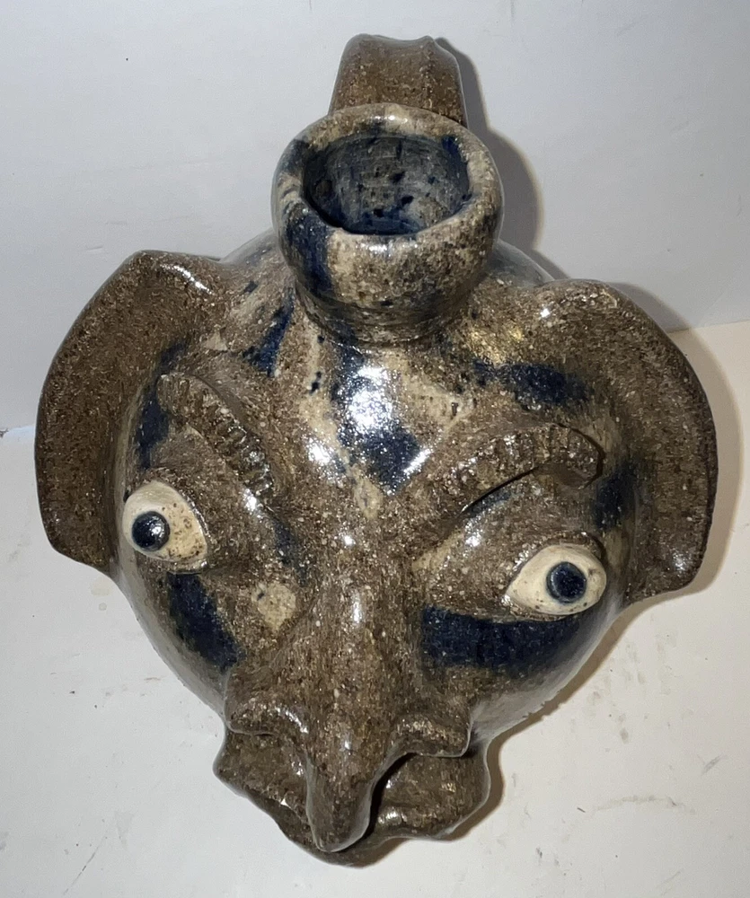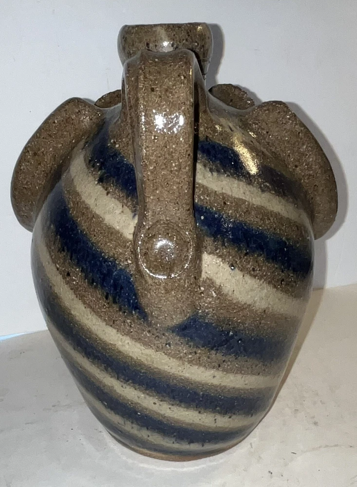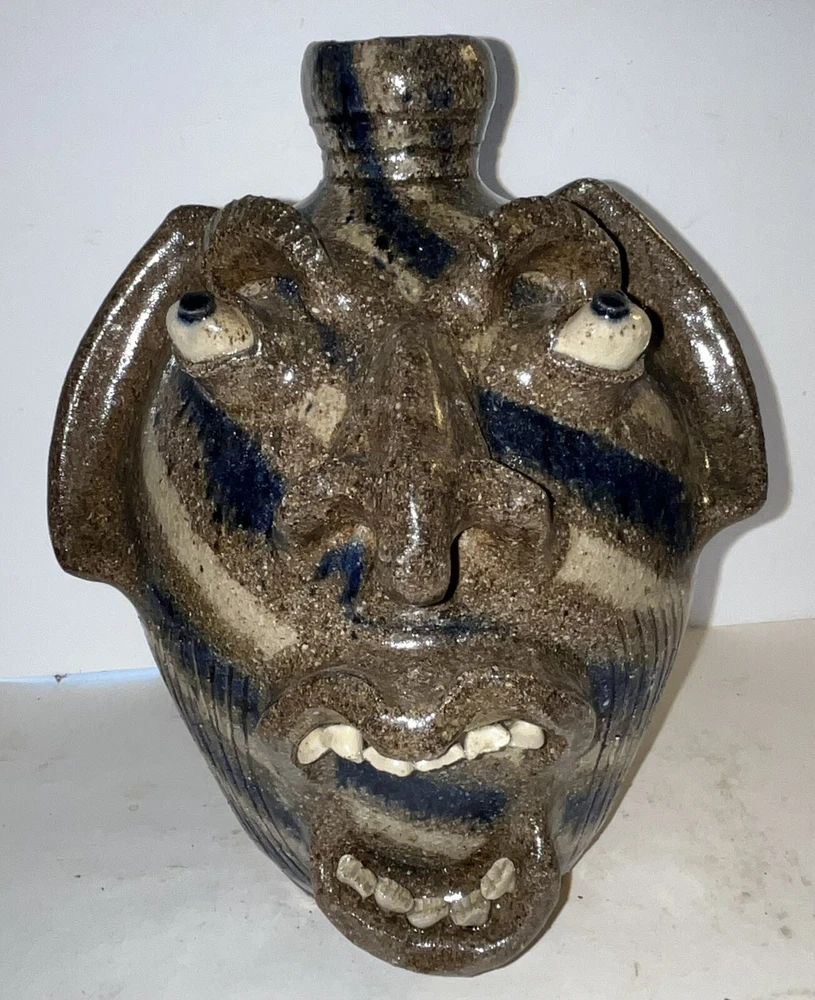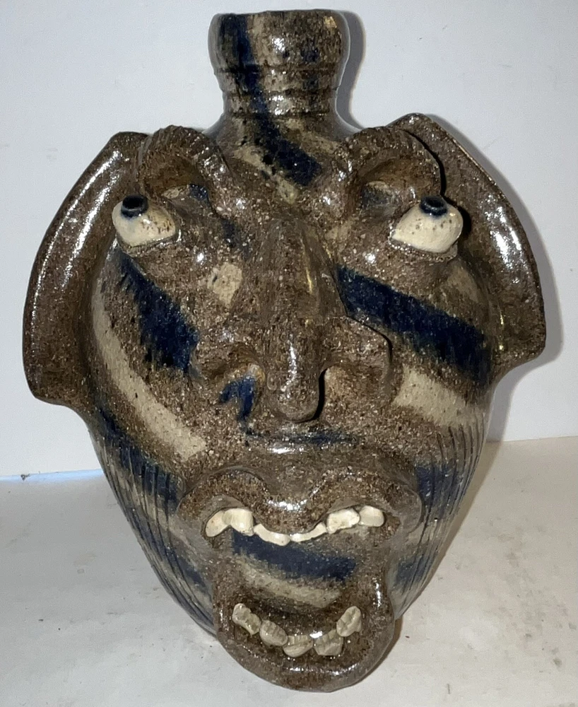 This is a Vintage Steve Abee Pottery Face Jug Catawba Valley NC Signed Tri Color Striper Steve Abee of Lenoir County, North Carolina. Heavily influenced by Burlon Craig, he has definitely taken the mantle of the Catawba Valley Potters. This is in beautiful condition with no damage. It’s signed Steve Abee, Lenoir, NC on the bottom. Approximate measurements: 9"H x 5" Diameter. Please see all photos.