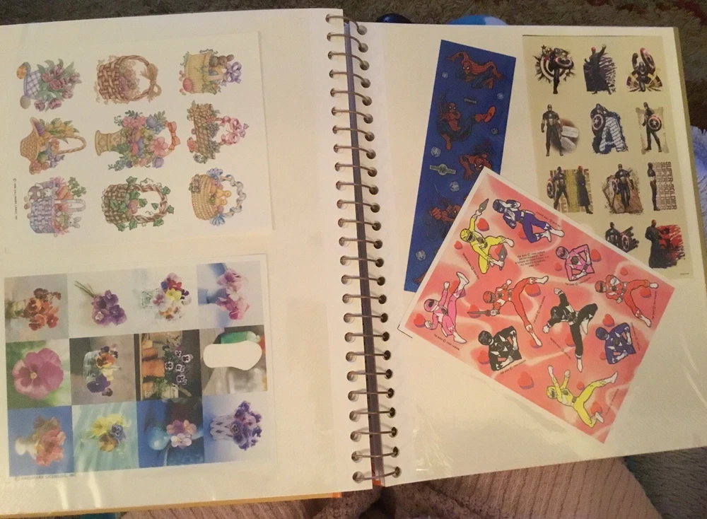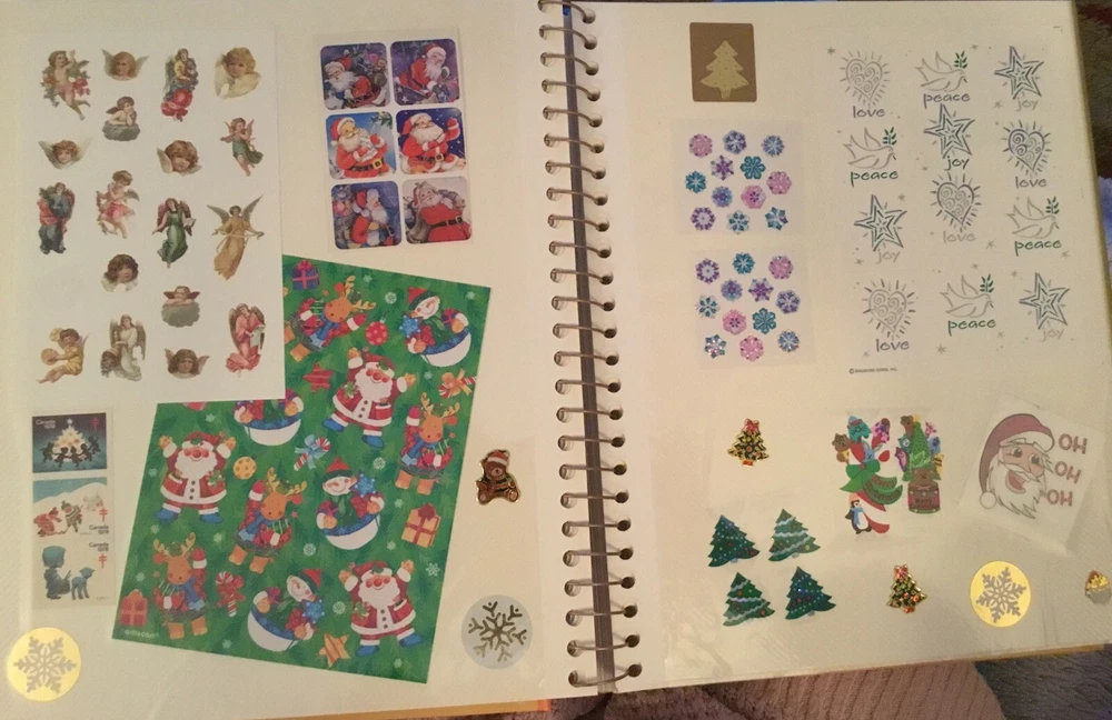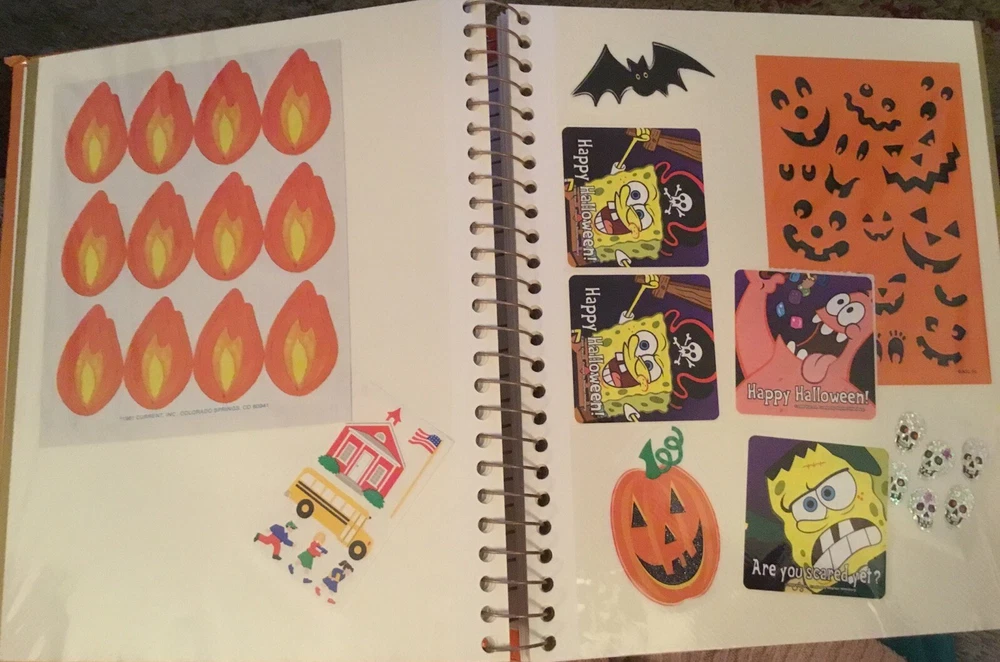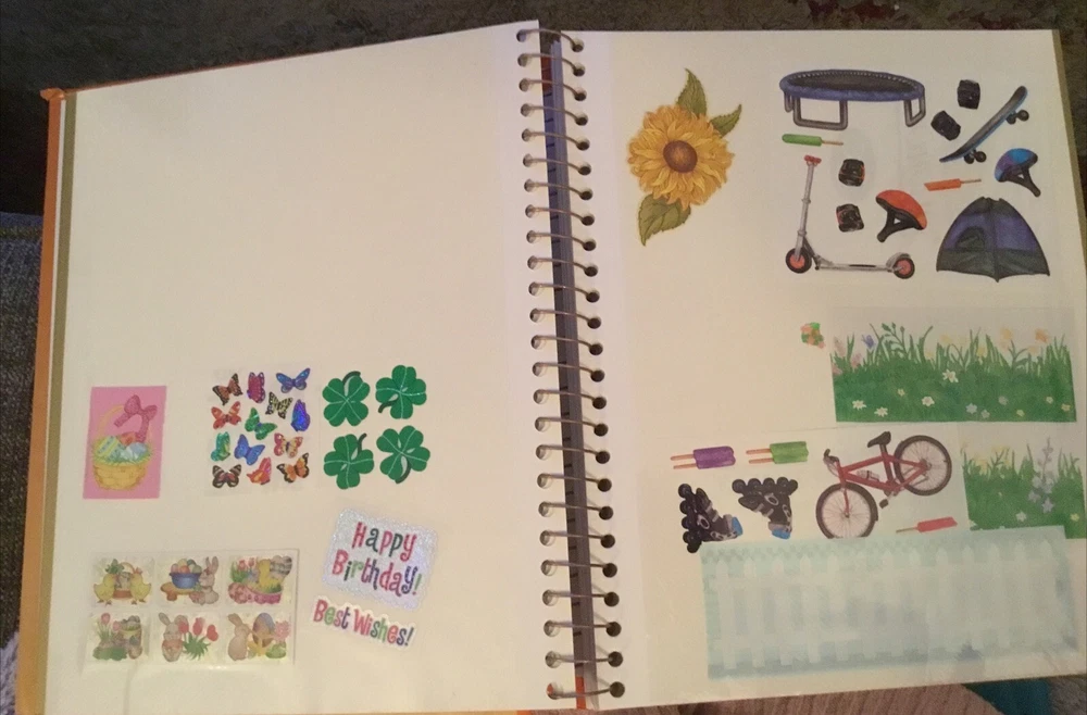 Vintage Sticker Book Album featuring designs from the 80s, 90s, and 2000s by popular brands like Sandylion, Hallmark, AGC, and Mrs Grossmans. This multi-color sticker book is perfect for adding a touch of nostalgia to your scrapbooking projects. Dive into a world of history-themed stickers with this charming collection, ideal for any craft enthusiast. Perfect for adding a retro flair to your creative projects, this sticker book is a must-have for any scrapbooking aficionado. This book has 40 pages and 38 of them contain stickers with their original backing (with the exception of the inside cover where the backing of the stickers was removed). Please see all the photos.