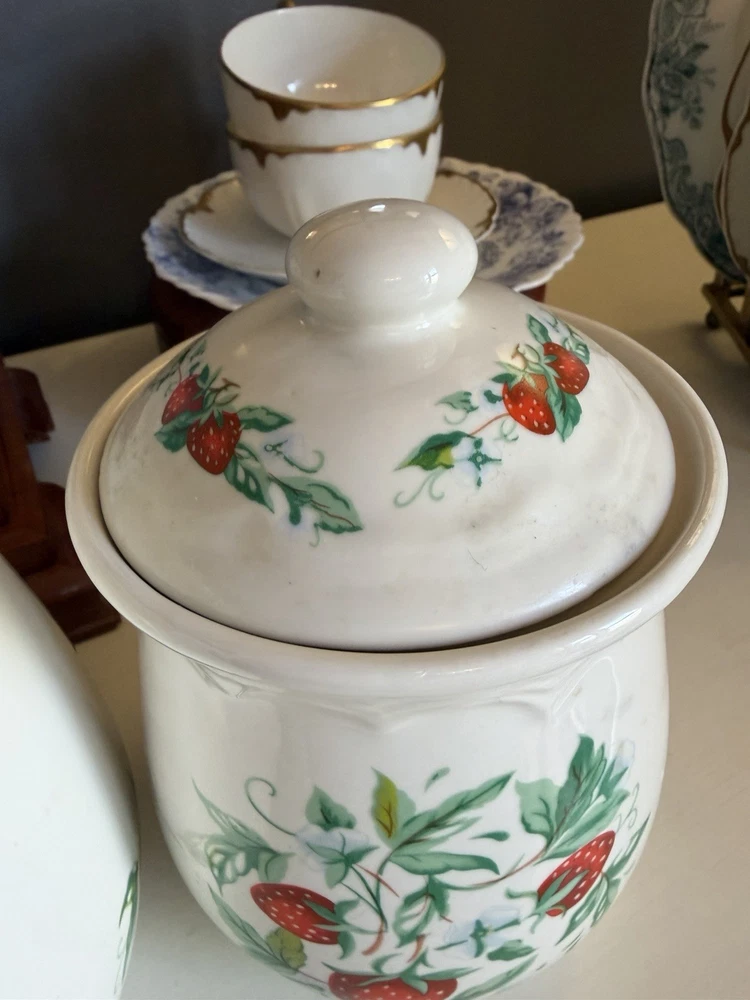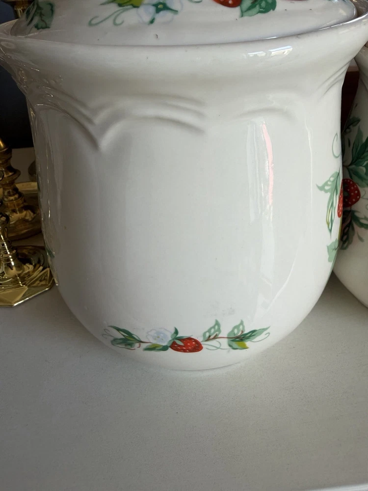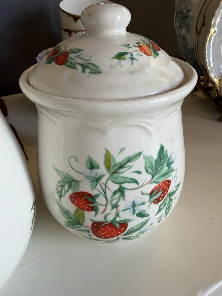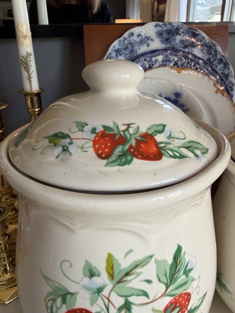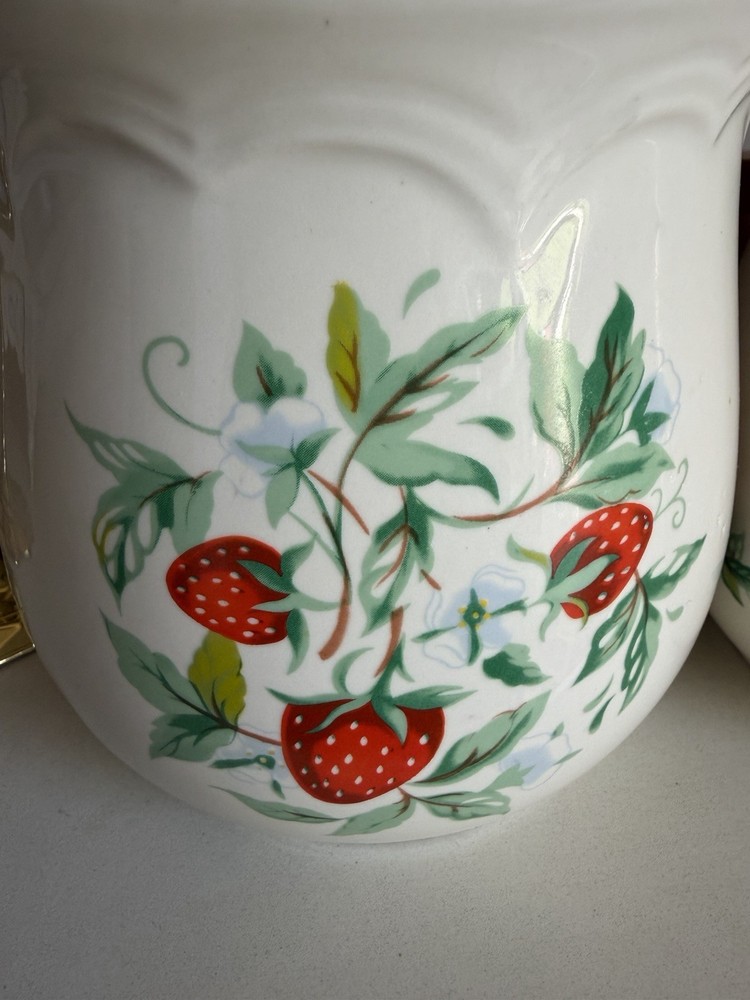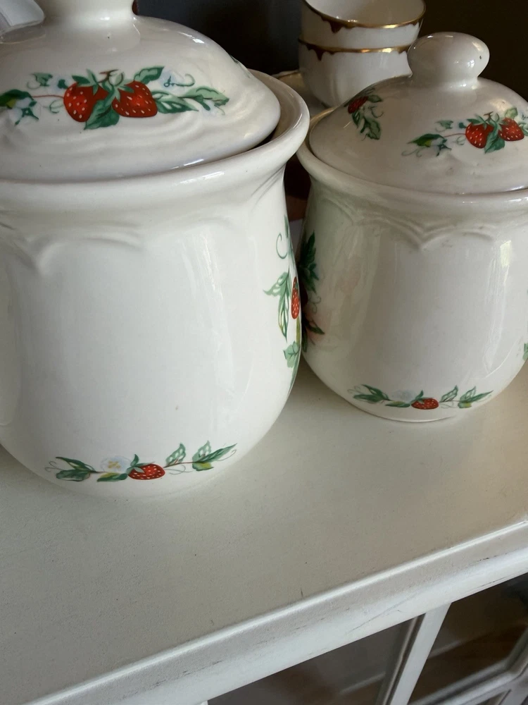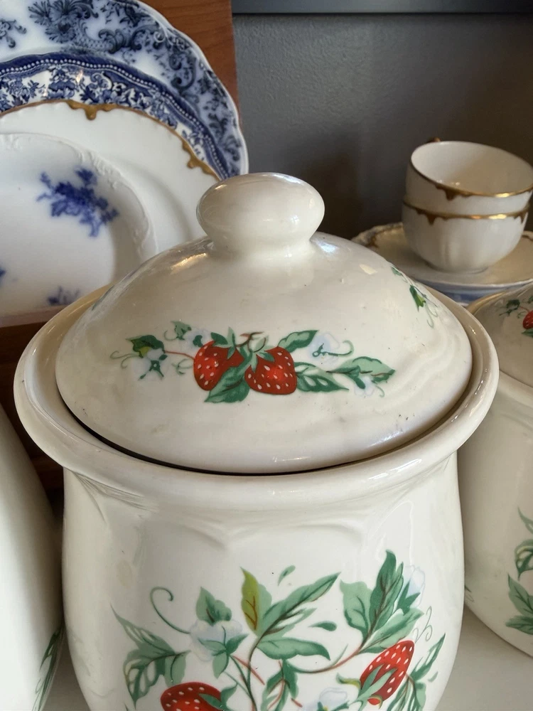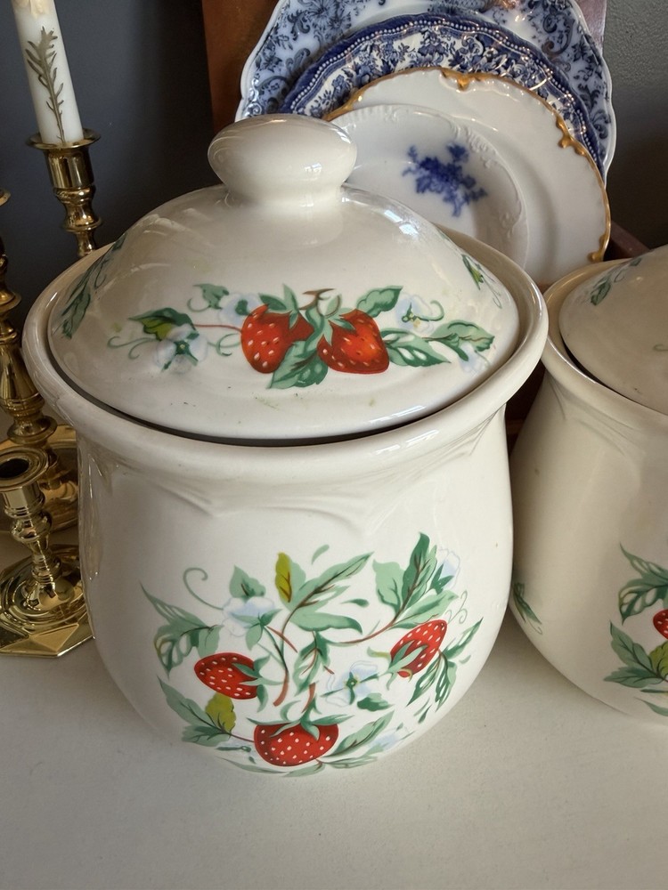 Vintage Strawberry 3 Piece Canister Set Sears Roebuck? Excellent condition no flaws, canisters with lids measure about 10,9 and 7” tall, 6,5.5 and 4.5” wide