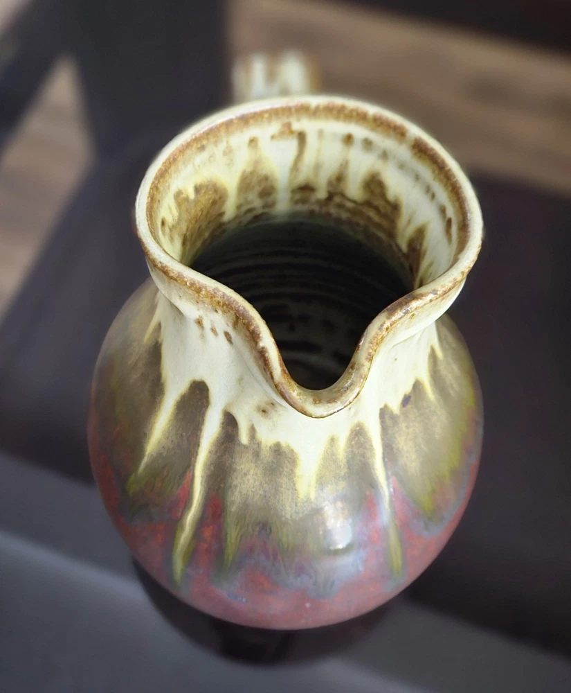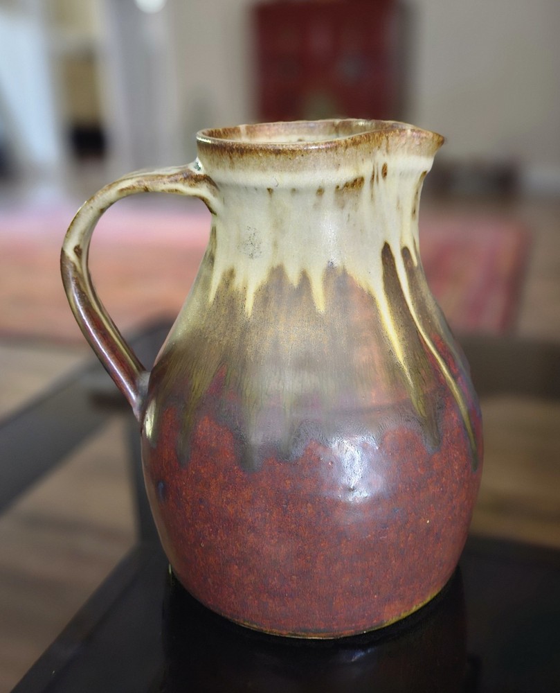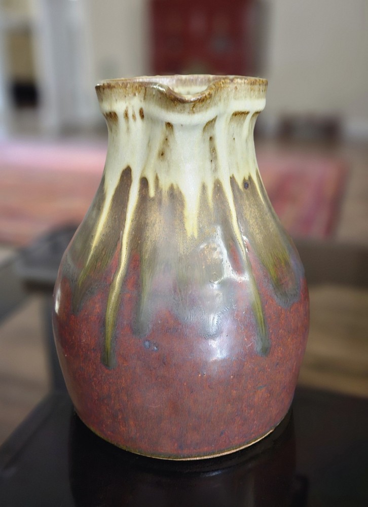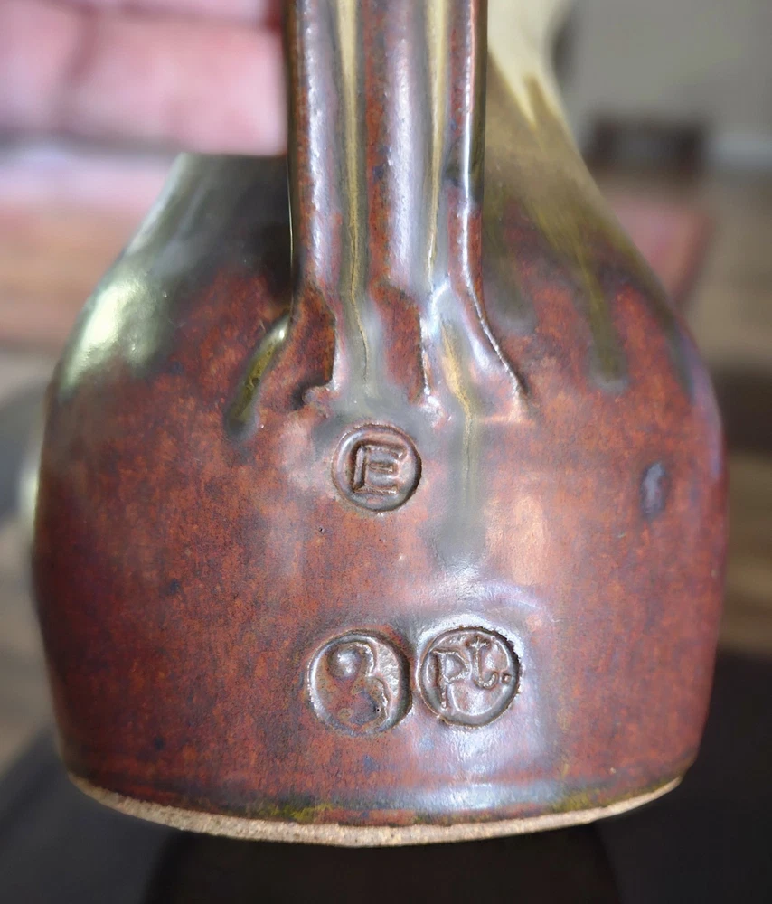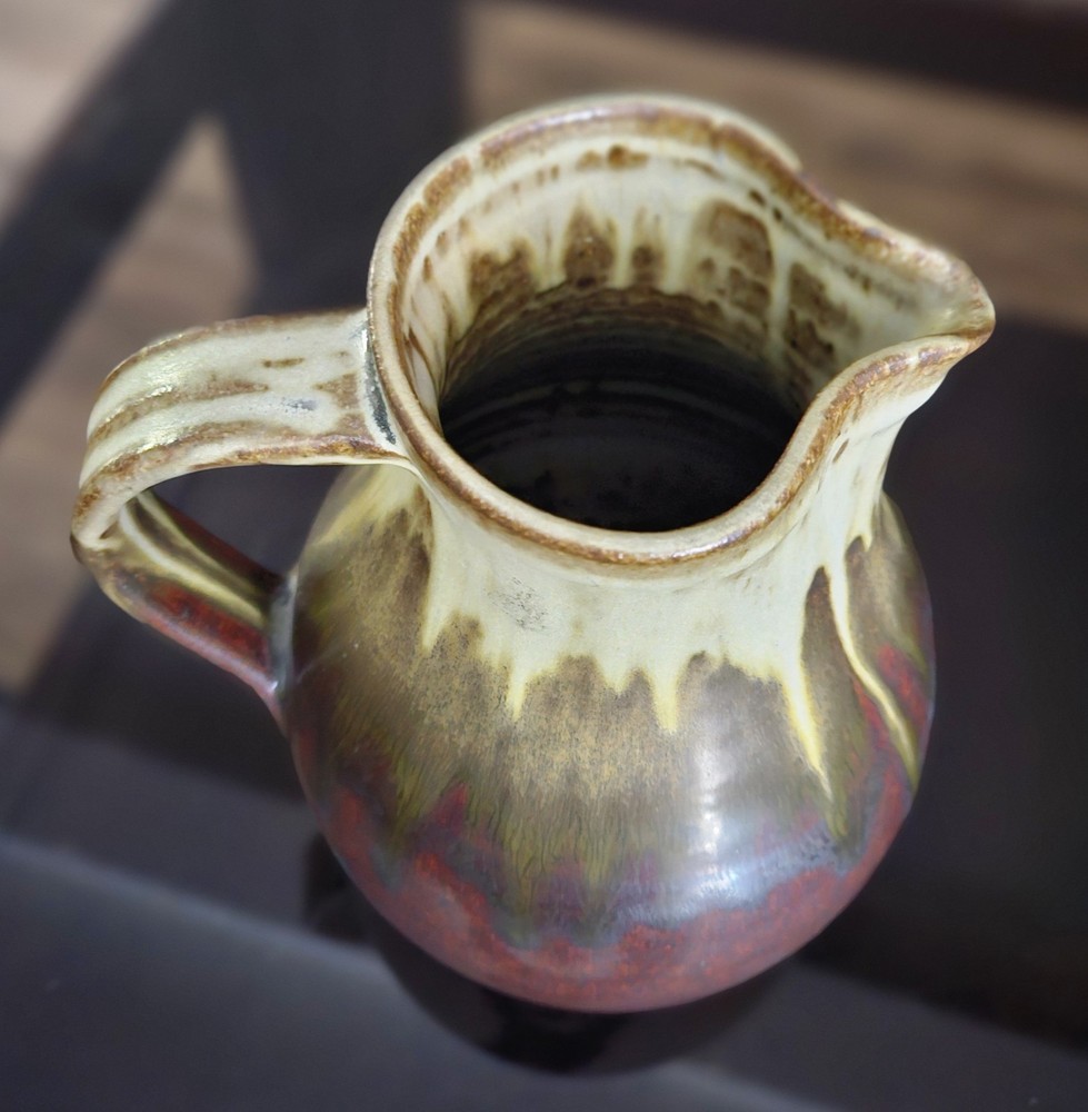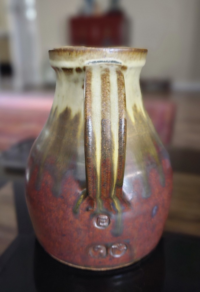 Vintage studio art pottery stoneware drip glaze pitcher. 7"H x 5"W at base. 3 stamps on back of pitcher under handle. There's an E inside a circle and then below that there is a 3 in a circle & at Pt inside another circle. ***See last photo for stamps.*** I am not sure when or where this item was made. No chips, cracks or damage. In mint condition.