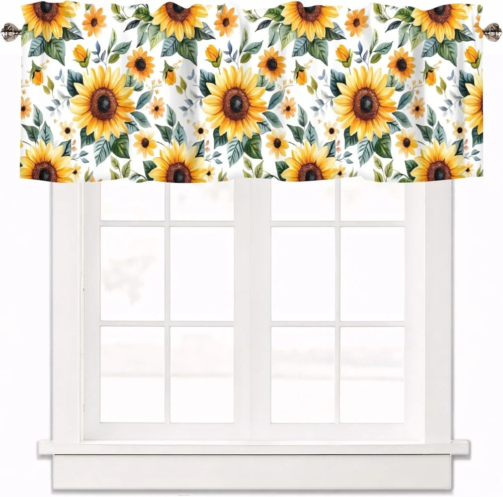 STANDARD SIZE : Sunflower curtain valance measures 18" H x 54" W with 1" header and 3" rod pocket for Hanging. QUALITY FABRIC: These kitchen valances are made of durable polyester blend fabric with delicate printed, these valances are light filtering and allow a bit of light to still come through. ROD POCKET Construction: Our vintage summer floral kitchen curtains are with 3 inches rod pocket on top, fits most standard rods or decorative curtain rod / pole, easy to install.Wrinkle free. IDEAL HOME DECORATION: This tailored valances matching with curtain panels well (similar designed pattern), small valances for windows, perfect to cover the upper window of your kitchen, bathroom, laundry room, cafe, studio and so on.Thses attractive and chic curtain valances for kitchen windows,adding a touch of bright color to your home decoration. EASY TO CARE: Machine washable in cold water, tumble dry. Quick ironing or steam clean as needed. These curtain valances for windows can be combined with coordinating tier curtains.