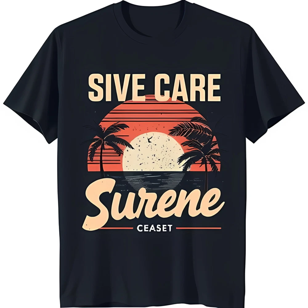 Vintage Sunset Graphic Black T-Shirt with 'Sive Care Surene' Design Nostalgic
