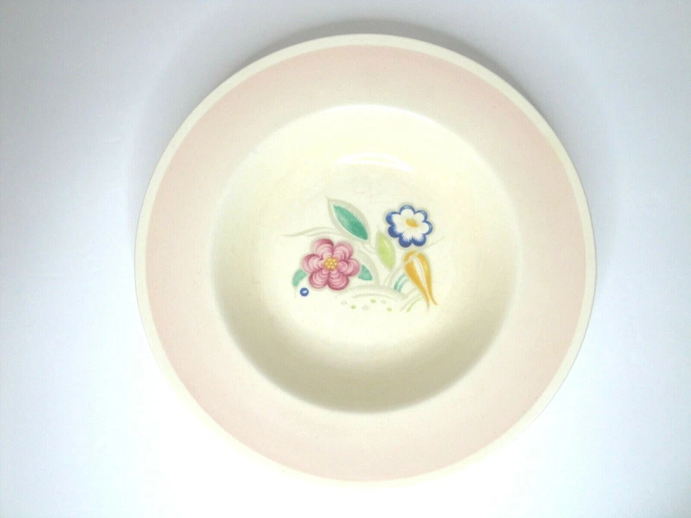 Vintage Susie Cooper Pink Nosegay Rimmed Soup Bowl, Burslem England. Good Condition, no cracks or chips, minor wear, does have crazing on the inside of the bowl; 8 1/8” in diameter, 1 3/8” high. Display stand in picture is not included. Please read the description carefully and ask any questions prior to buying. Thanks for your interest!