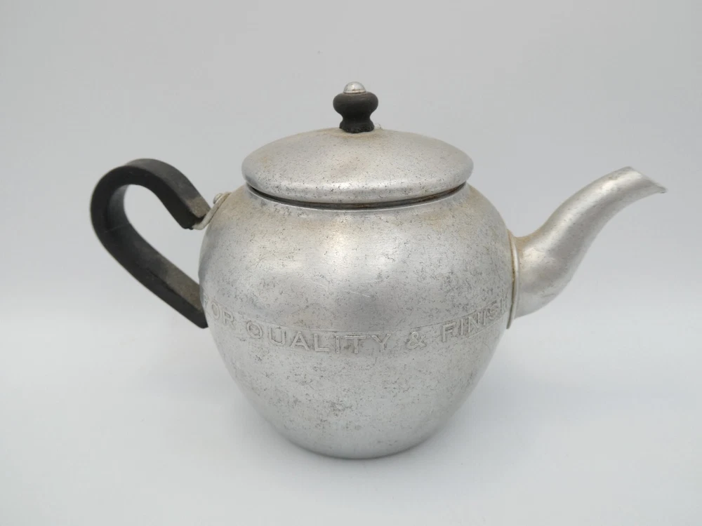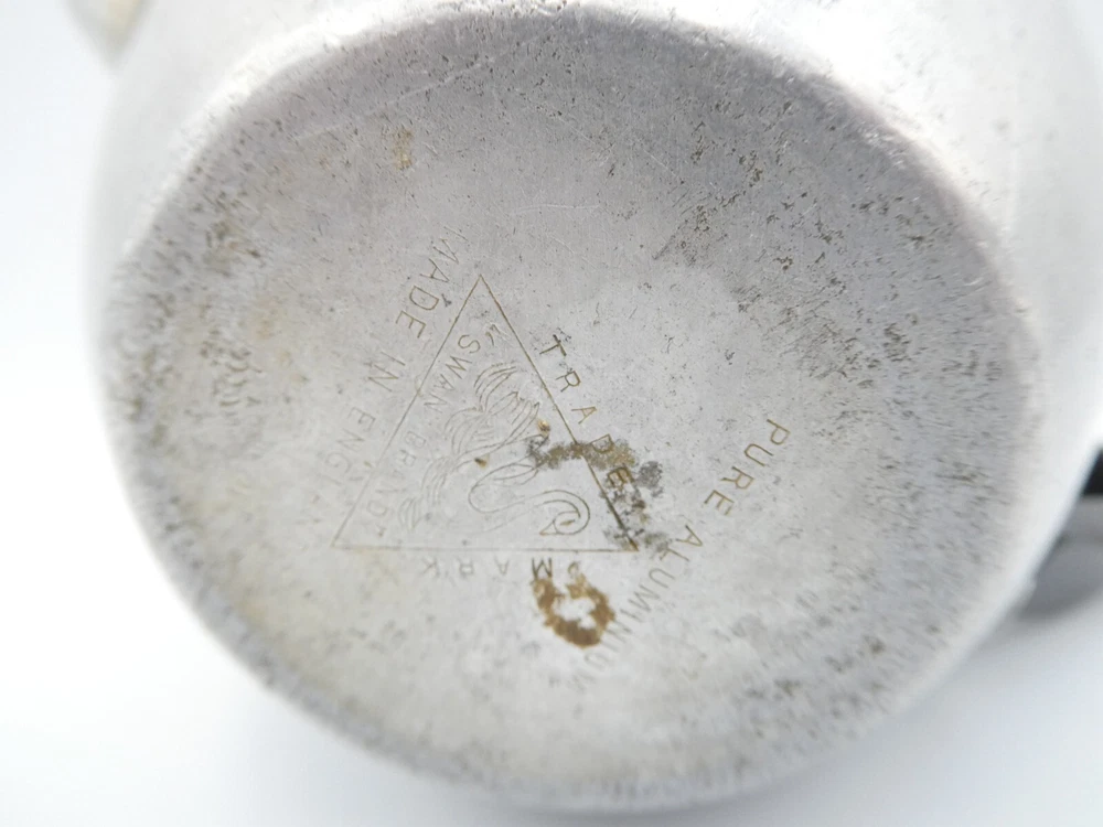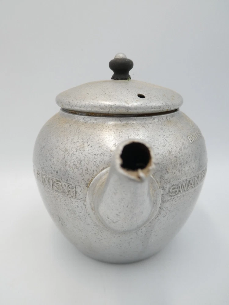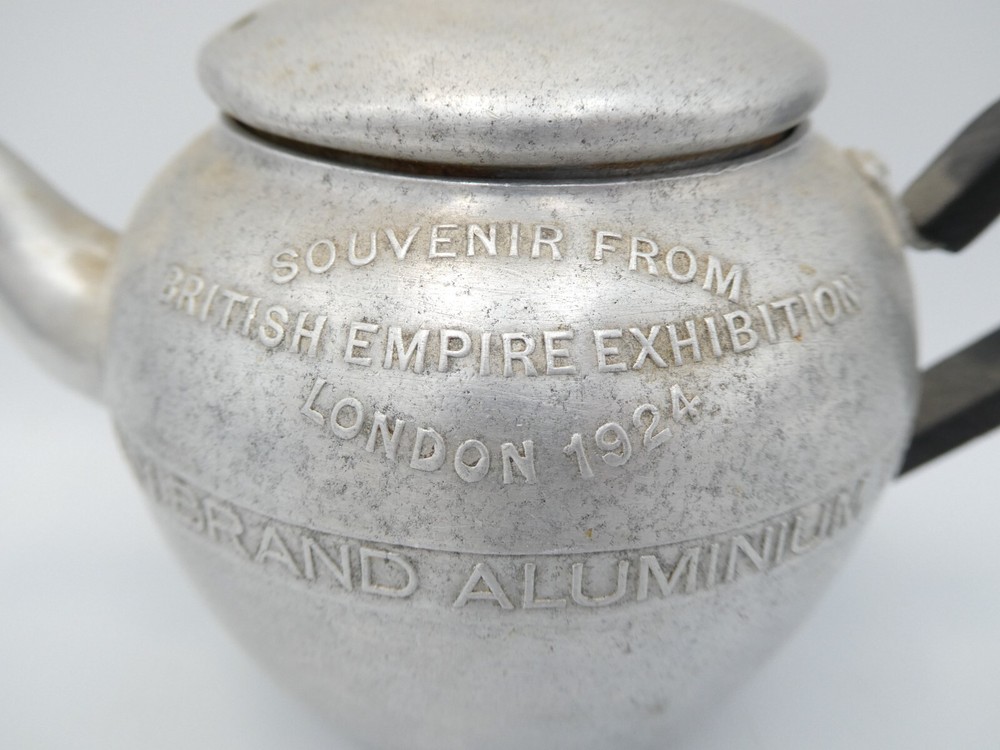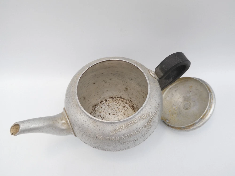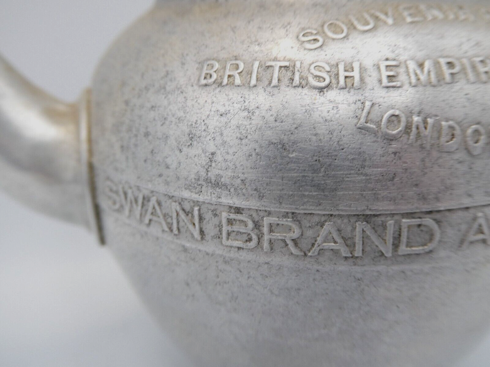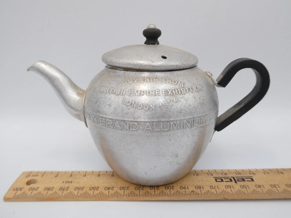 SMALL SWAN BRAND ALUMINIUM TEAPOT BRITISH EMPIRE EXHIBITION LONDON 1924 SOUVENIR GOOD USED CONDITION - CRACK LINE IN THE HANDLE - DENTS TO THE LID - ROUGH END TO SPOUT GENERAL WEAR 16 CM SPOUT TO HANDLE SEE PHOTOS FOR BEST GUIDE I AM LISTING SOME OTHER PIECES I can combine for postage. CHECK MY OTHER LISTINGS FOR MORE