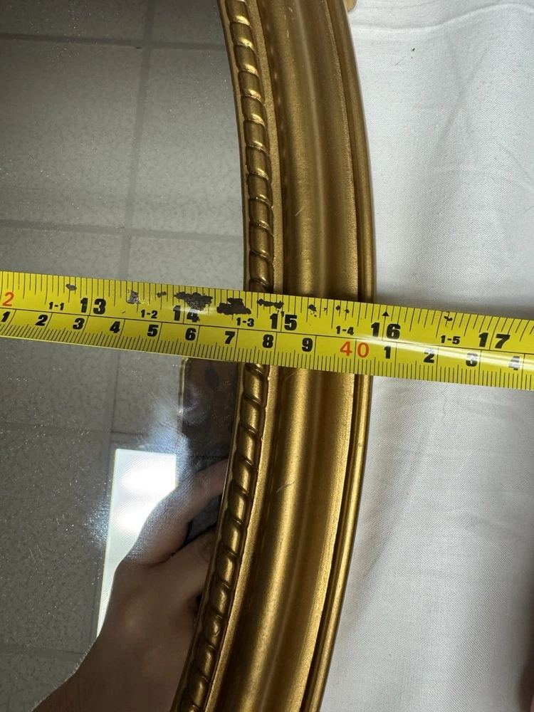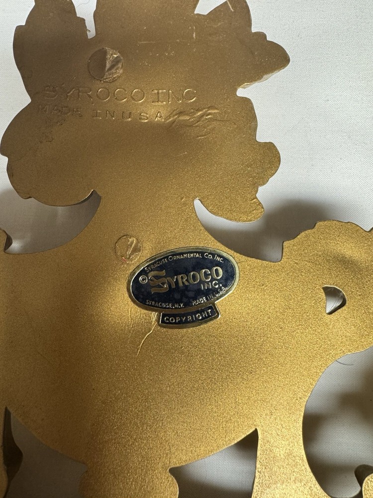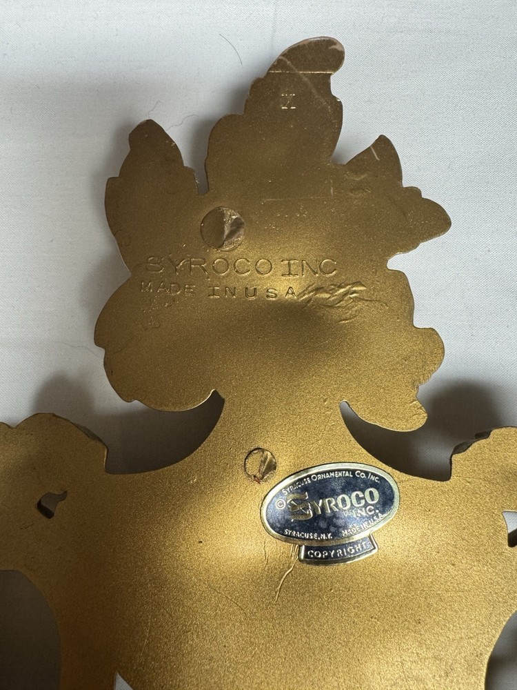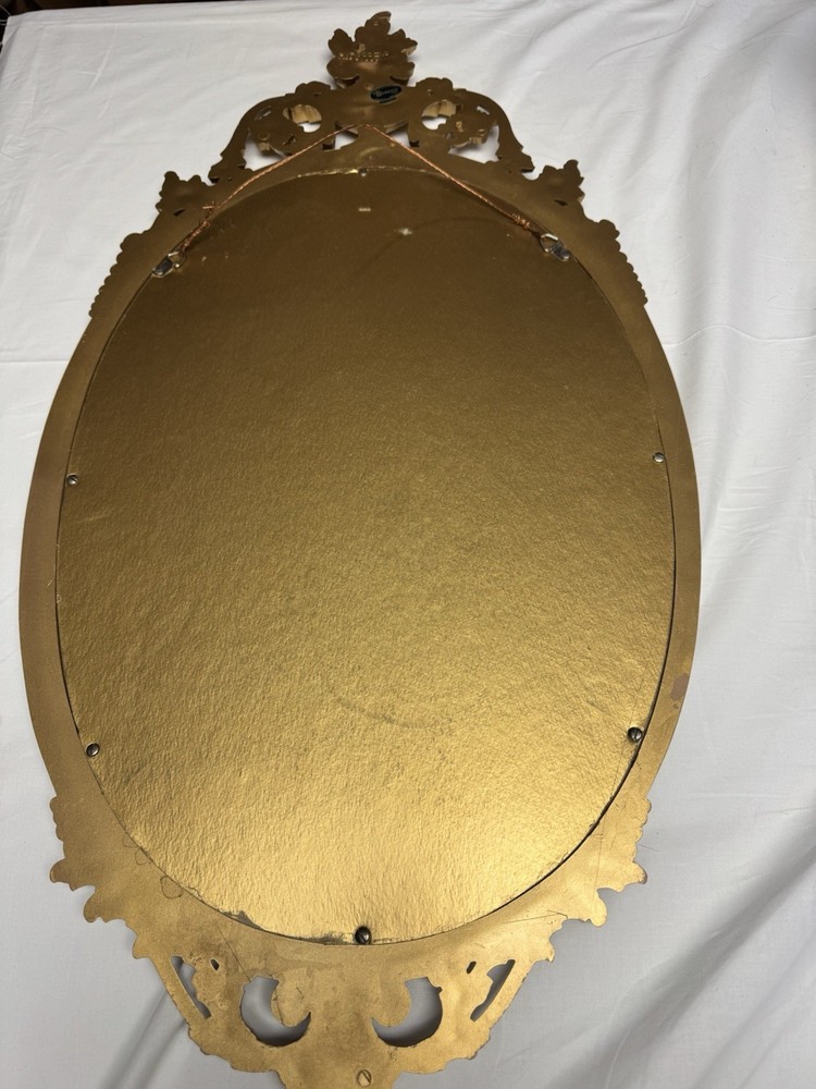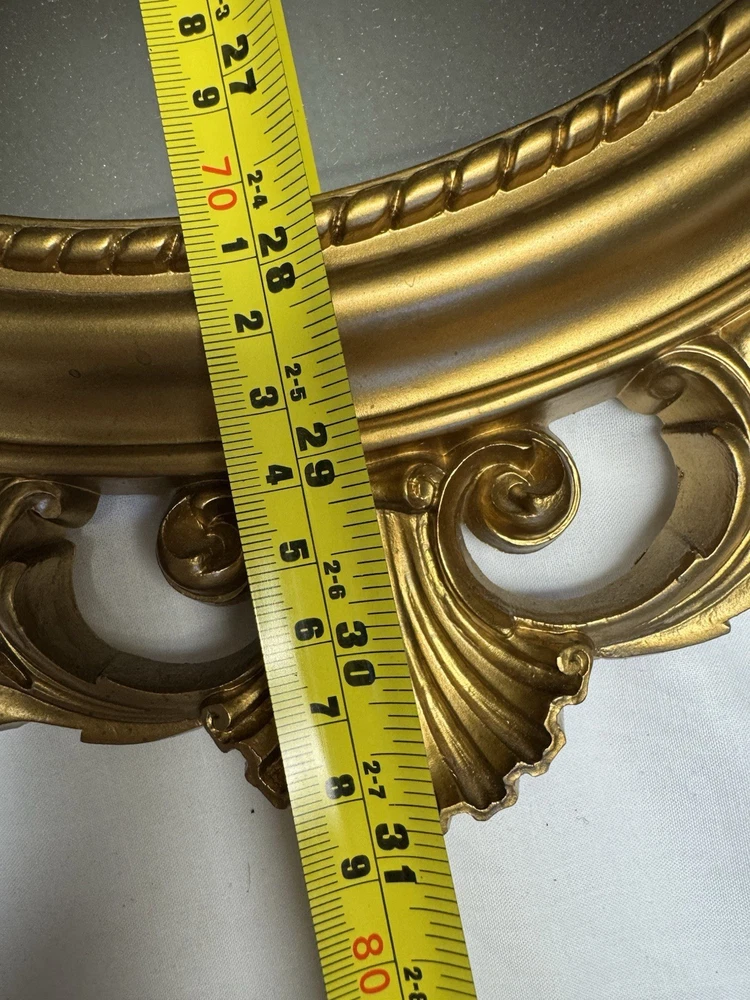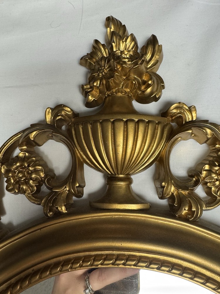 The Syroco Gold Ornate Mirror is a vintage piece from 1965 with a plastic frame in a beautifully crafted gold finish. This arched mirror, standing at 31 inches tall, features intricate floral patterns in the Art Deco style. Made by Syroco in the United States, this original framed mirror adds a touch of elegance to any room with its asymmetrical surface shape and mirrored frame finish. Perfect for teens and adults, this unique piece is a great addition to any home decor looking to bring a touch of mid 20th-century charm.