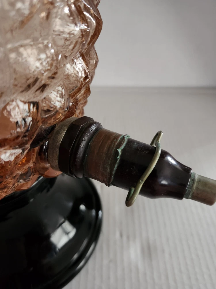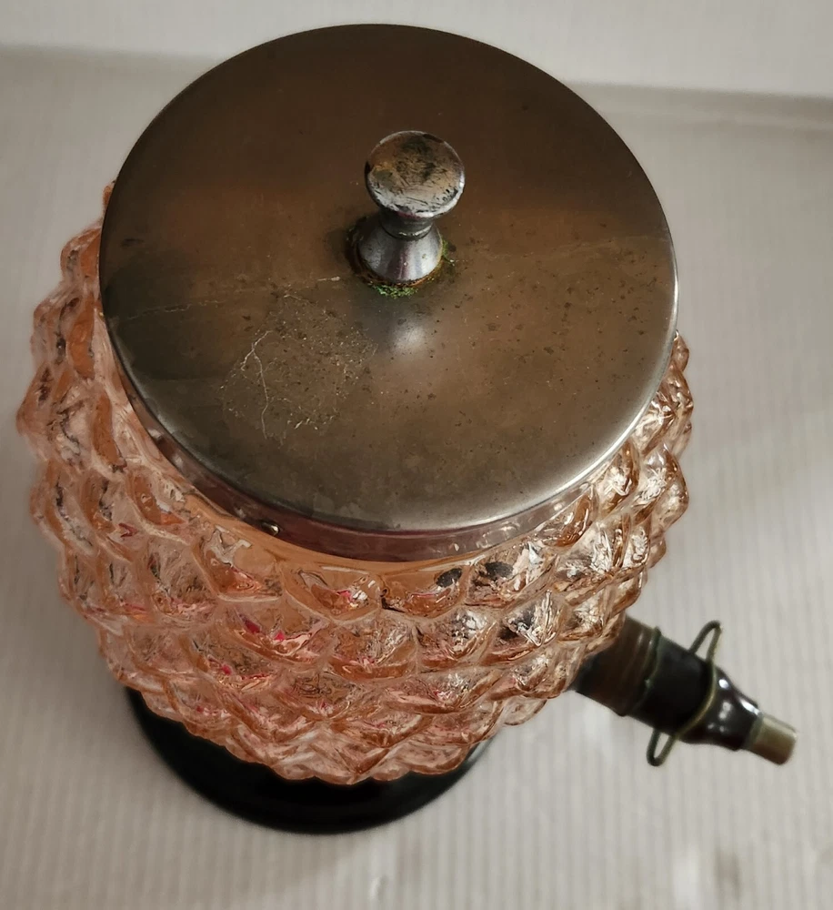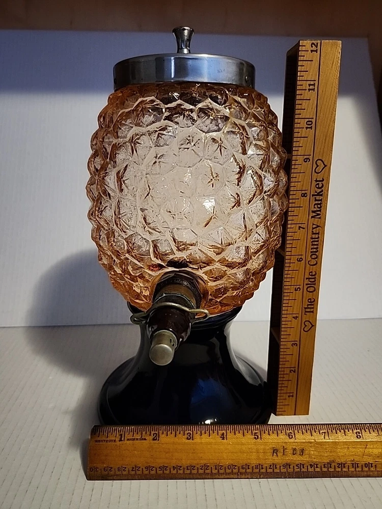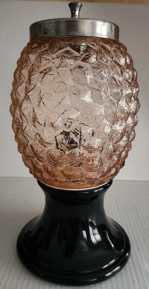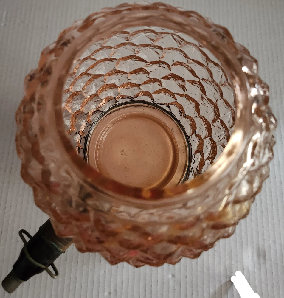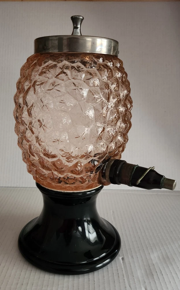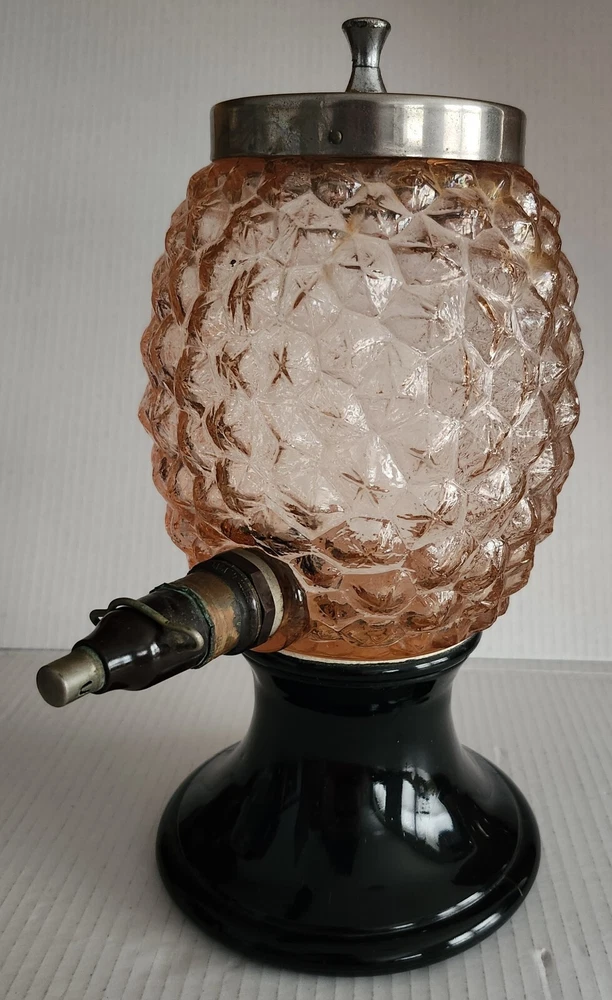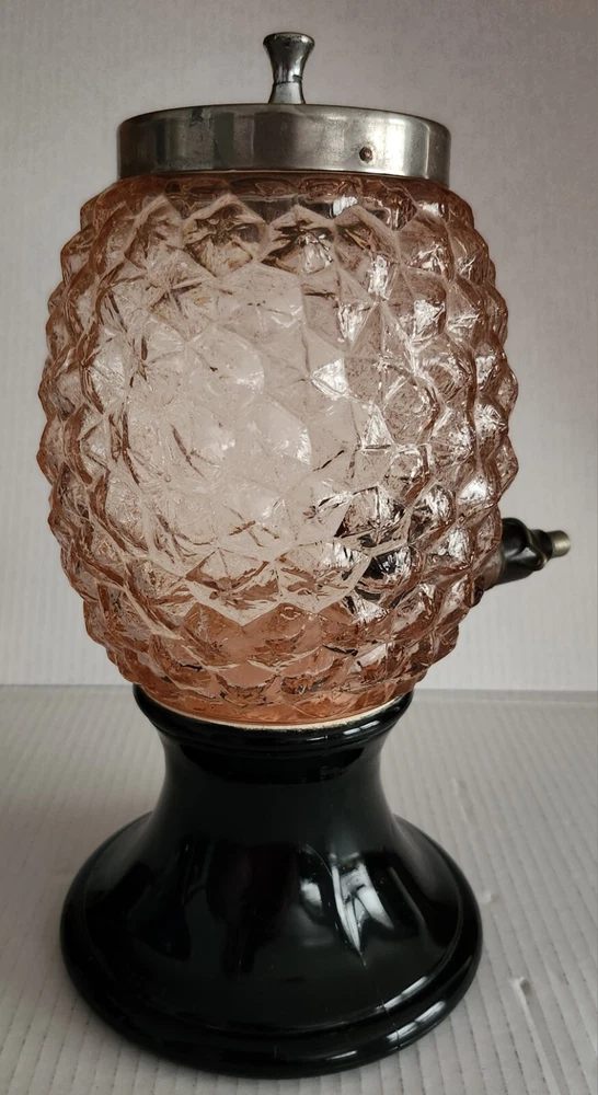 This vintage syrup dispenser ? or absinthe? is a unique addition to any collection. I am not sure exactly what type of dispenser I AM NOT an Expert. Please do your own research and come up with your own conclusion before you decide to purchase. The pineapple shape pink depression glass and black glass base make it a charming piece that is sure to catch the eye. The dispenser is an original and the spout dated September 4th 1917 and C & H NY ( New York). The Bottom Back of Base reads South Seas Patent 78123. The country/region of manufacture is unknown, adding to the mystery and intrigue of this vintage item. Please see photos as part of description. The metal lid appears to be original to the piece the knob and screw are rusted. The top rim does have a hairline but not rough chipped or cracked its very smooth i think its a manufacture defect. There is a yellow line of residue towards the top a small amount just looks discolored i tried cleaning with no luck. Please feel free to message me with any questions or concerns. Update an ebayer just message me saying it might have had a rubber lid .... I feel the is original lid because it's not a tight screw on lid with threads and the glass has no threads. The lid on inside have metal nubs that seem to be original. But again I cant find another one that shows correct lid.