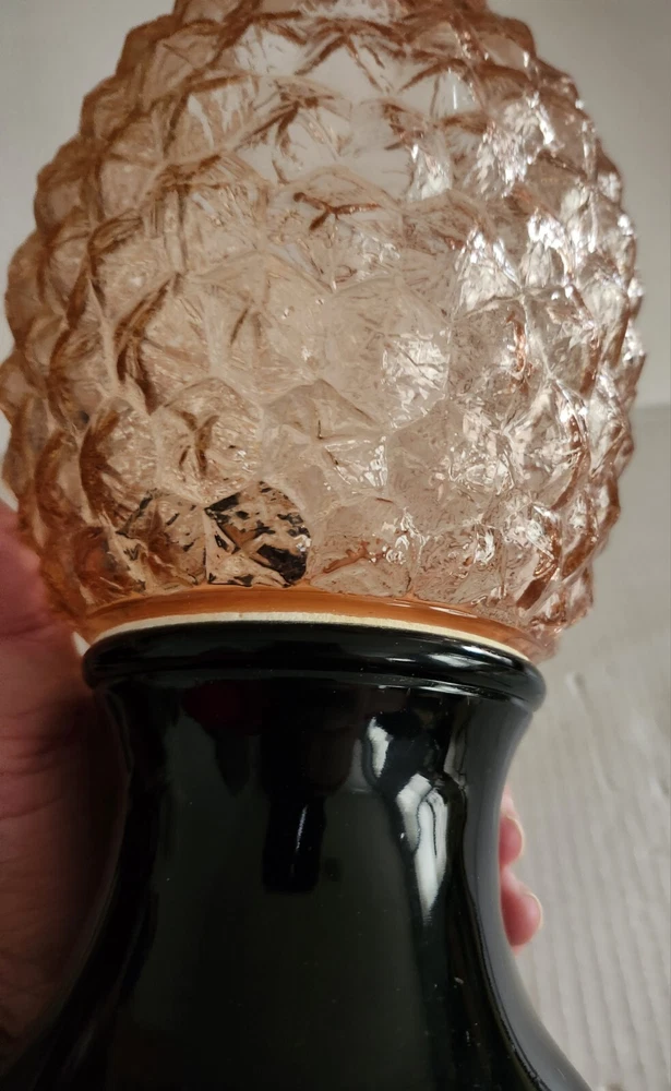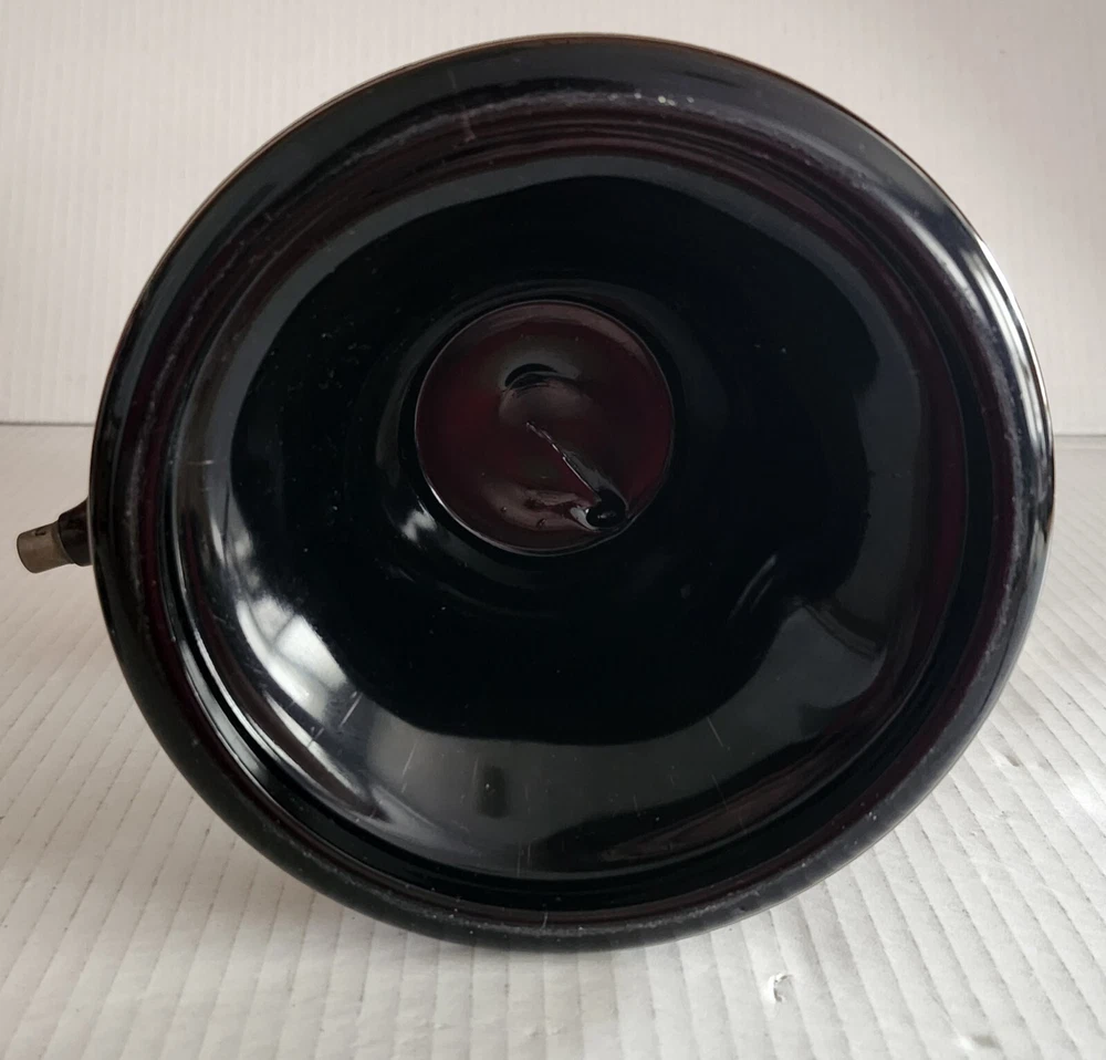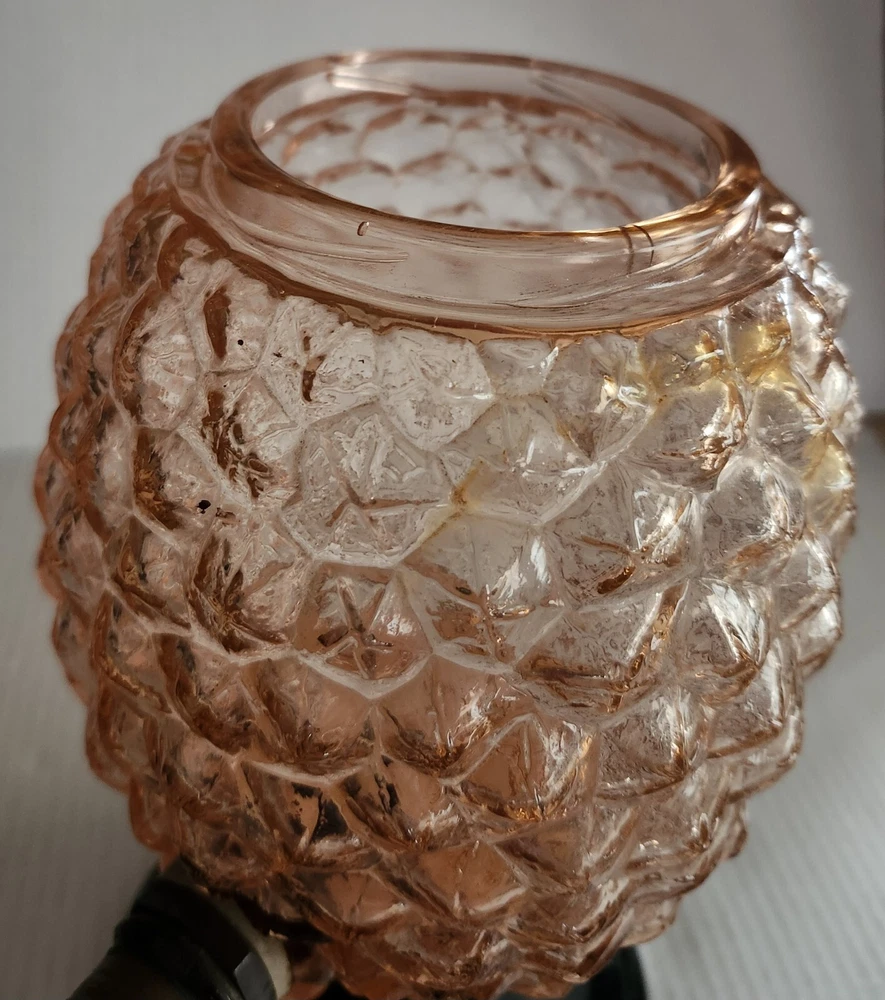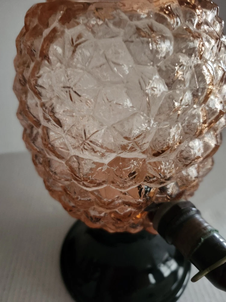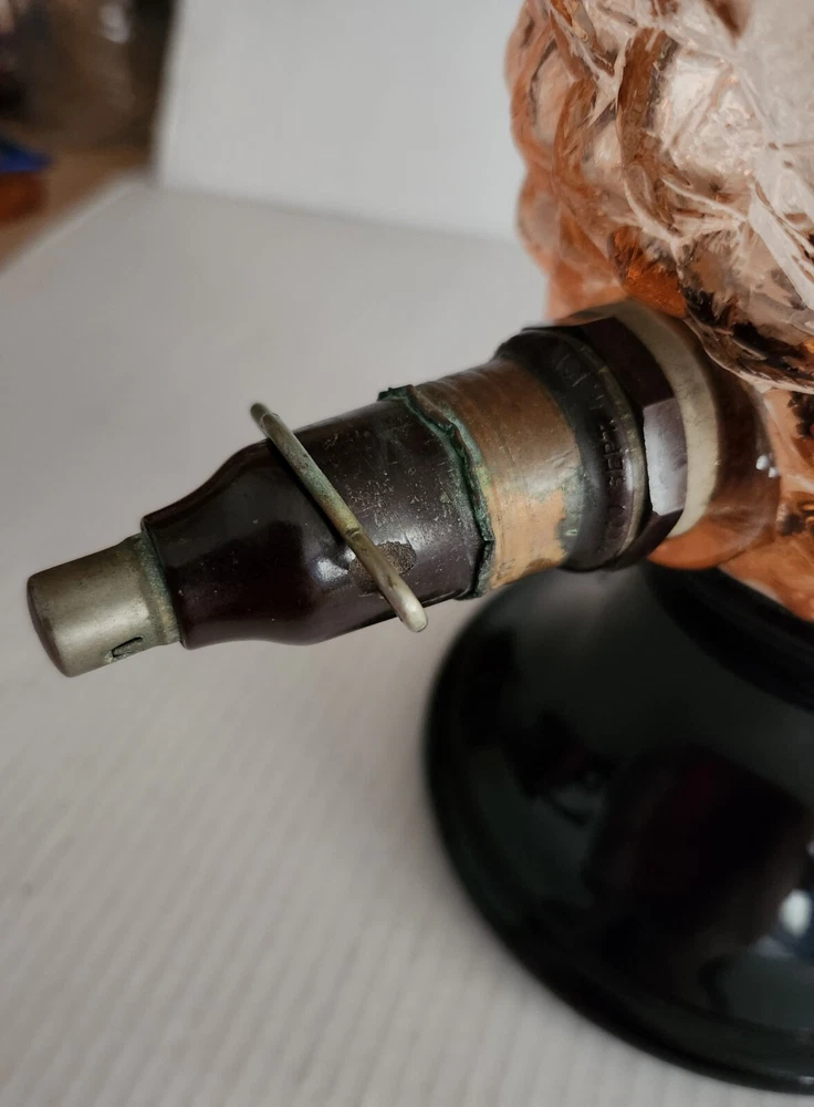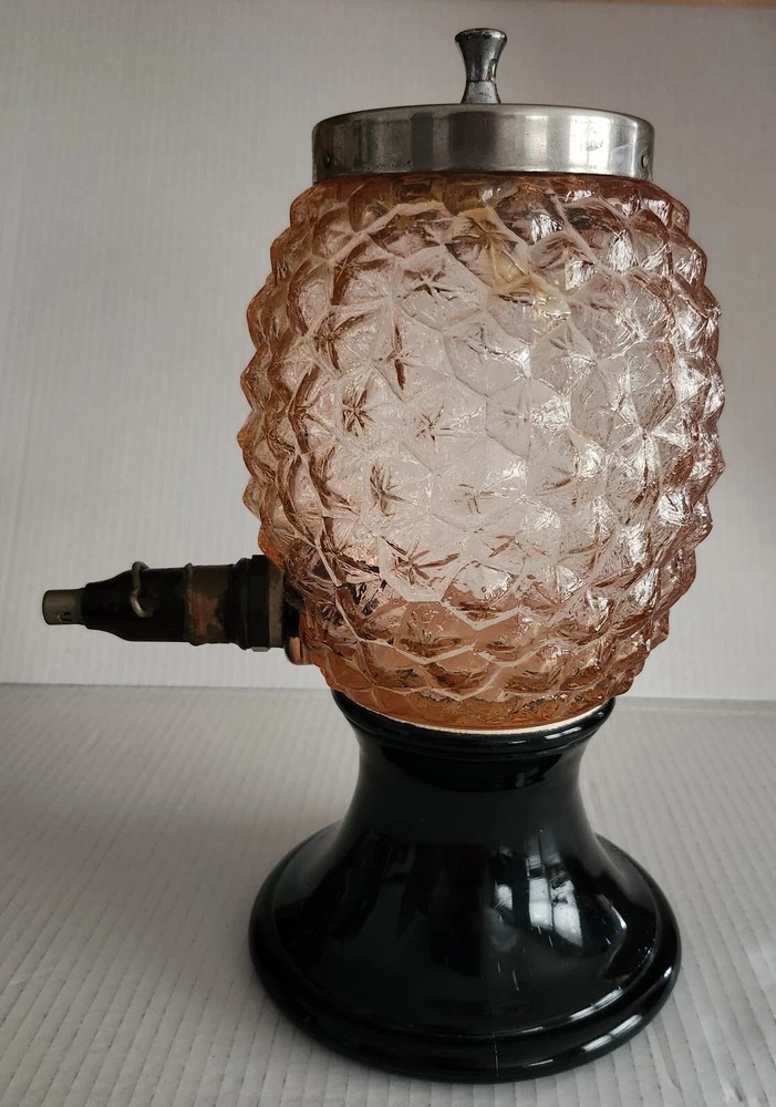 This vintage syrup dispenser ? or absinthe? is a unique addition to any collection. I am not sure exactly what type of dispenser I AM NOT an Expert. Please do your own research and come up with your own conclusion before you decide to purchase. The pineapple shape pink depression glass and black glass base make it a charming piece that is sure to catch the eye. The dispenser is an original and the spout dated September 4th 1917 and C & H NY ( New York). The Bottom Back of Base reads South Seas Patent 78123. The country/region of manufacture is unknown, adding to the mystery and intrigue of this vintage item. Please see photos as part of description. The metal lid appears to be original to the piece the knob and screw are rusted. The top rim does have a hairline but not rough chipped or cracked its very smooth i think its a manufacture defect. There is a yellow line of residue towards the top a small amount just looks discolored i tried cleaning with no luck. Please feel free to message me with any questions or concerns. Update an ebayer just message me saying it might have had a rubber lid .... I feel the is original lid because it's not a tight screw on lid with threads and the glass has no threads. The lid on inside have metal nubs that seem to be original. But again I cant find another one that shows correct lid.