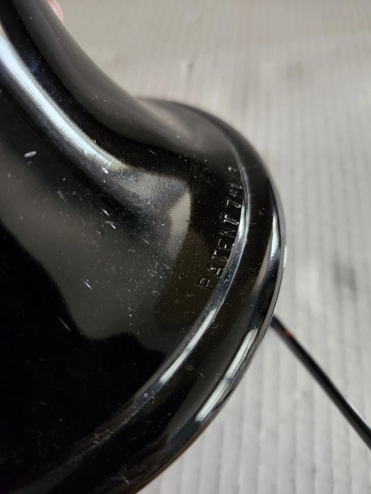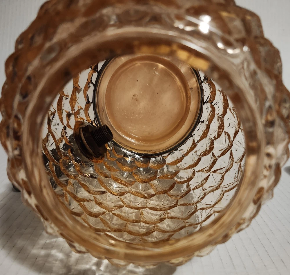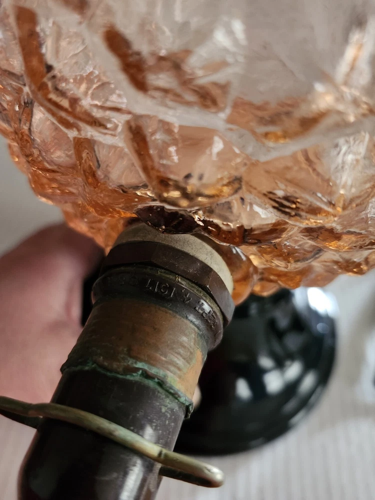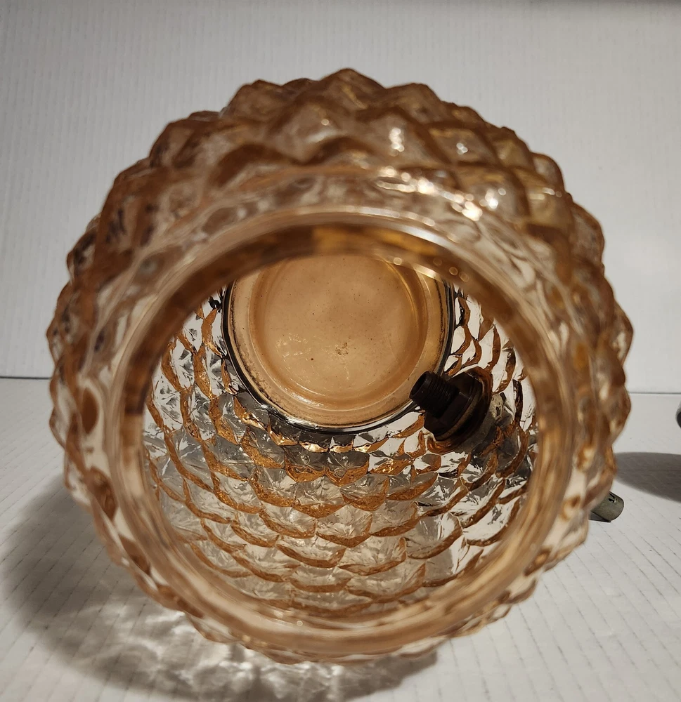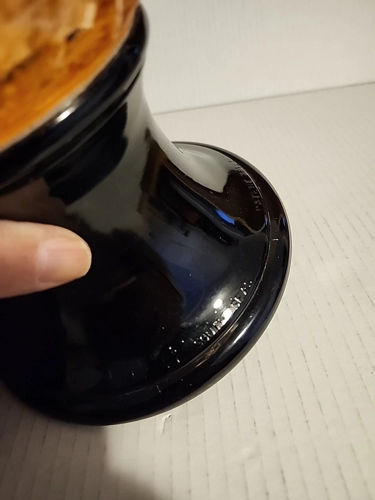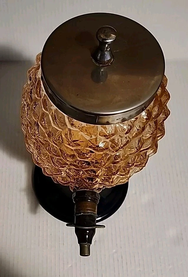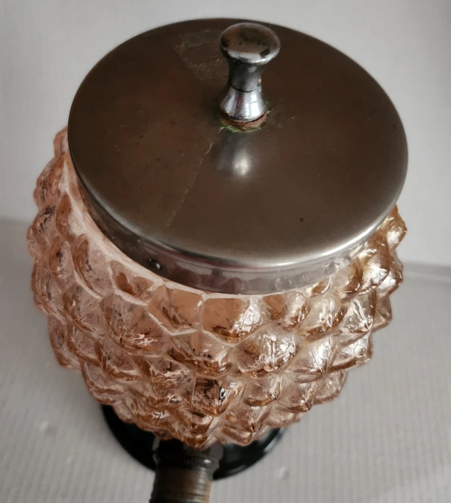 This vintage syrup dispenser ? or absinthe? is a unique addition to any collection. I am not sure exactly what type of dispenser I AM NOT an Expert. Please do your own research and come up with your own conclusion before you decide to purchase. The pineapple shape pink depression glass and black glass base make it a charming piece that is sure to catch the eye. The dispenser is an original and the spout dated September 4th 1917 and C & H NY ( New York). The Bottom Back of Base reads South Seas Patent 78123. The country/region of manufacture is unknown, adding to the mystery and intrigue of this vintage item. Please see photos as part of description. The metal lid appears to be original to the piece the knob and screw are rusted. The top rim does have a hairline but not rough chipped or cracked its very smooth i think its a manufacture defect. There is a yellow line of residue towards the top a small amount just looks discolored i tried cleaning with no luck. Please feel free to message me with any questions or concerns. Update an ebayer just message me saying it might have had a rubber lid .... I feel the is original lid because it's not a tight screw on lid with threads and the glass has no threads. The lid on inside have metal nubs that seem to be original. But again I cant find another one that shows correct lid.