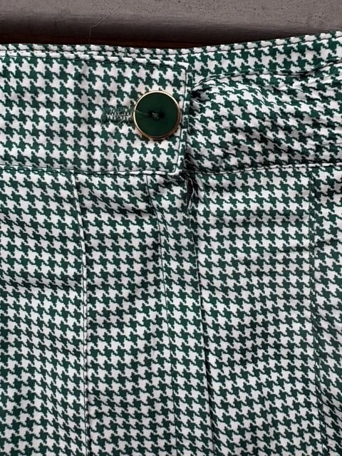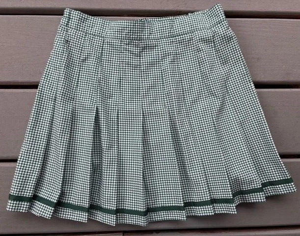 This is a listing for a pre-owned vintage Tail tennis skirt in a size 8 (modern small). It is made in the USA and has a green grosgrain ribbon trim and elastic side panels at waist. It has a back zipper closure and cute enamel green button with gold trim. Please ask all questions prior to auction end for all sales are final. Thank you & good luck! BRAND: TAIL SIZE: Vintage US size 8. 13.5" across waist lying flat, 15.5" in length Fabric: 100% polyester Unlined Made in USA