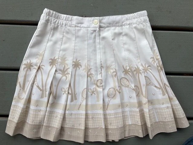 This is a listing for a pre-owned vintage Tail tennis skirt in a size 8 (modern small). It is made in the USA and has an adorable palm tree tennis racquet & ball graphic print and elastic side panels at waist. It has a back zipper closure. Please ask all questions prior to auction end for all sales are final. Thank you & good luck! BRAND: TAIL SIZE: Vintage US size 8. 14" across waist lying flat, 15.5" in length Fabric: 100% polyester Unlined Made in USA