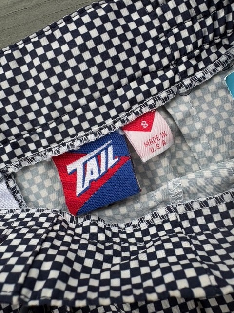 This is a listing for a pre-owned vintage Tail tennis skirt in a size 8 (modern small). It is made in the USA and has a yellow grosgrain ribbon trim and elastic side panels at waist. It has a back zipper closure. Please ask all questions prior to auction end for all sales are final. Thank you & good luck! BRAND: TAIL SIZE: Vintage US size 8. 14" across waist lying flat, 15" in length Fabric: 100% polyester Unlined Made in USA