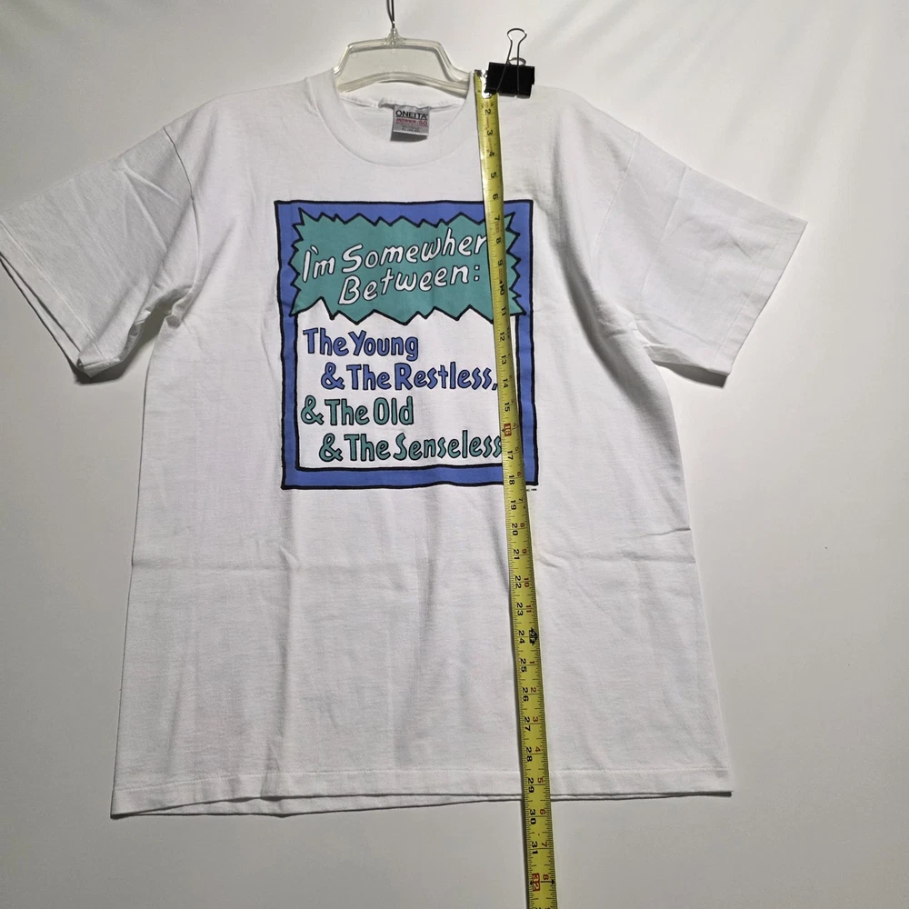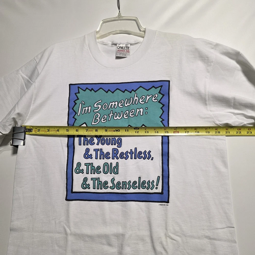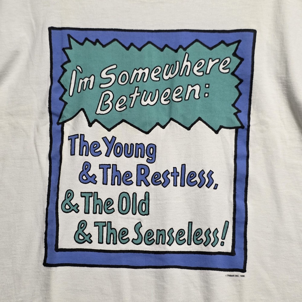 Vintage 1990 Trisar Inc I am somewhere between The young and the restless and the old and senseless Soap Opera Daytime Television T shirt size XL please see photos for measurements and condition. Light yellowing on neck collar.
