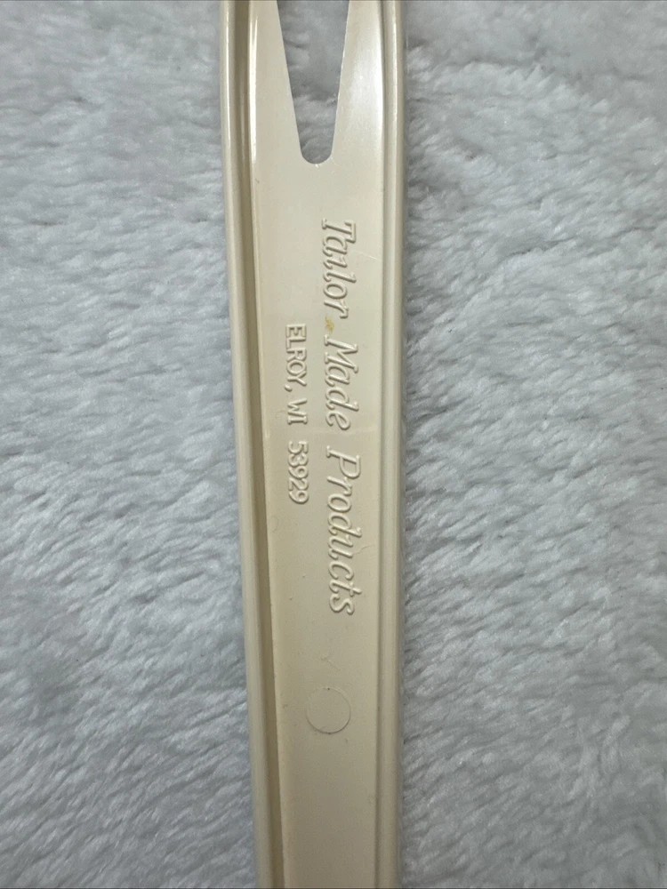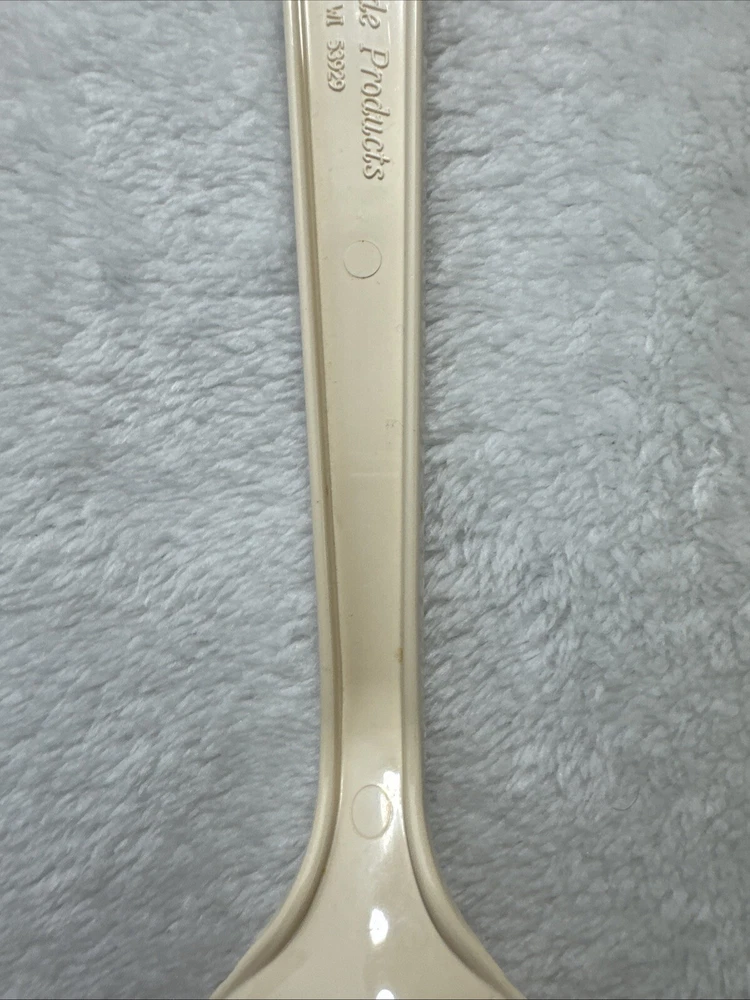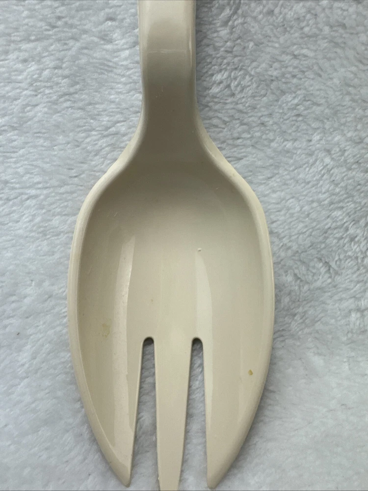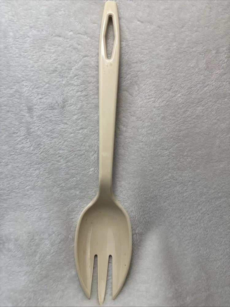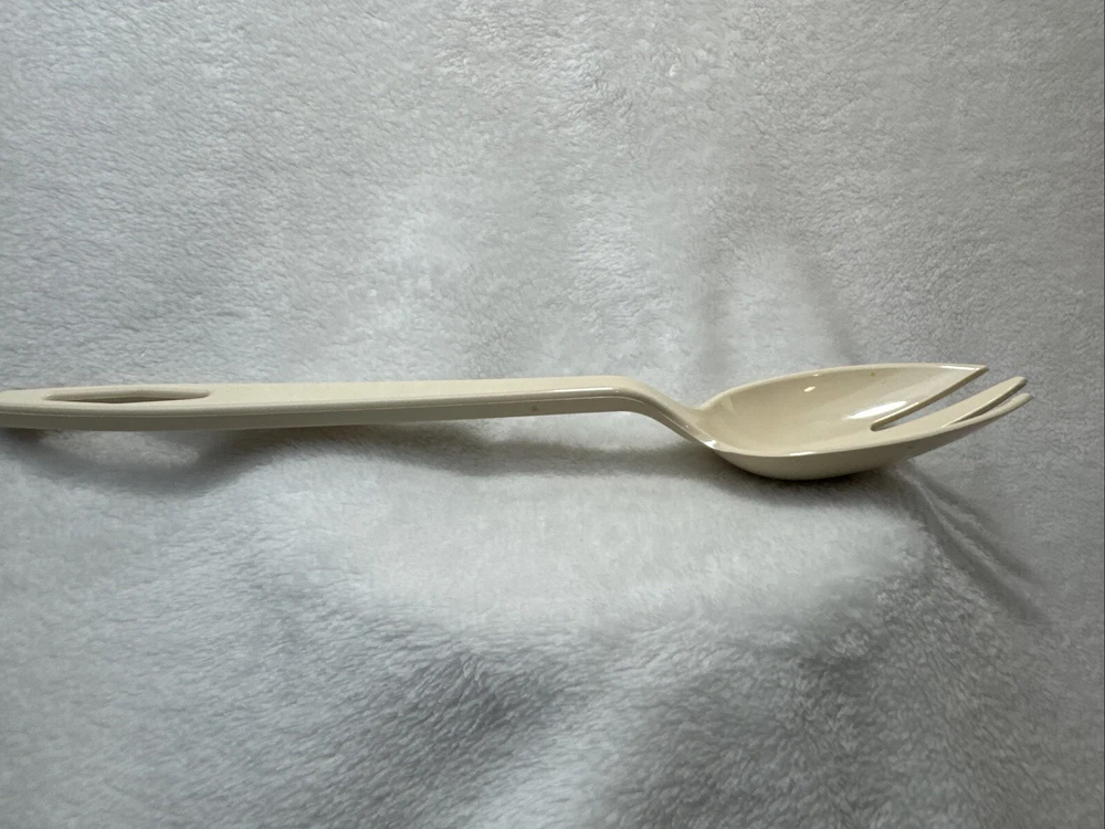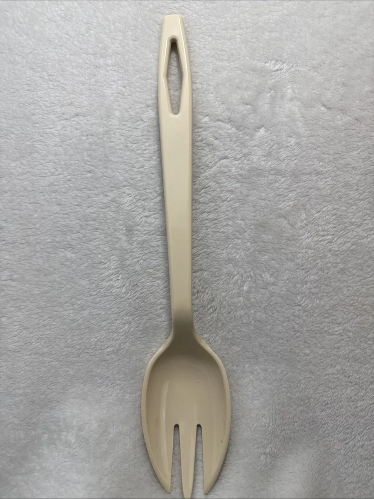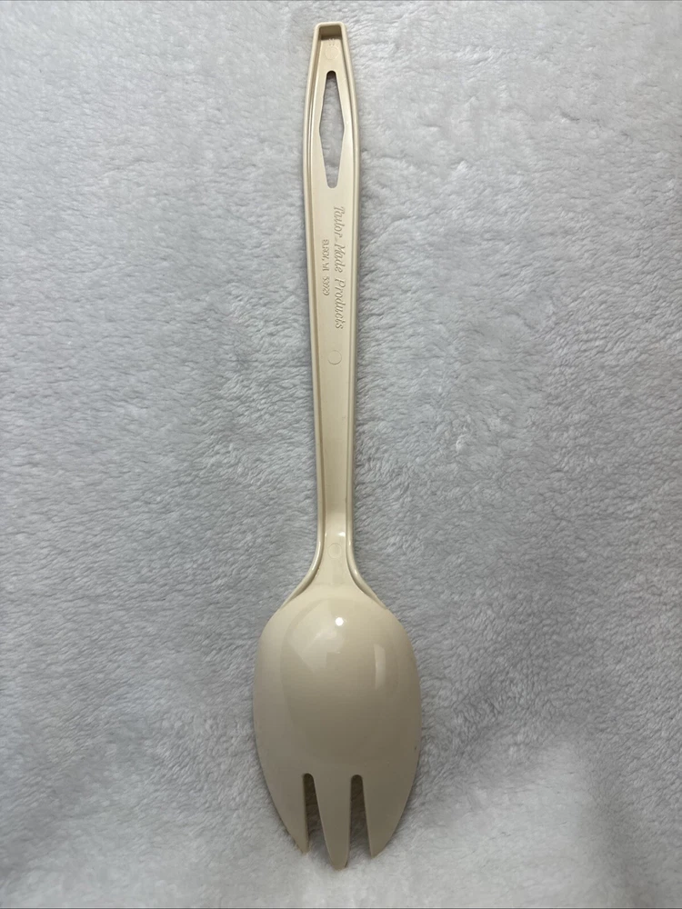 This vintage Tailor Made Products spork serving spoon fork is a unique addition to any kitchen. With an oval shape and almond color, it is perfect for any universal food compatibility. The handle is included and it is made of plastic/nylon material. This original piece was manufactured between 1960-1969 and is a one-of-a-kind item. It is perfect for collectors or anyone looking for a rare kitchen gadget. The set includes one spork and is an excellent addition to any kitchen tools and gadgets collection.