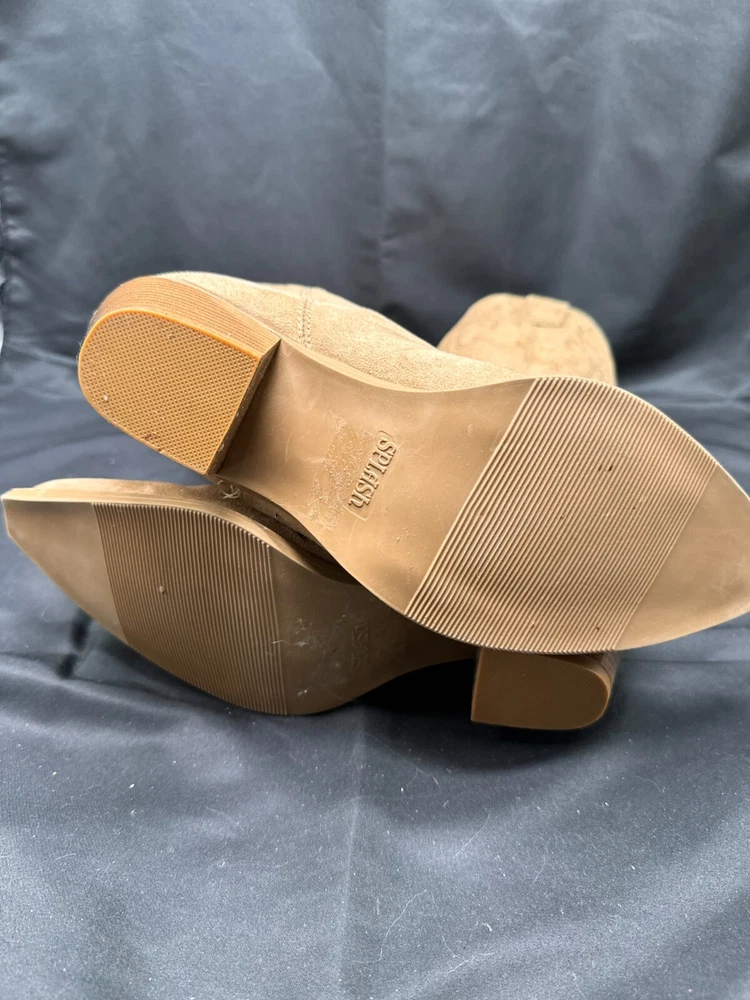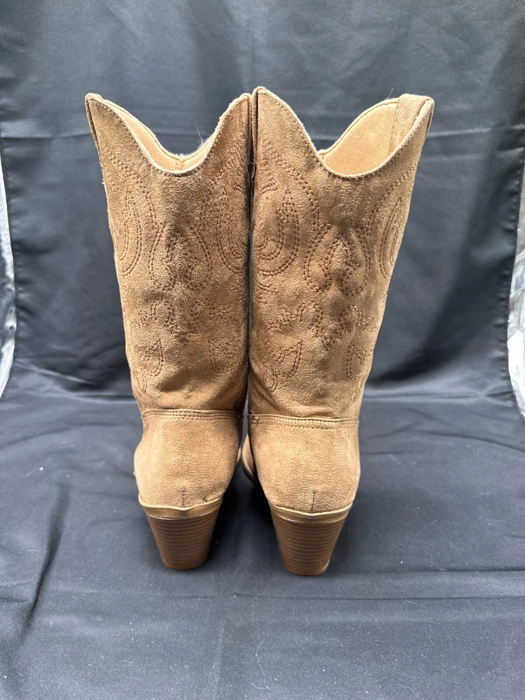 Vintage Splash Tan Western Faux Suede Heeled Cowgirl Boots Size 5 Step out in style with these vintage Splash cowgirl boots in a beautiful tan color. Made with high-quality faux suede, these boots are perfect for any Western-themed event or casual day out. With a comfortable heel and size 5 fit, they are designed for women who want to look and feel great. The boots feature a classic Western style and are perfect for pairing with any cowgirl outfit or jeans. Get ready to ride the range in style with these stunning Splash boots.