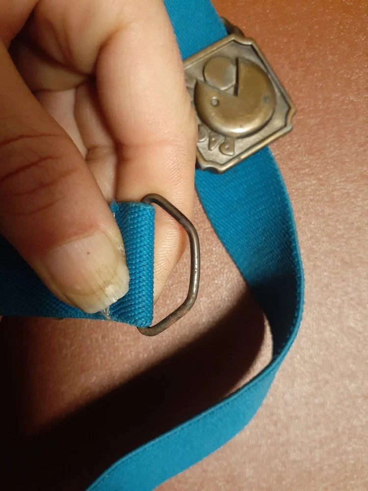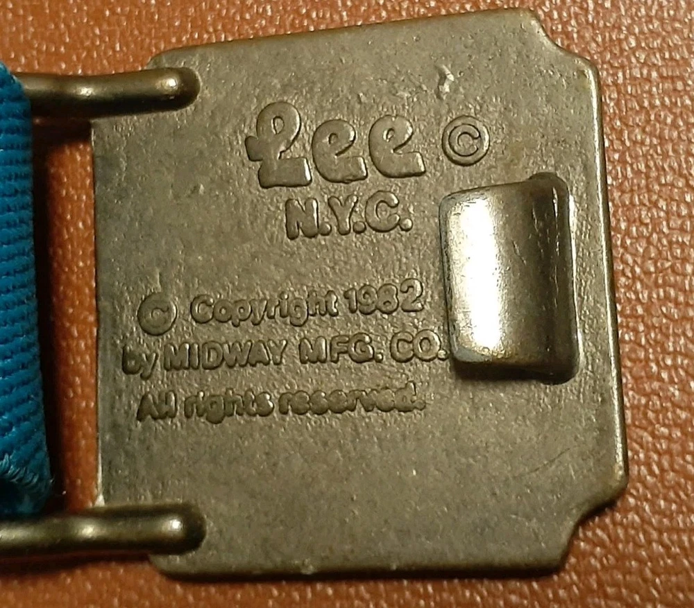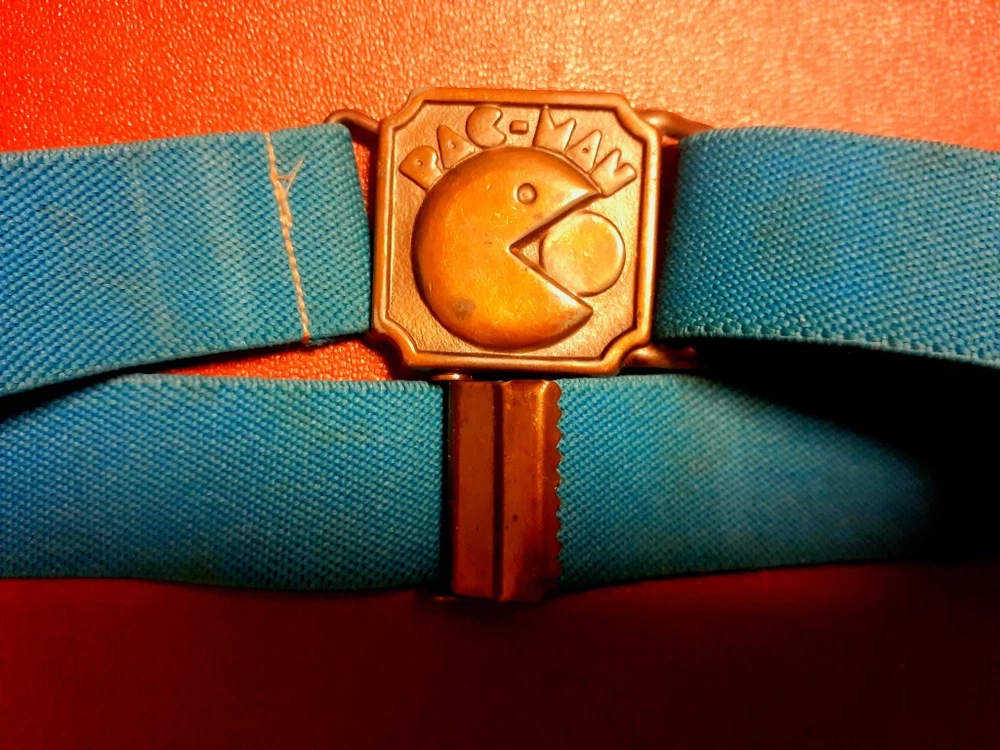 This vintage brass belt buckle from the 1980s features a teal flexible elastic waist design and brass buckle of the popular video game character Pac-Man. An original made by Lee in 1982. The wait band seriously can fit a waist size from a toddler size to an adult measuring 16" smallest- up to 36" stretched reasonably. Has easy secure adjustments. See all pics for details. Has been kept in storage for many years and due to the vintage nature will come as is. Any cleaning will be left to the the new owner and their best discretion. With that being said, my best professional opinion is this item can be cleaned and potentially could look good as new. Seems very durable with a lot of life. Well made. A very cool throw back of accessories and staple of the 80's.