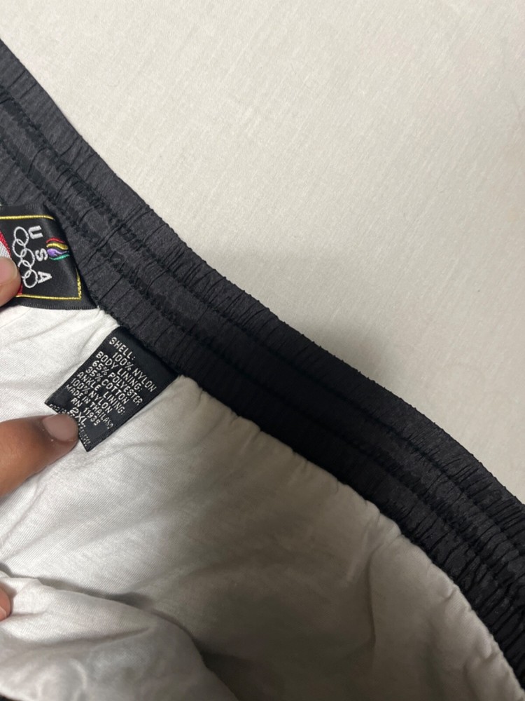 Experience the nostalgia of the '90s with these vintage Team USA Olympic JCPenny Black Nylon Track Pants. Designed to cater to a variety of athletic pursuits from running to skiing, these versatile pants are a testament to the era's commitment to both style and function. Sized at 2XL for a regular fit, they offer a comfortable straight leg style with a convenient pull-on closure, making them ideal for both active days and laid-back evenings. Crafted from lightweight, stretch material, these pants are engineered to support a wide range of activities, ensuring freedom of movement and ease of wear across all seasons. The solid black color and subtle USA theme make them a timeless addition to any activewear collection. Proudly handmade in Thailand, these sweatpants are a unique find for enthusiasts of vintage sports apparel and supporters of made-in-Thailand quality.