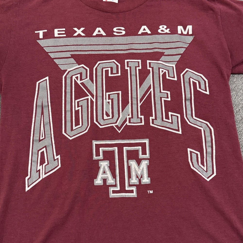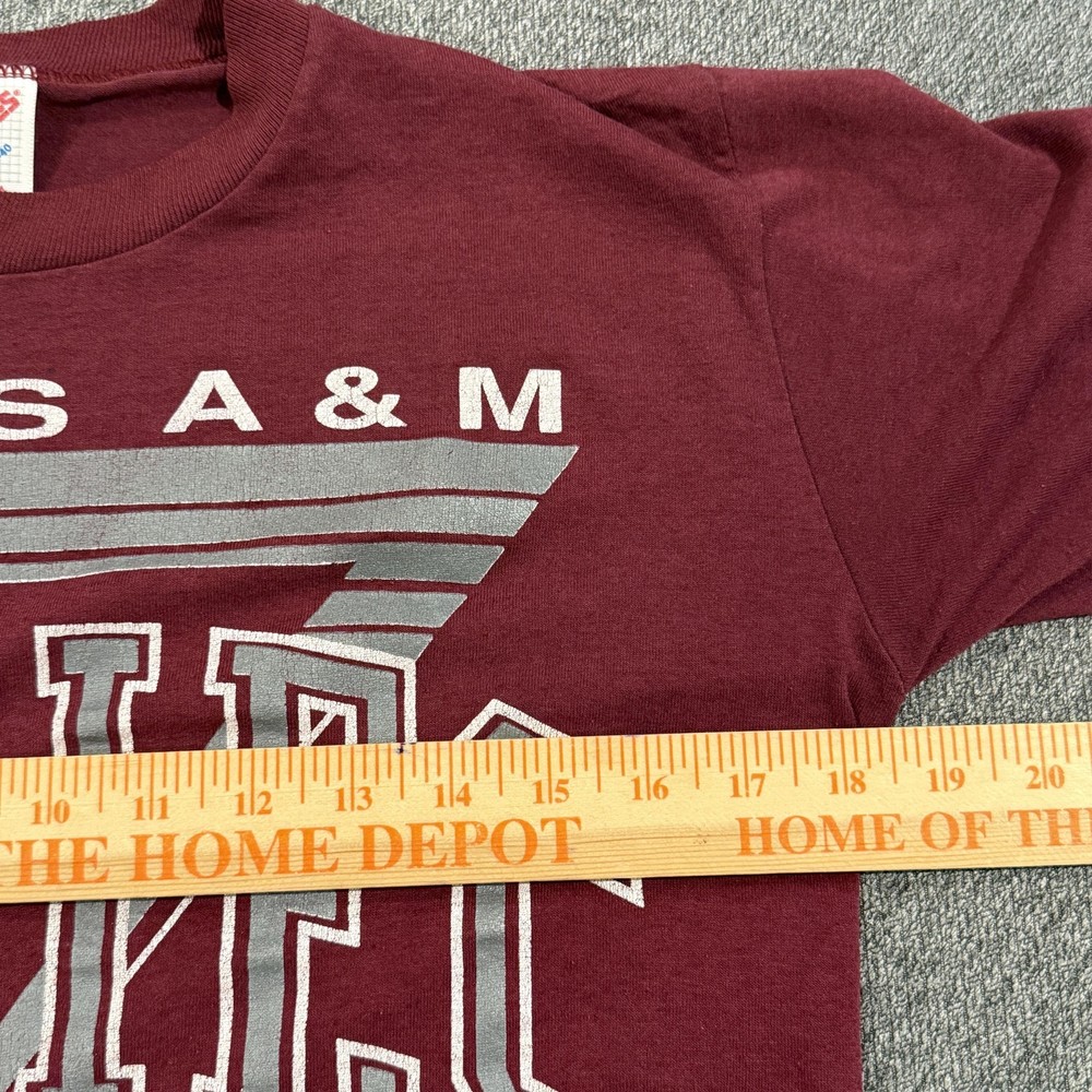 Vintage Texas A&M Aggies Shirt Mens Medium Red NCAA Football Jerzees 90s Single Stitch Tagged Size Medium, Measures like a Small No Major Flaws, or Stains, Two Small Pinholes on the lower back of shirt (shown in pictures) Do not take away from the overall appearance of the shirt, only noticeable up close) Shipped Out FAST, within One Business Day!! *Tracking Information Included (Packaged with Care) Brand: Jerzees Team: Texas A&M Aggies / Texas A&M University Product: Mens short sleeve crewneck graphic shirt with large front collegiate print. Color: Maroon / dark red body with gray and white screen-printed TEXAS A&M AGGIES wordmark and block T A&M logo on front; back is solid with no additional graphics. Tag size: Medium (Mens 38-40) Material: Soft jersey knit fabric; exact fiber content not visible on tag. Details: Vintage Jerzees grid-tag tee featuring ribbed crew neckline, hemmed sleeves and bottom, and bold front Aggies design ideal for Texas A&M NCAA football fans and college sports collectors. 1002