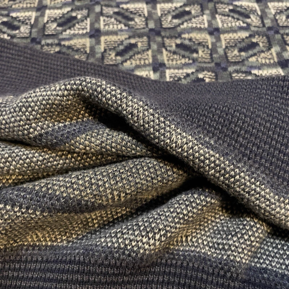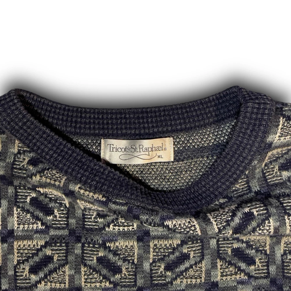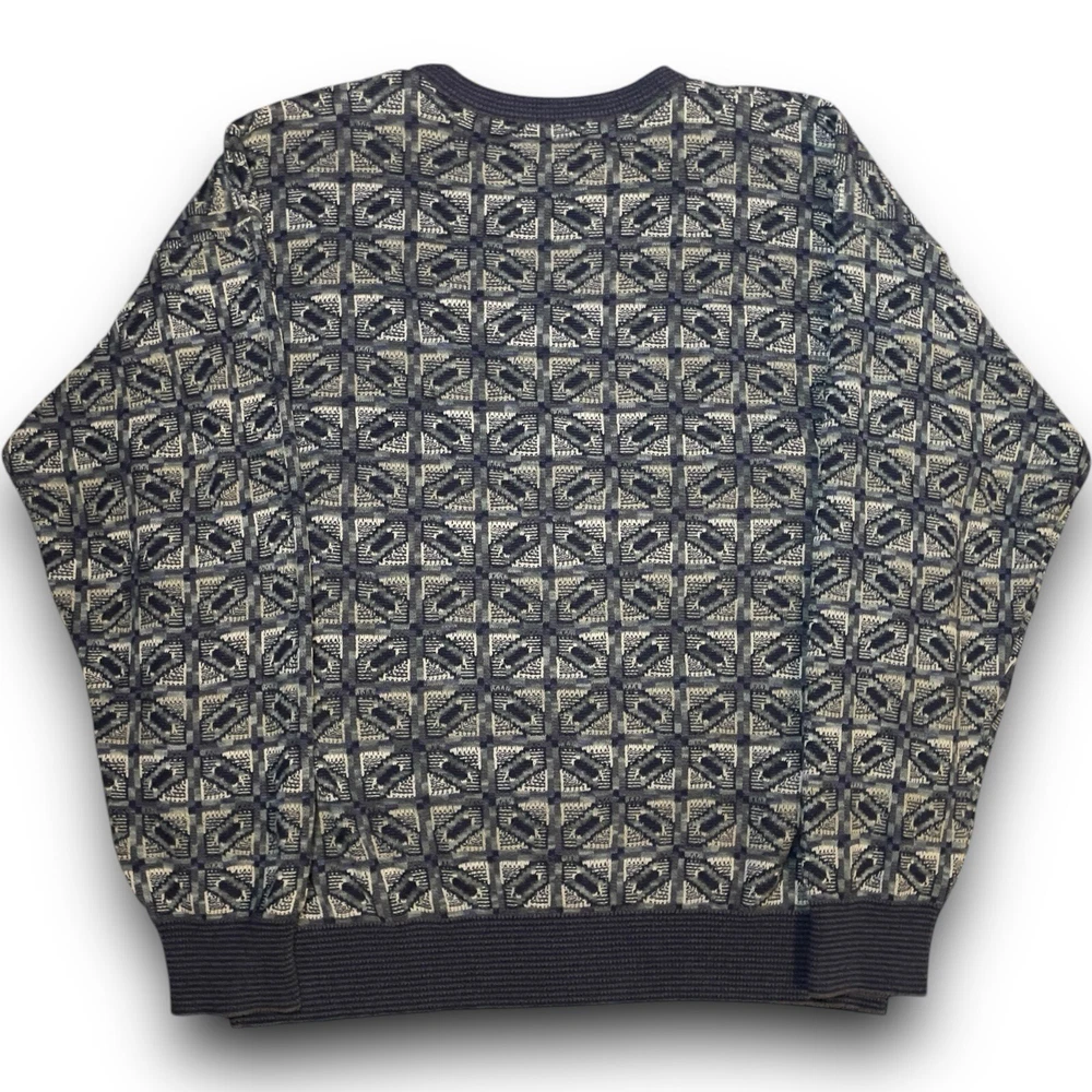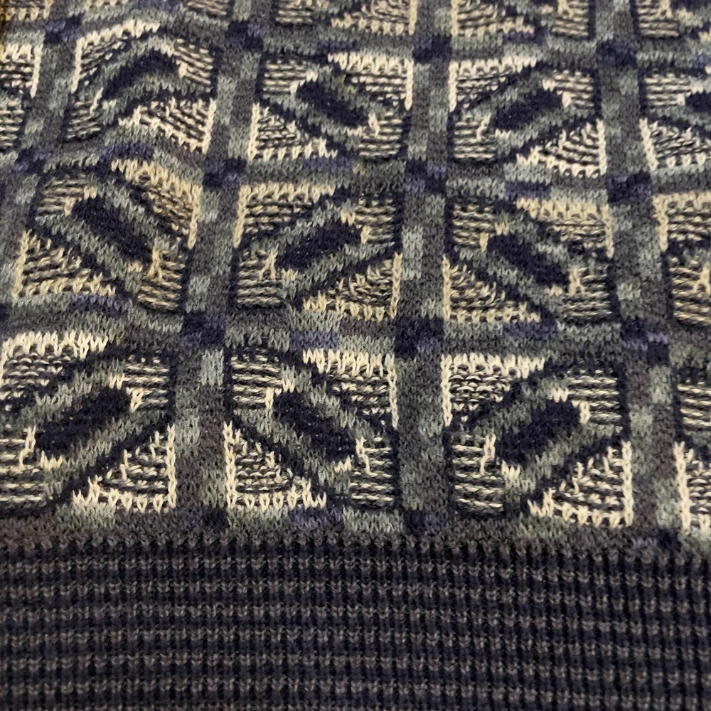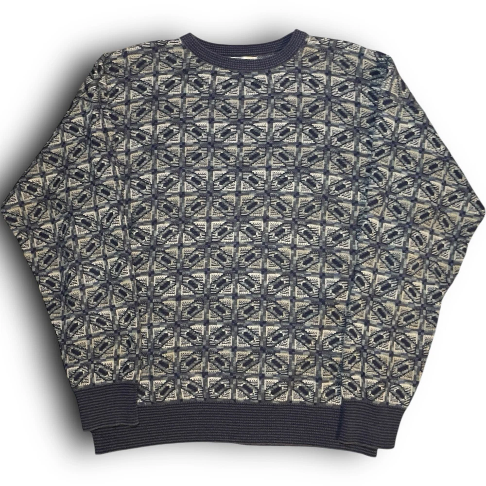 VTG 90s ABSTRACT PRINT PULLOVER SWEATER 🧶 100% cotton | usa made 🇺🇸 Vintage 90s textured knit blue cream sweater multi color pullover sweatshirt featuring long ribbed knit sleeve cuffs, crew neckline & hem with sick allover graphic abstract geometric art to wear print in size xl. Classic retro cozy boxy relaxed fit. It’s giving coogi style vibes. Great pre owned vintage condition. Laid flat: chest 24” length 27” sleeves 23.5” #90s cool fashion #dadcore #grandpa #geometric #boxy