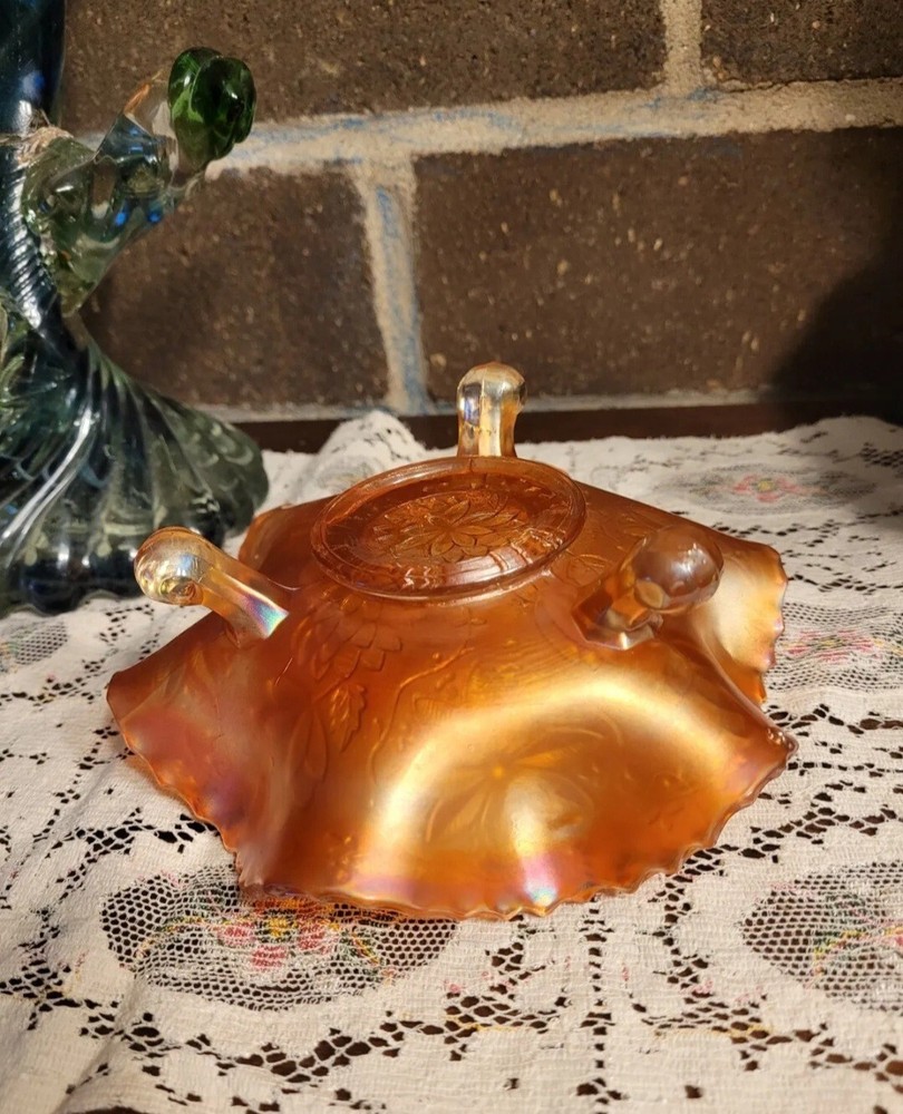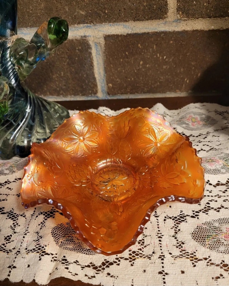 This vintage marigold candy dish features a stunning cardinal design set on a three stand base. Made by Fenton in the 1950s, this original piece is a must-have for any collector of glassware. Measuring 5 inches in diameter, it is perfect for displaying and storing your favorite treats. The dish is in excellent condition and is sure to make a beautiful addition to any home decor.