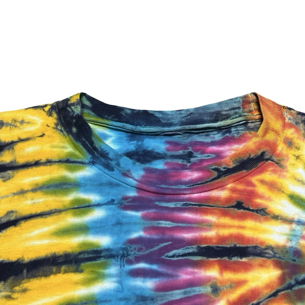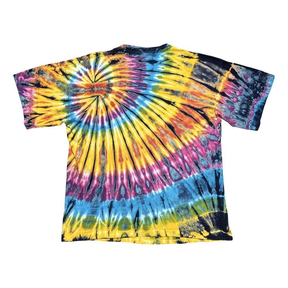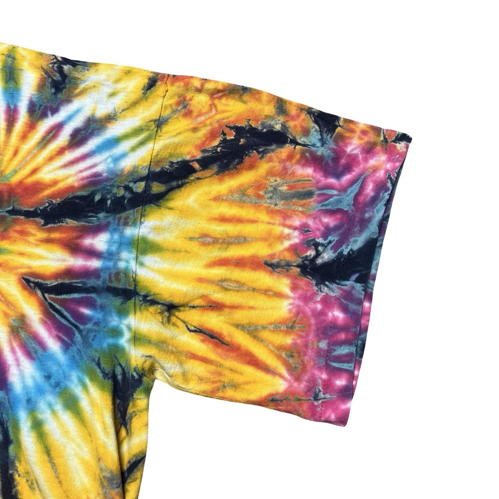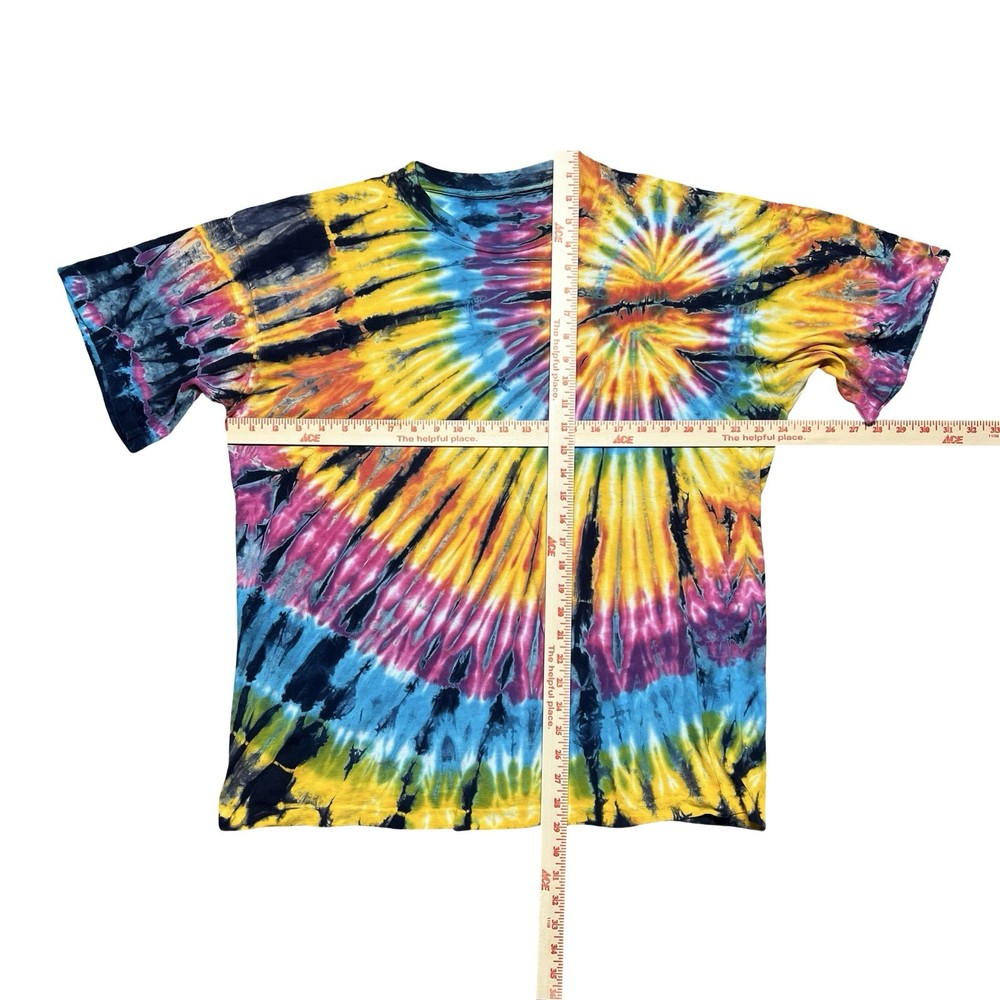 Brand/Subject: Tie dye Item: Short sleeve crewneck shirt with vibrant multicolor spiral rainbow tie dye pattern on front and back. Gender: Mens (unisex style) Estimated size: XL based on fit and proportions (see photos for scale). Design details: Classic T-shirt silhouette, ribbed crew neck, bright psychedelic colors with unique allover tie dye effect, casual festival/hippie style.