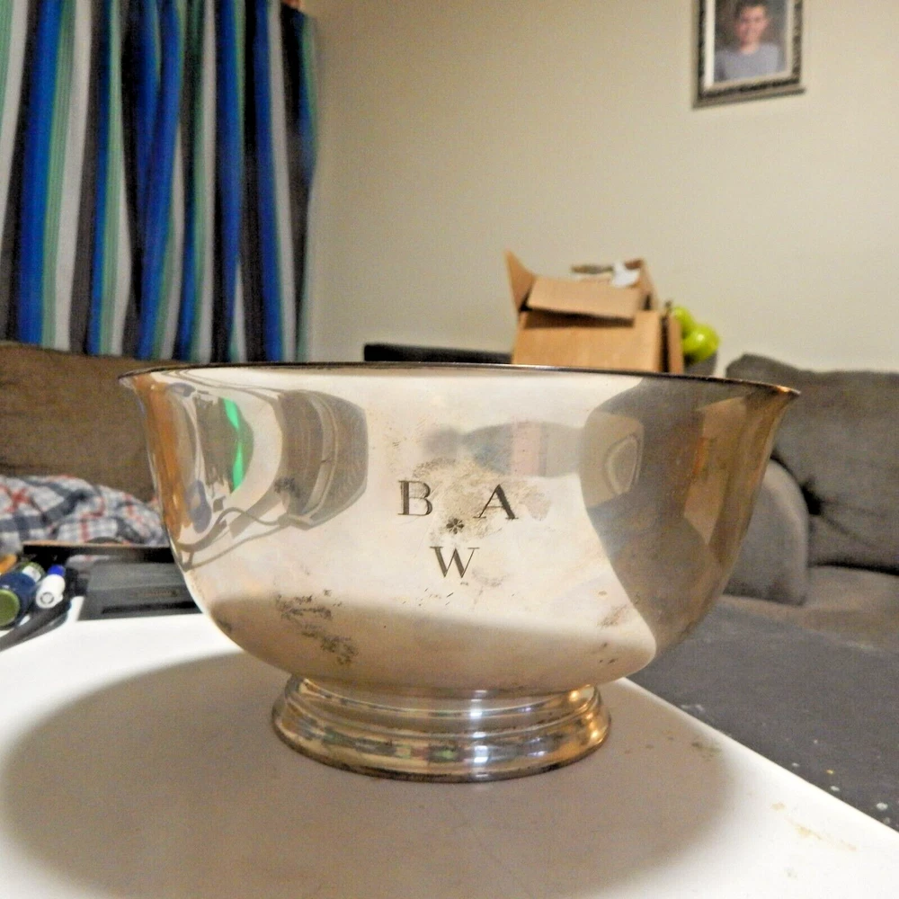 Offered for sale is a vintage bowl made by Tiffany & Co. in the Paul Revere pattern. The bowl is composed of Sterling Silver (.925) and is engraved with the mono "BAW". This item is from the years 1947-1956 and is considered an antique. Perfect for display or use, this bowl is a beautiful addition to any collection.as well as over 15 ounces of Silver