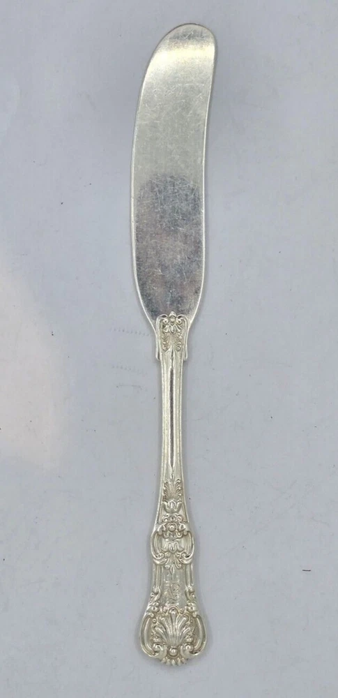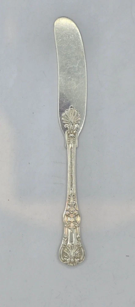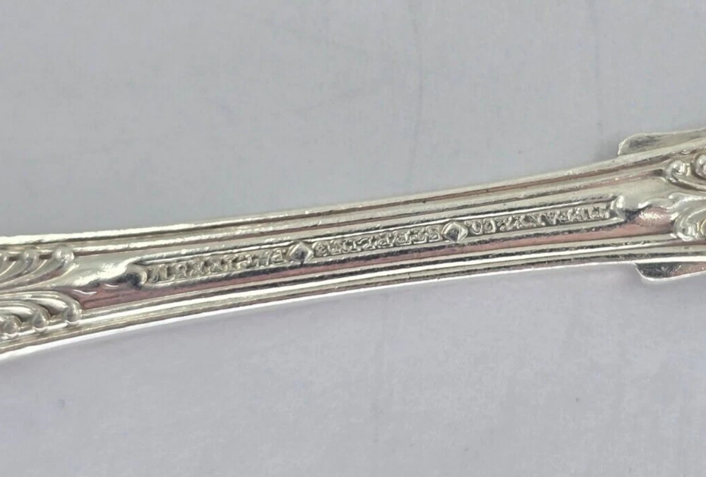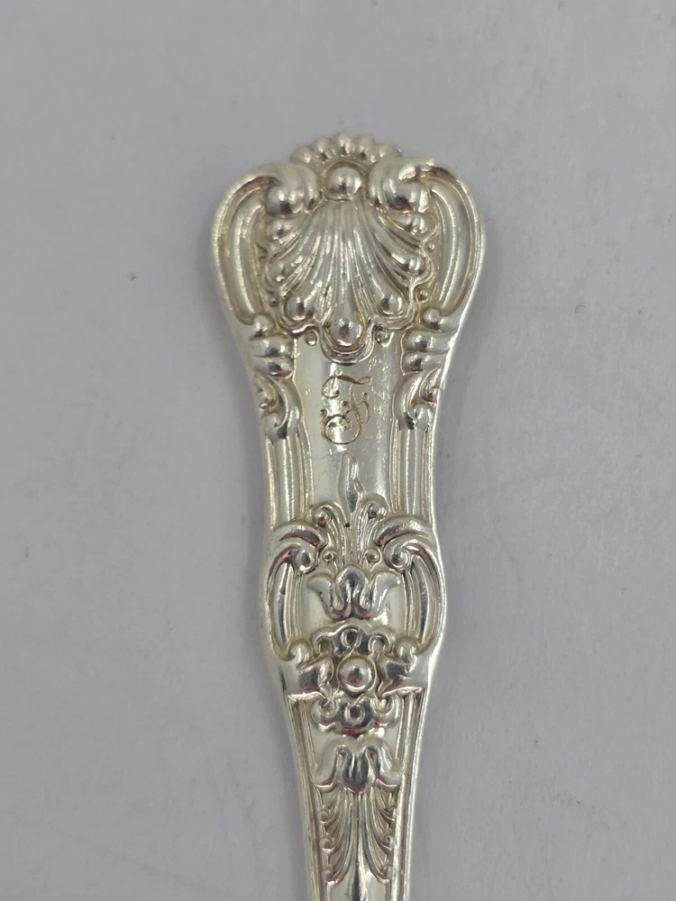 This vintage Tiffany & Co. sterling silver knife features an English king pattern and a flat handle spreader. It is a unique addition to any collection of flatware and silverware. The knife has a length of 5 3/4th" and is composed of .925 sterling silver. The monogram of the knife is F. This antique piece is perfect for those who appreciate the beauty and elegance of silverware. It is a must-have for collectors and enthusiasts alike. Add this exquisite piece to your collection today! This beautiful spoon is a true treasure for any collector or lover of silverware. Crafted by Tiffany & Co. in their classic English King pattern, this spoon is made of high-quality sterling silver and features a stunning bouillon design. Measuring 5 1/8th" in length, it is the perfect size for use or display. The spoon also features a monogram "F" and is part of the Tiffany Sterling Silverware collection. Ideal for those who appreciate antique silverware, this spoon is a timeless piece that will never go out of style. HT12034 Item As Is. All stones not identified unless clarified above. All items are pre-owned and pre-loved. Stones may show minor nicks and abrasions or small signs of wear. Diamonds are graded using GIA standards by GIA Graduates. Diamond and gemstone weight is estimated by formula. The metal is stamped or identified by acid testing and/or XRF alloy analyzer gun. All items shipped USPS First Class, Signature Required Items over $1000 ship overnight, Signature Required Please message with any questions. We are available Monday through Saturday 10am to 6pm.